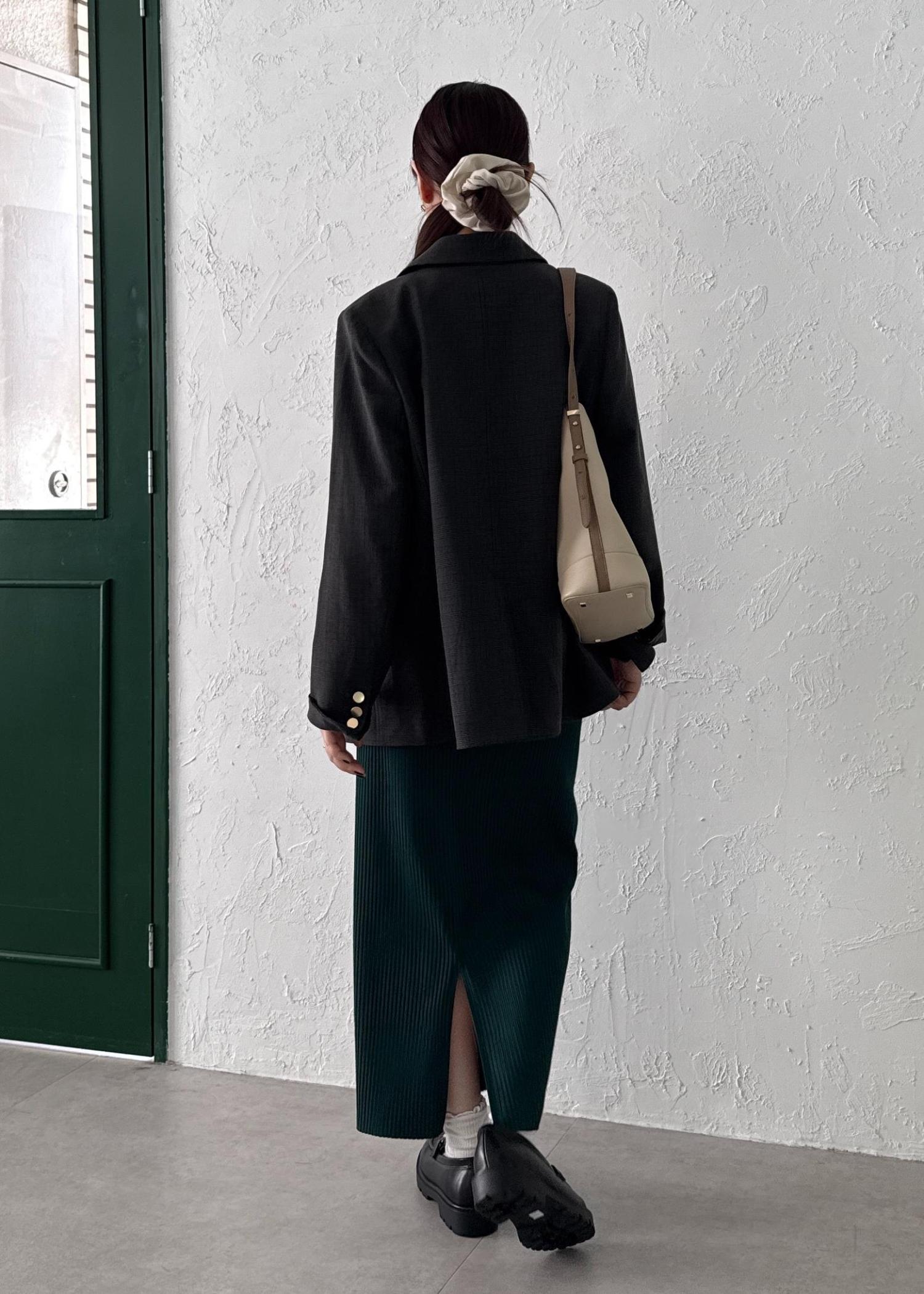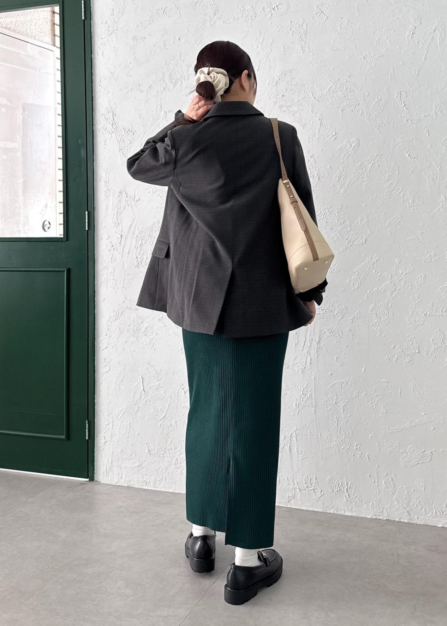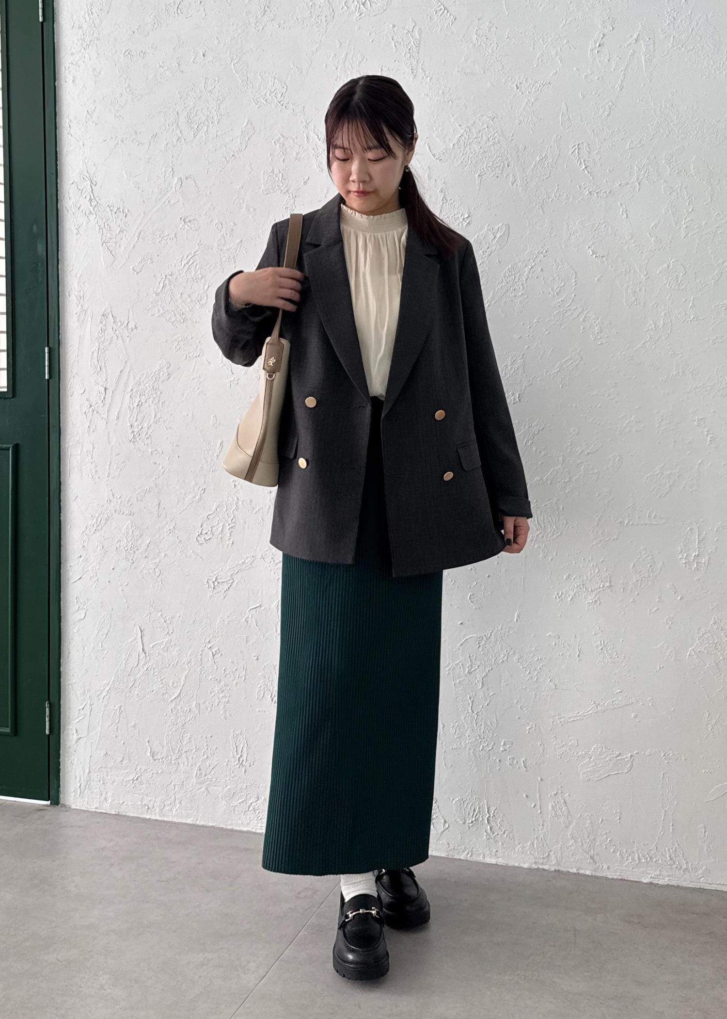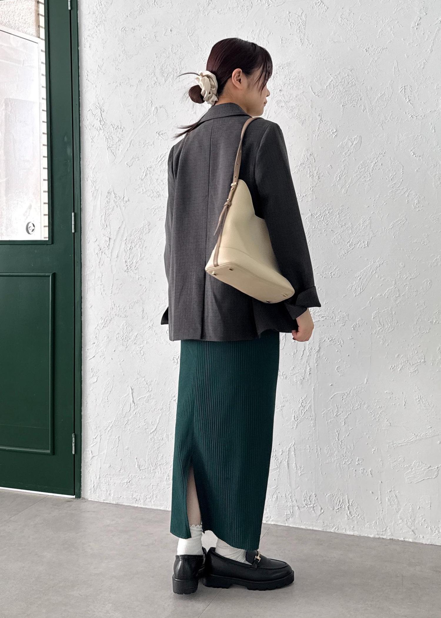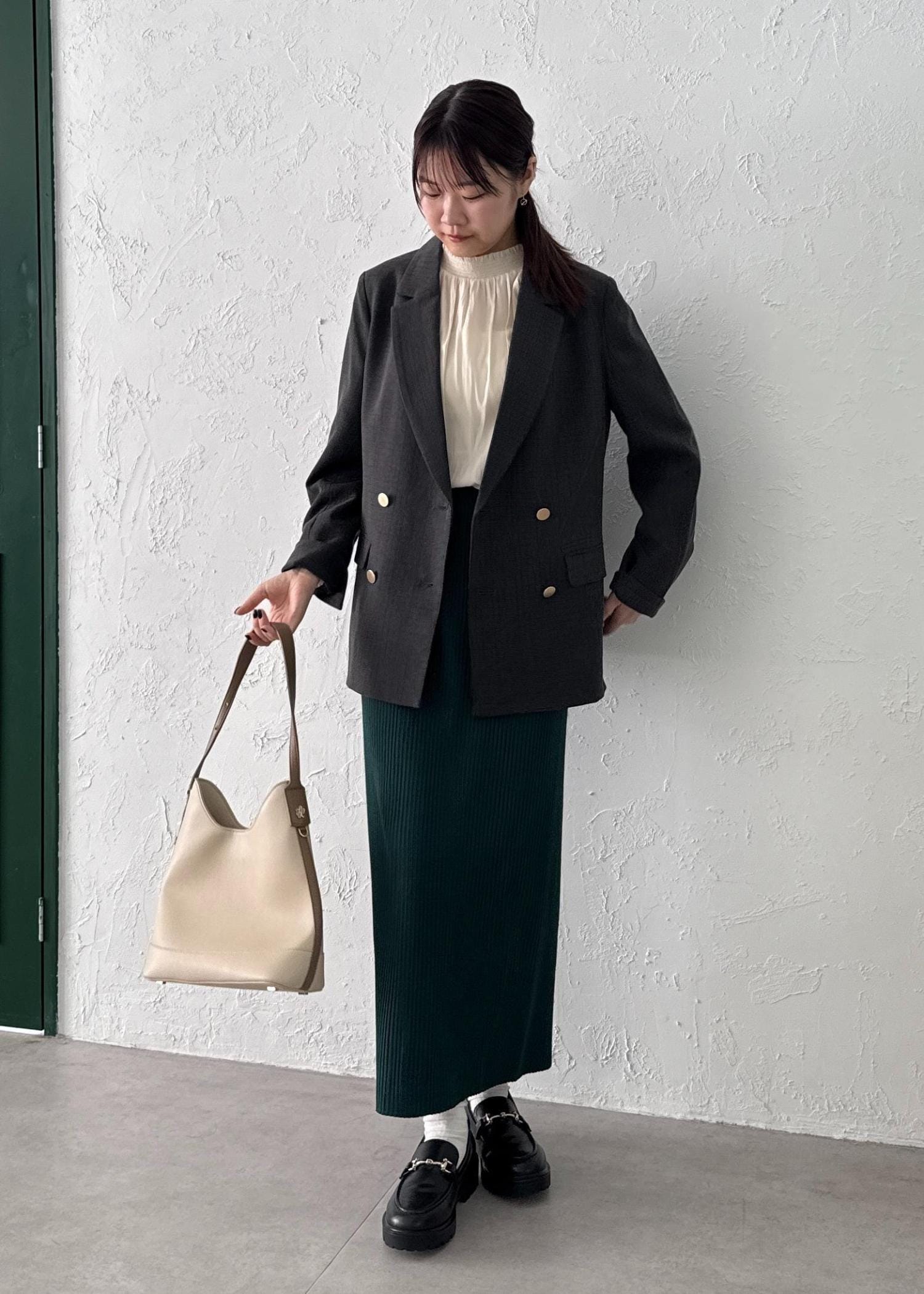 秋らしい色味のグリーンスカートにジャケットを合わせた、きれいめなコーディネートです。