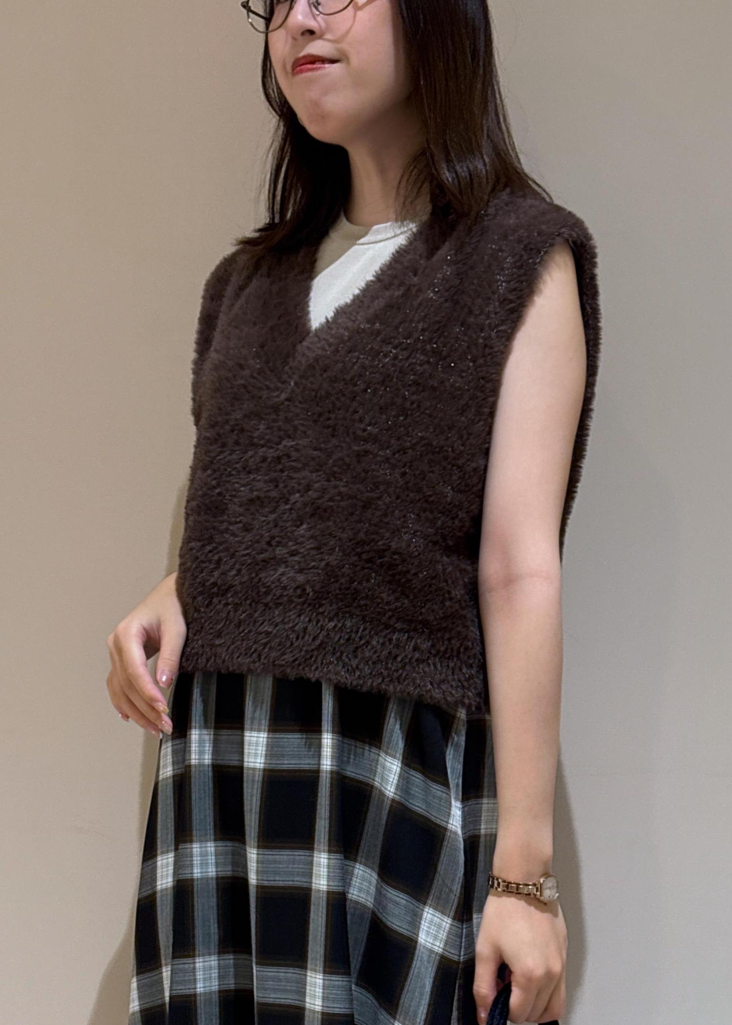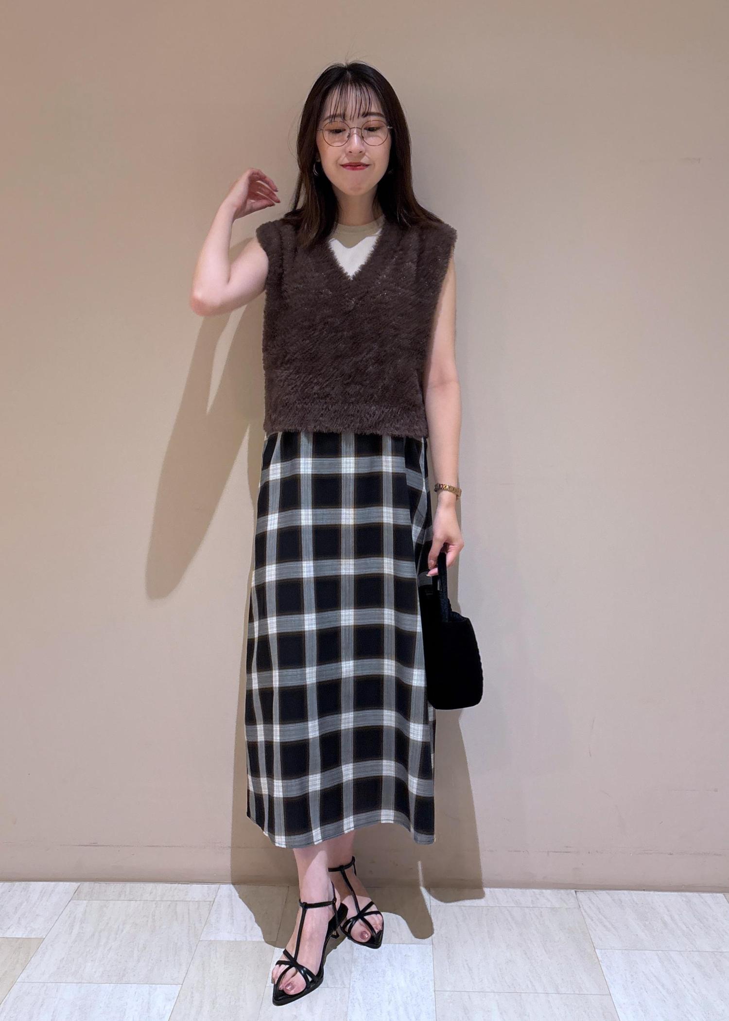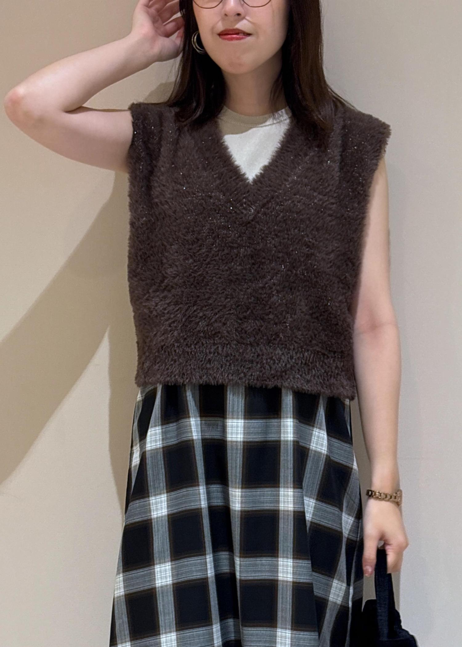 キャミワンピースのチェック柄の配色に合わせてブラウンのフェザーベストを選びました。