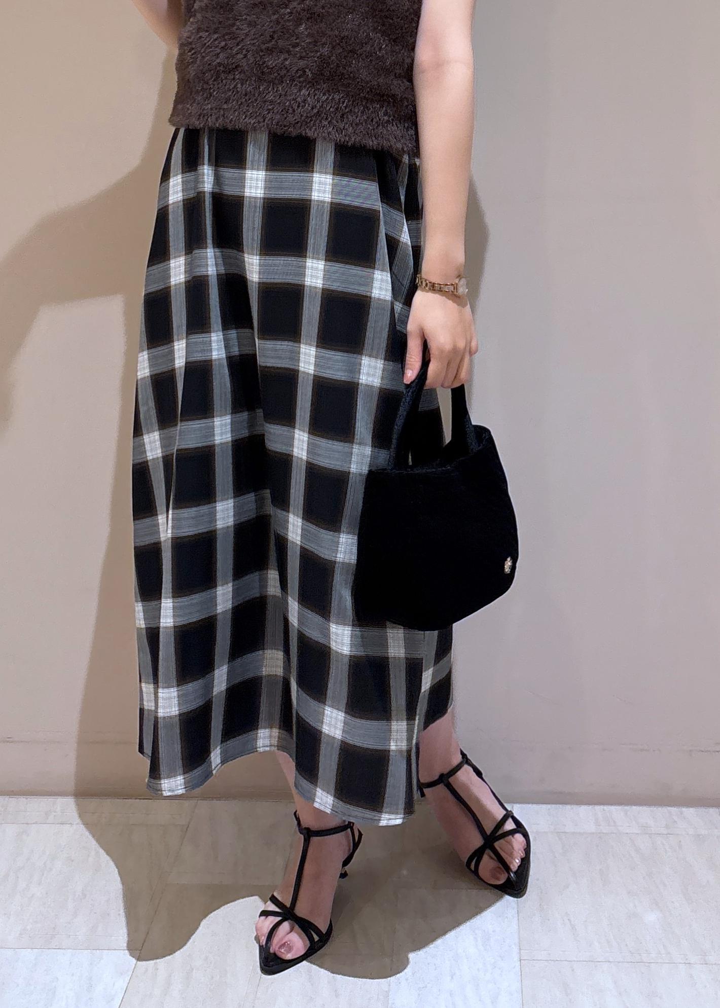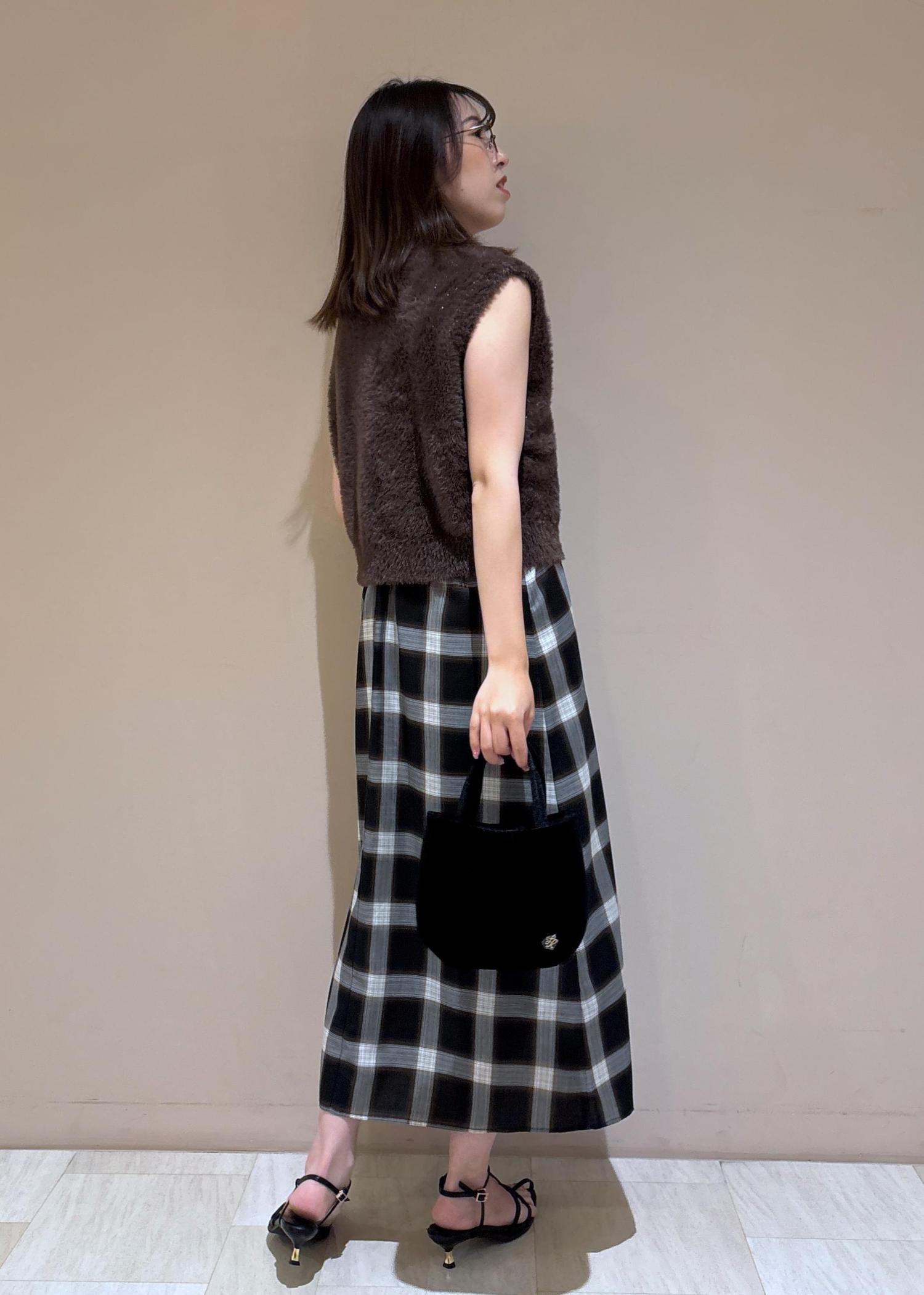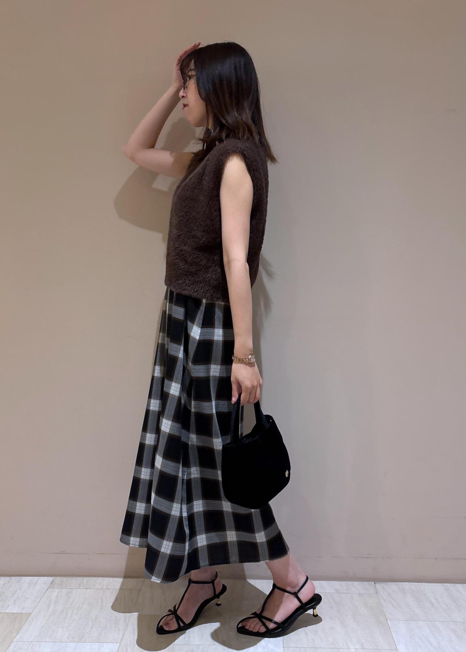 キャミワンピースのチェック柄の配色に合わせてブラウンのフェザーベストを選びました。