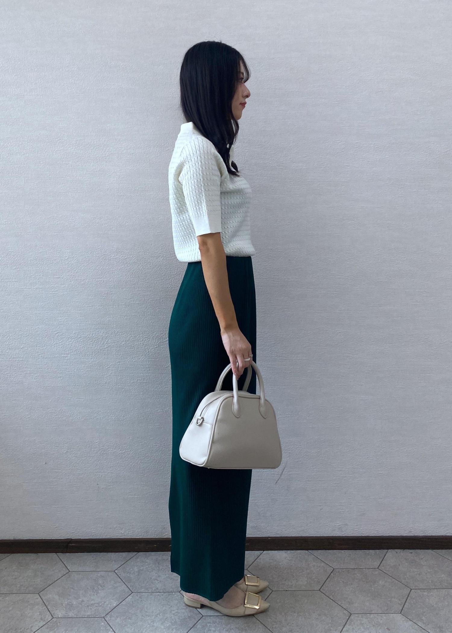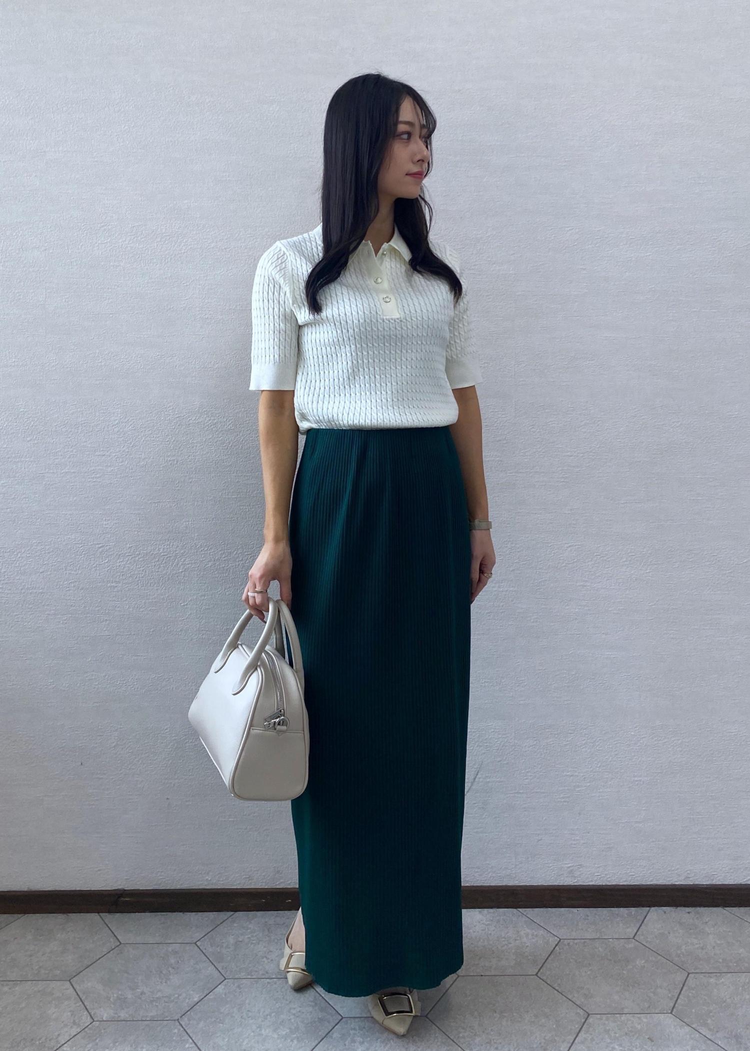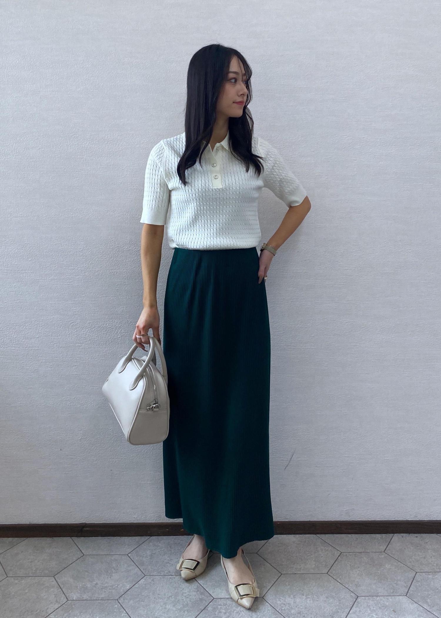 上品でコンパクトシルエットに仕上げたポロ襟ニットにグリーンが映えるスカートを合わせたお出かけにぴったりなコーディネートです。