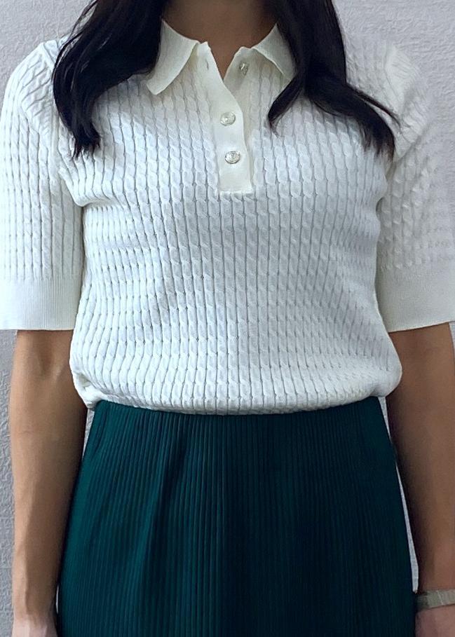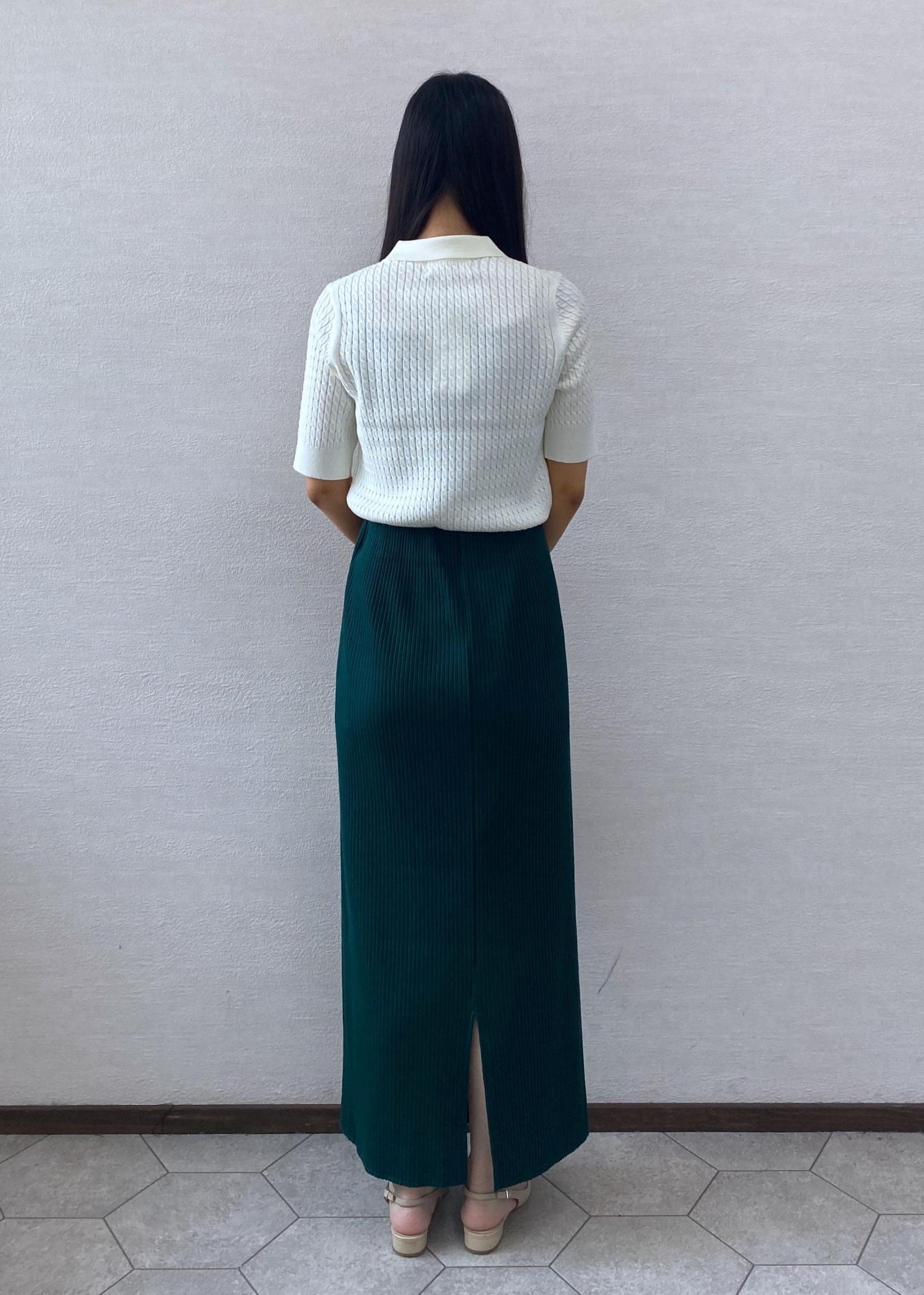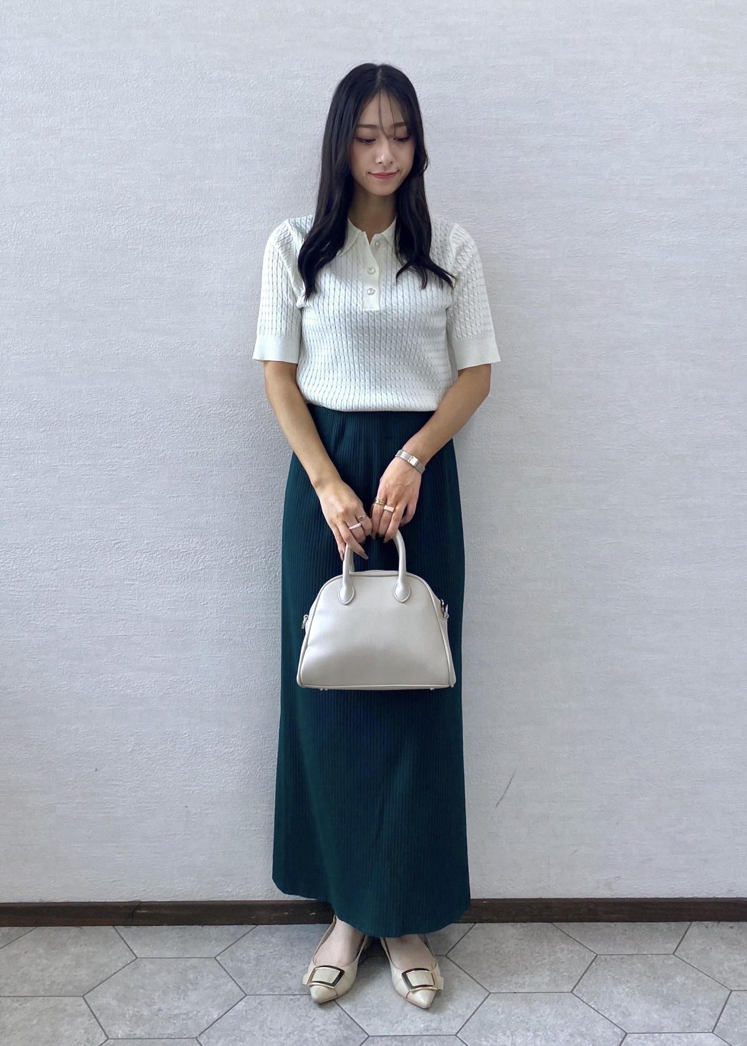 上品でコンパクトシルエットに仕上げたポロ襟ニットにグリーンが映えるスカートを合わせたお出かけにぴったりなコーディネートです。