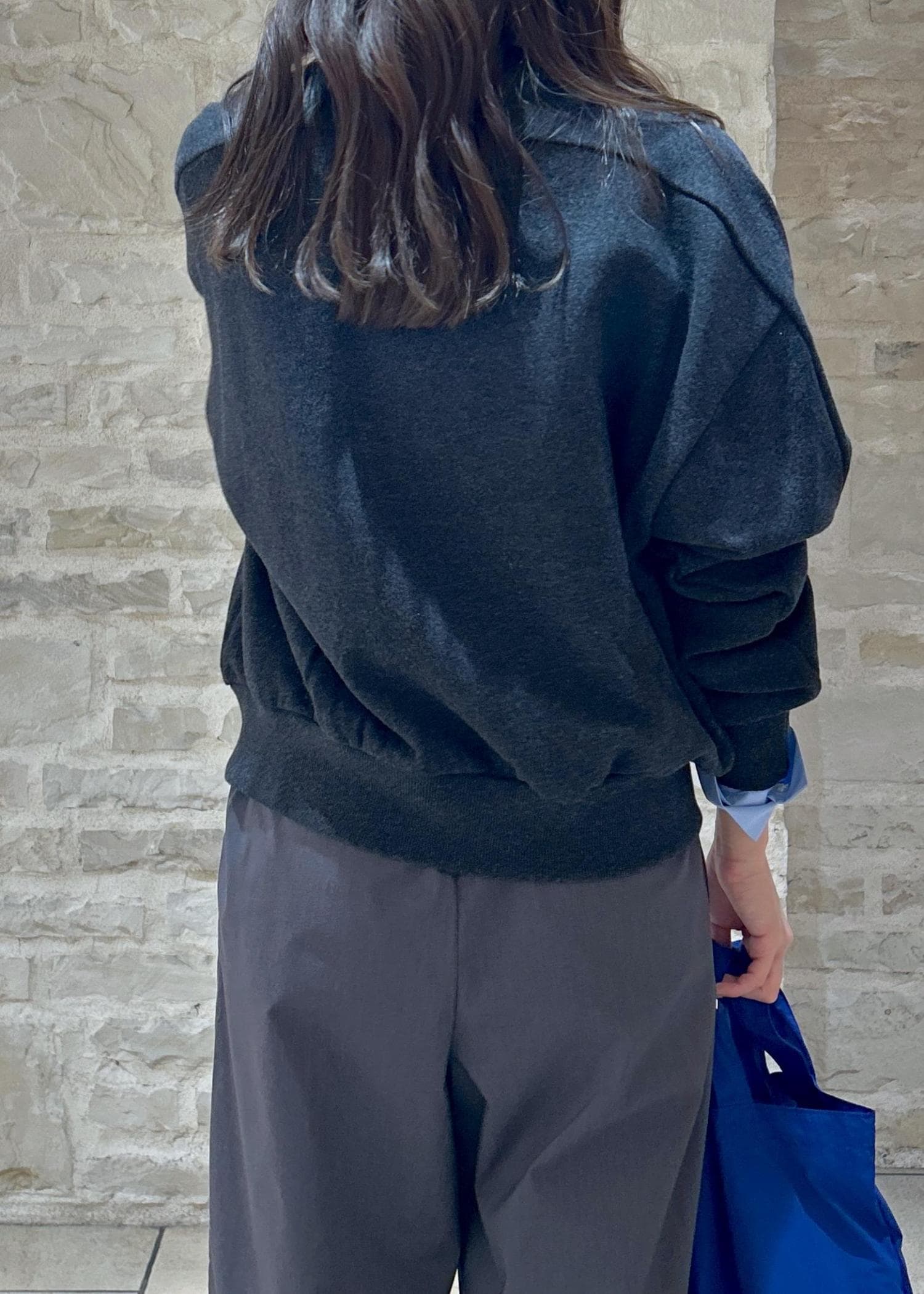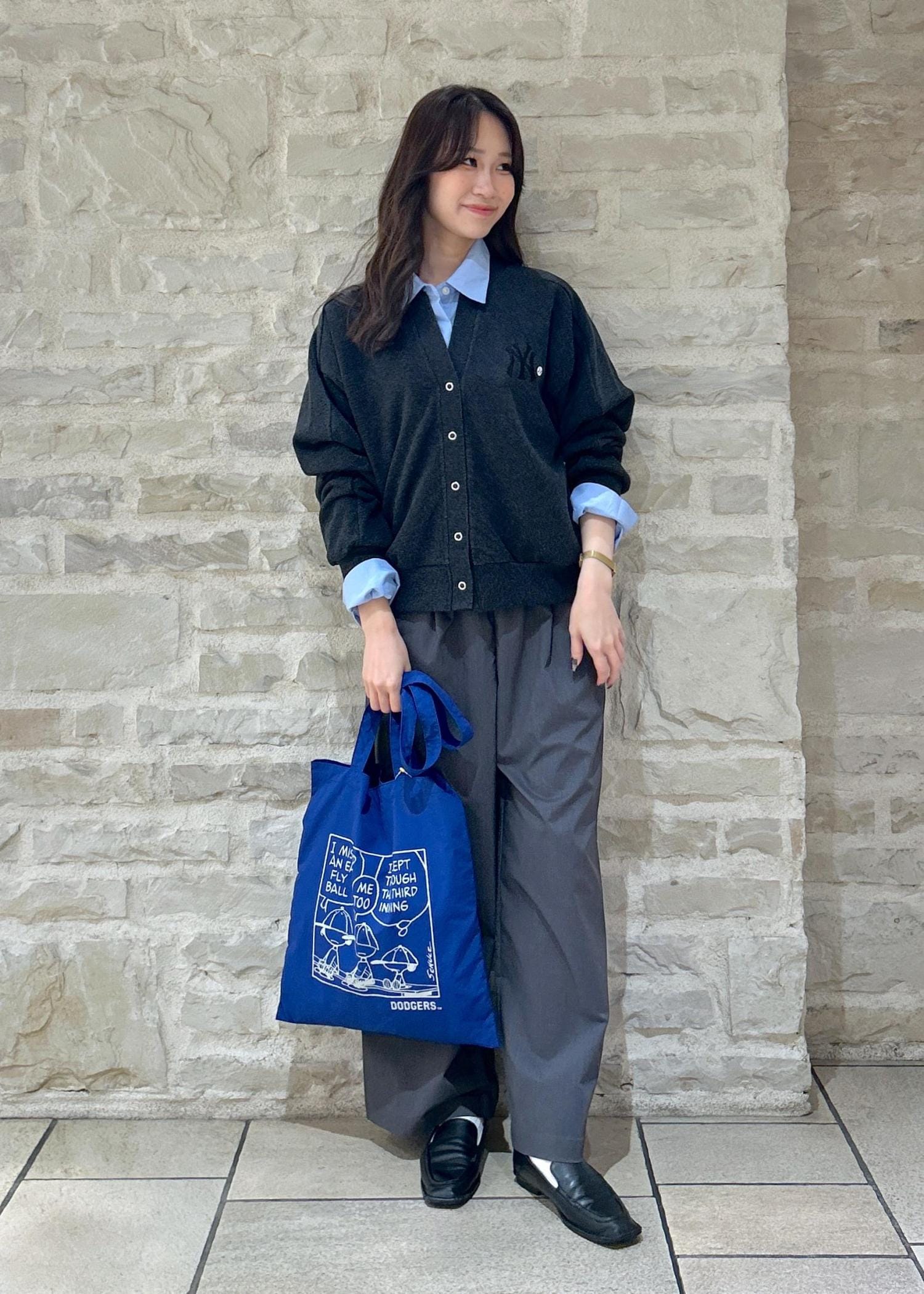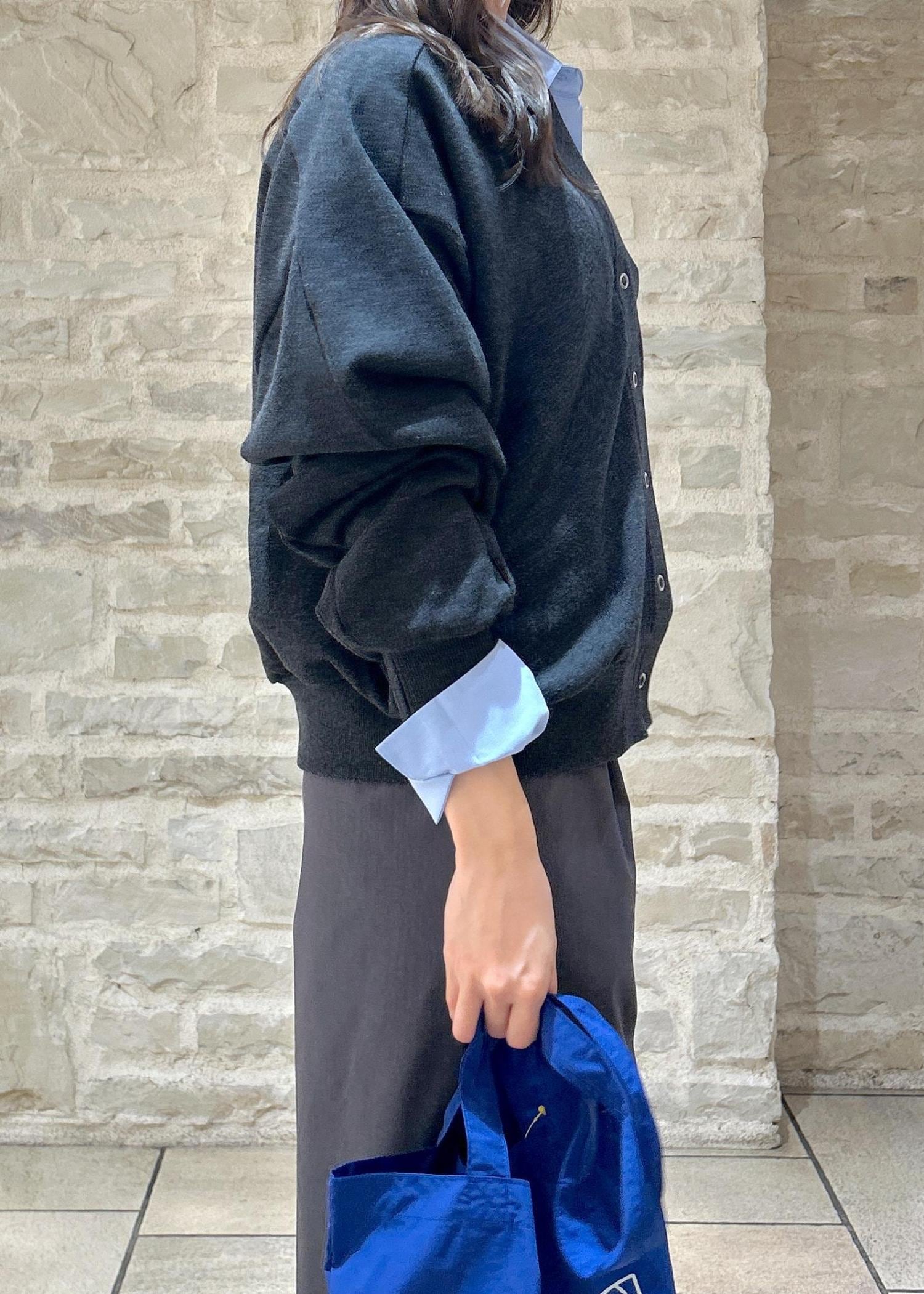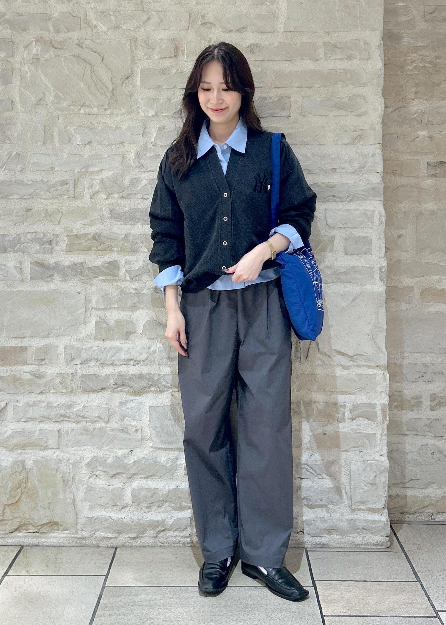 グレーのカーディガンにブルーのシャツをレイヤードしてカジュアルな秋冬スタイリングにしました。