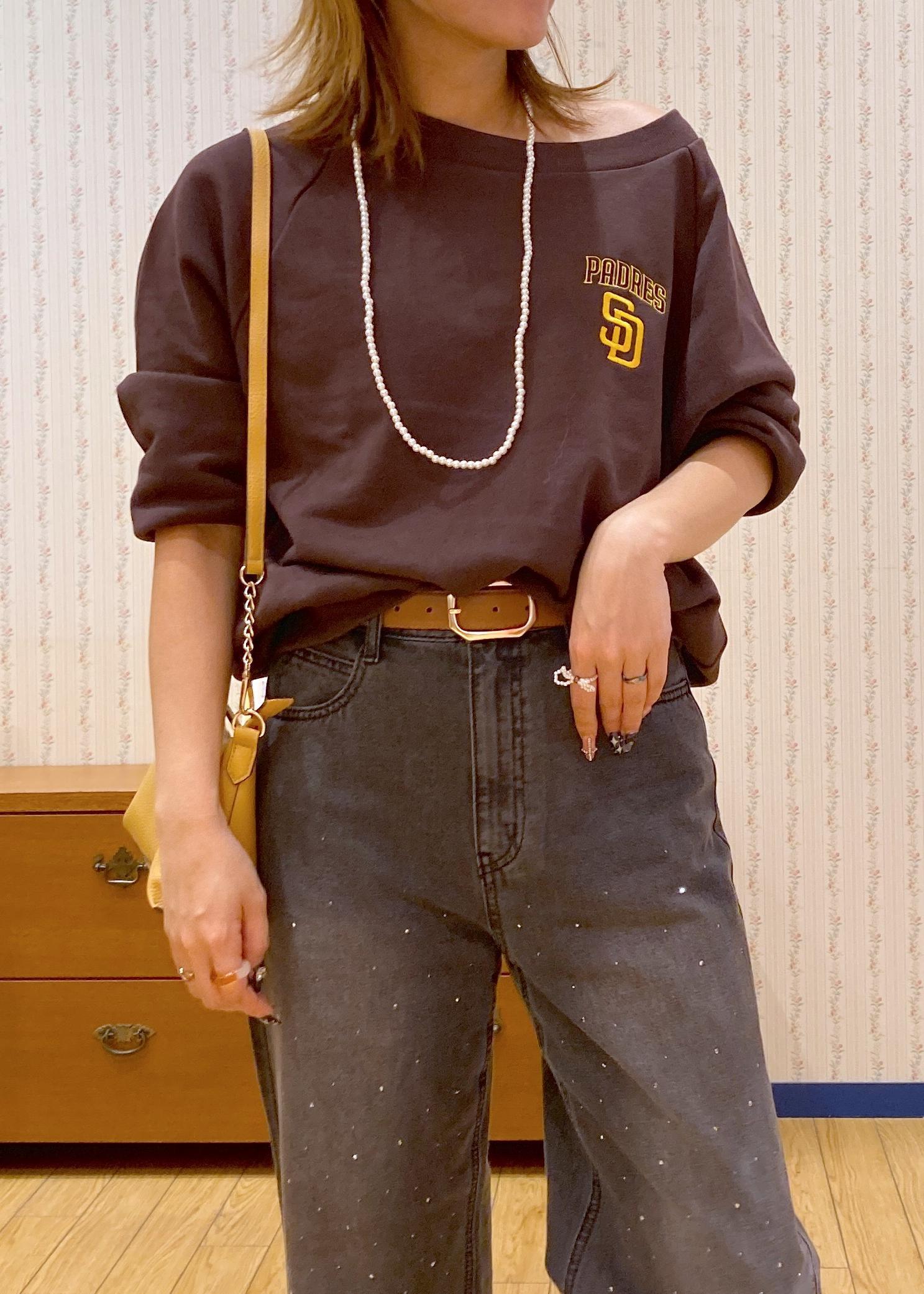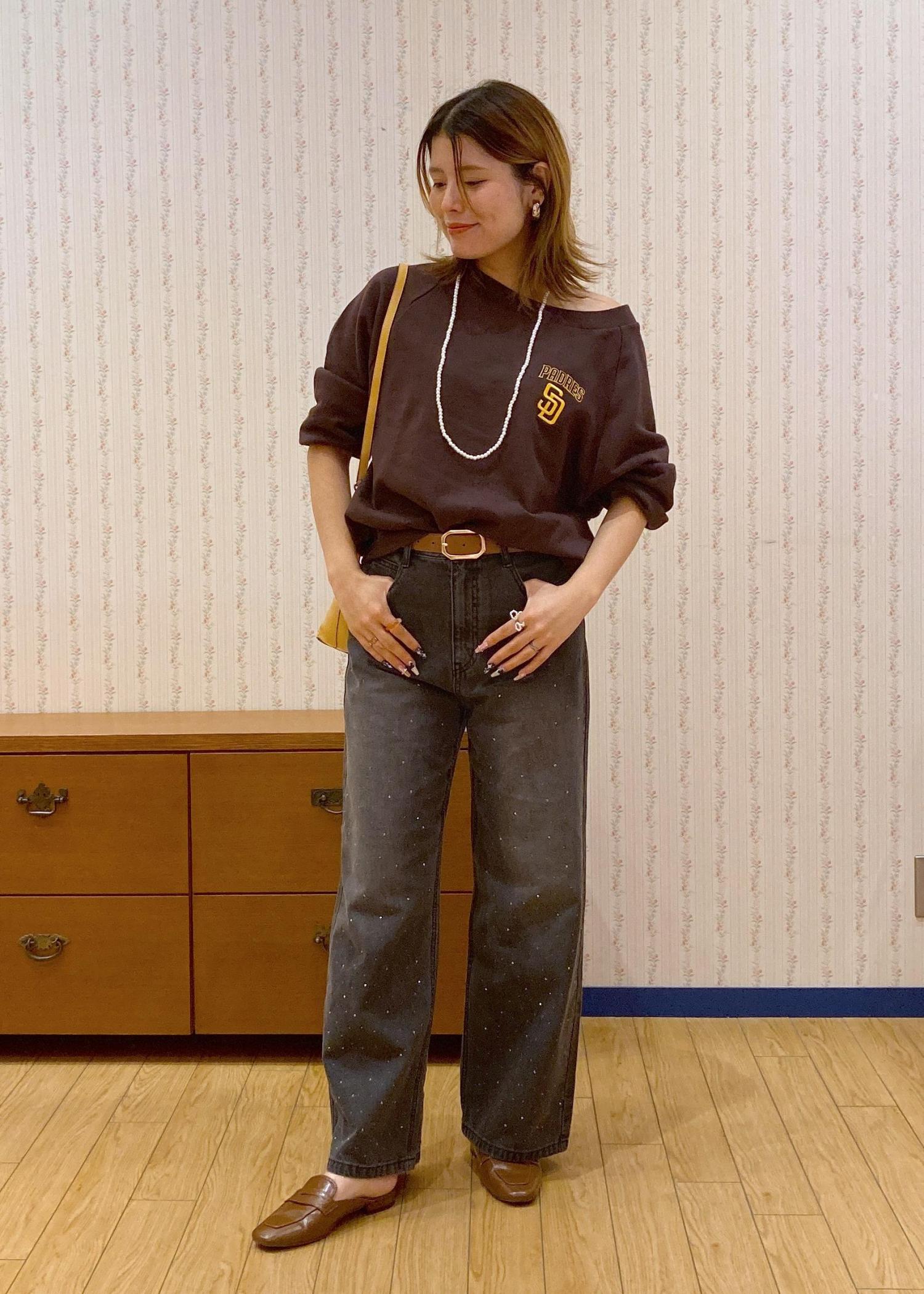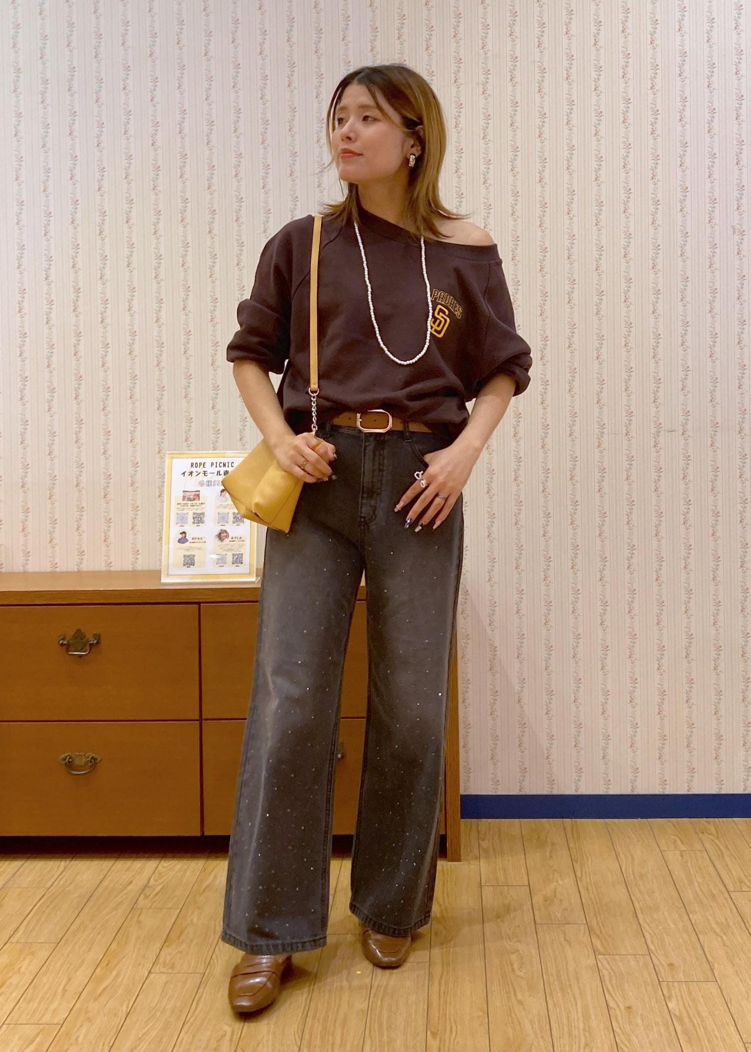 ブラウンのオフショルスウェットはワンショルダーで着用し、女っぽさを取り入れたのがポイントです!