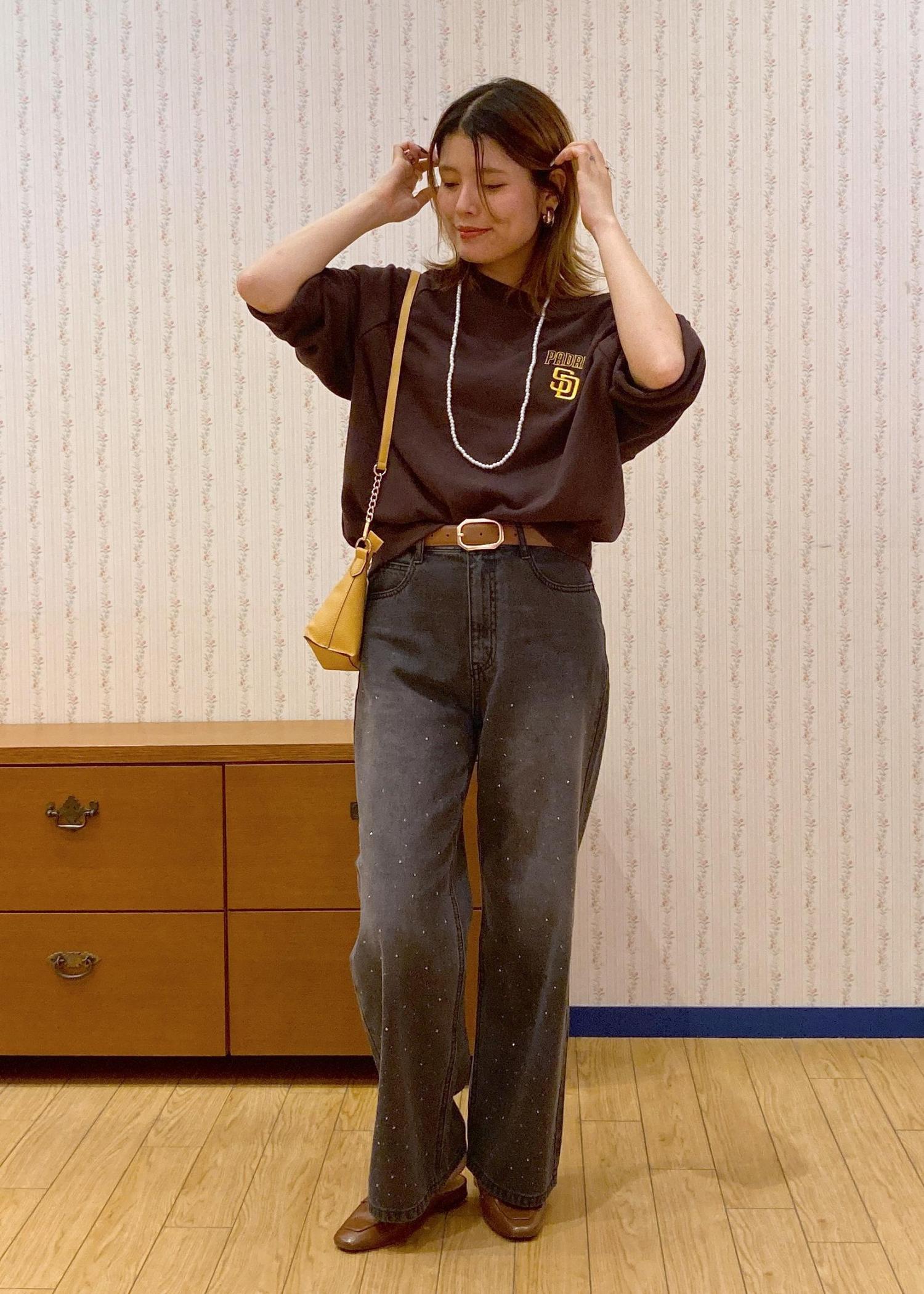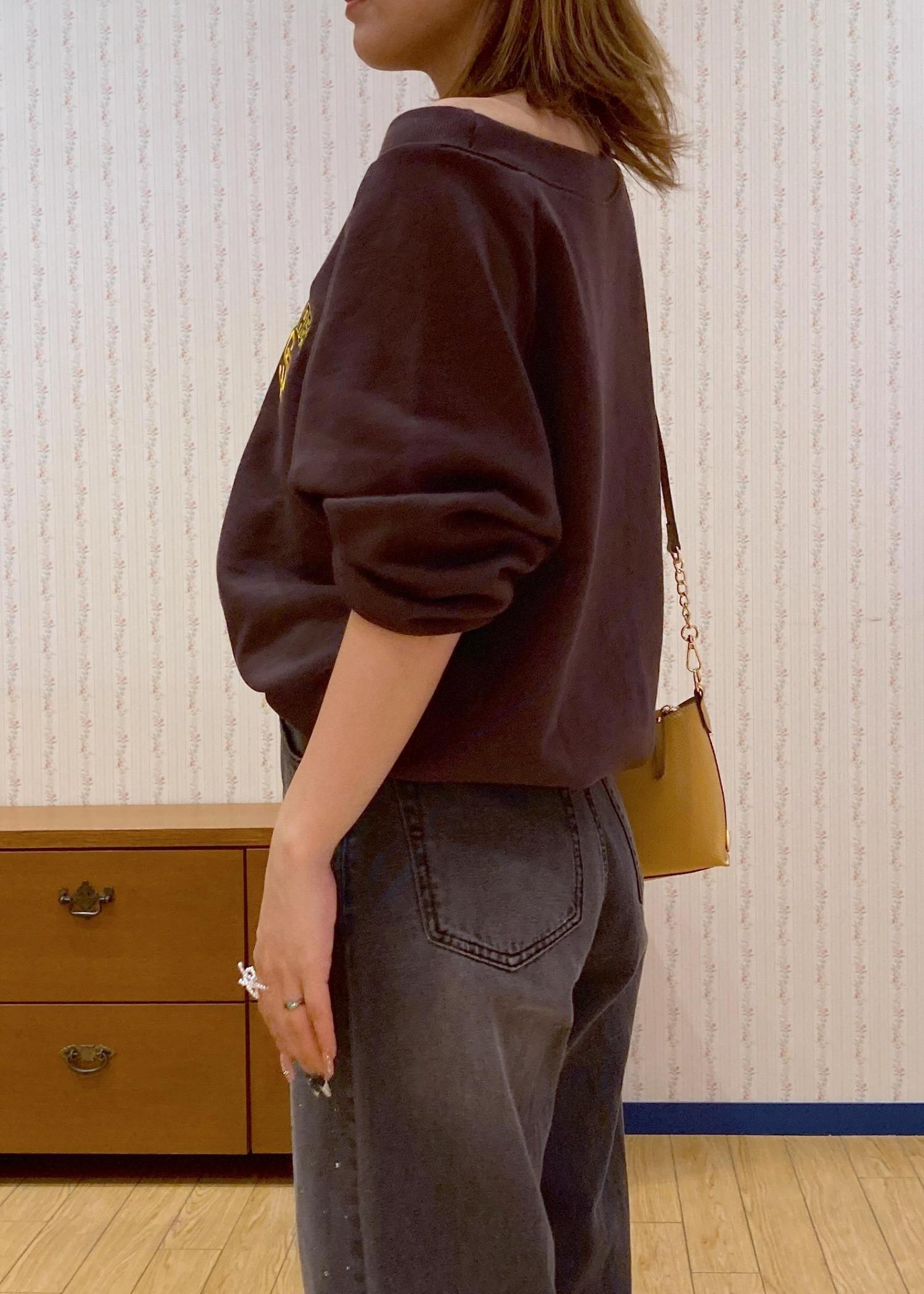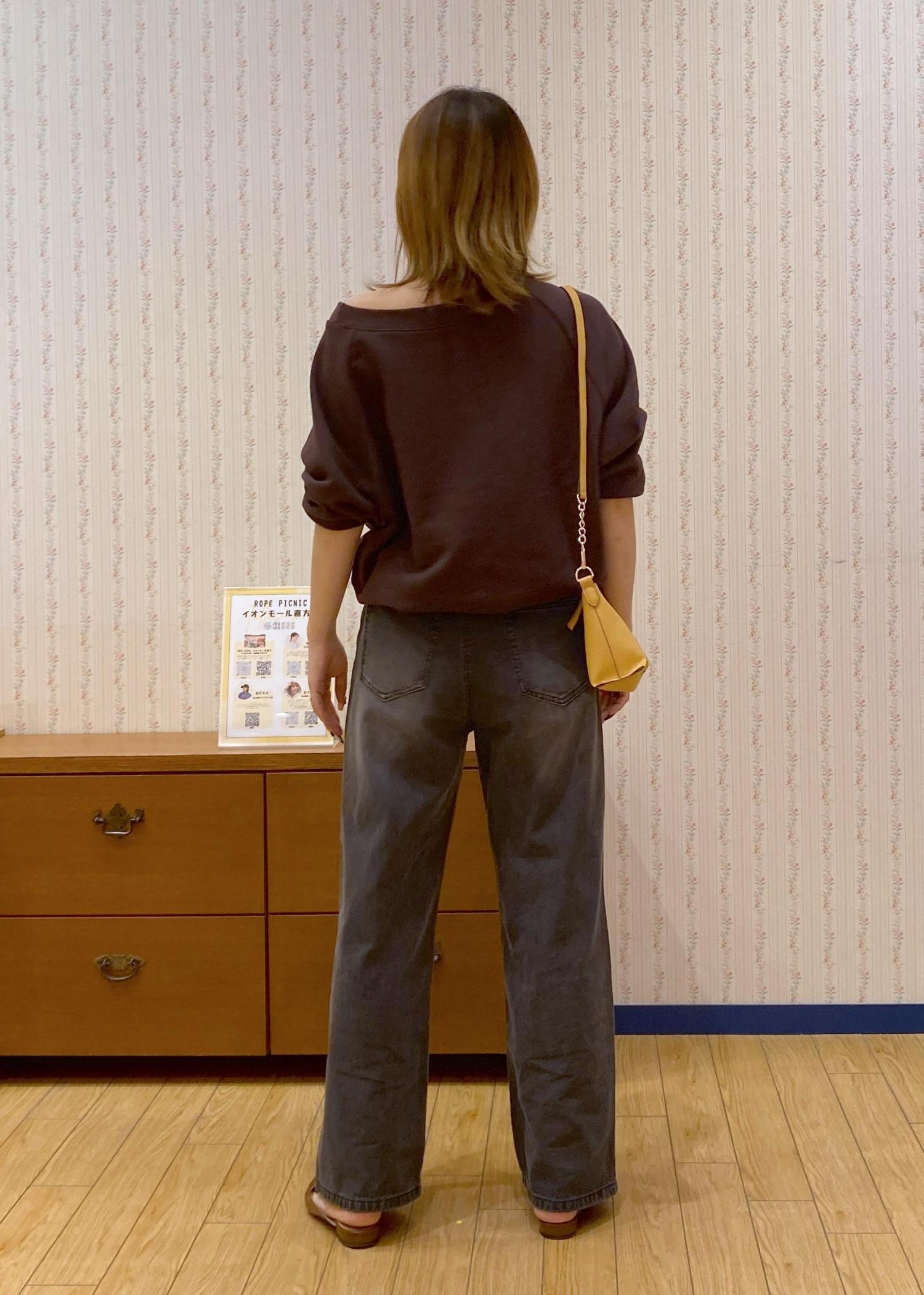 ブラウンのオフショルスウェットはワンショルダーで着用し、女っぽさを取り入れたのがポイントです!