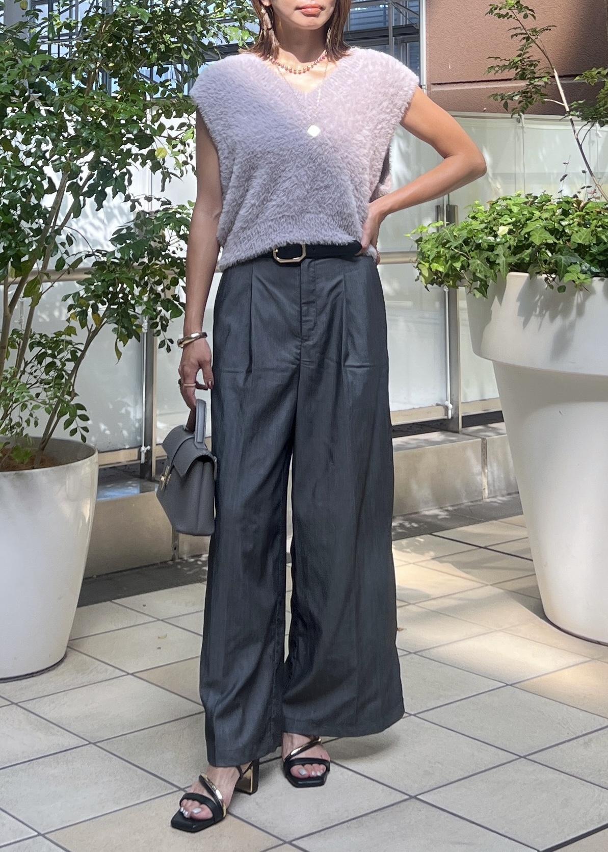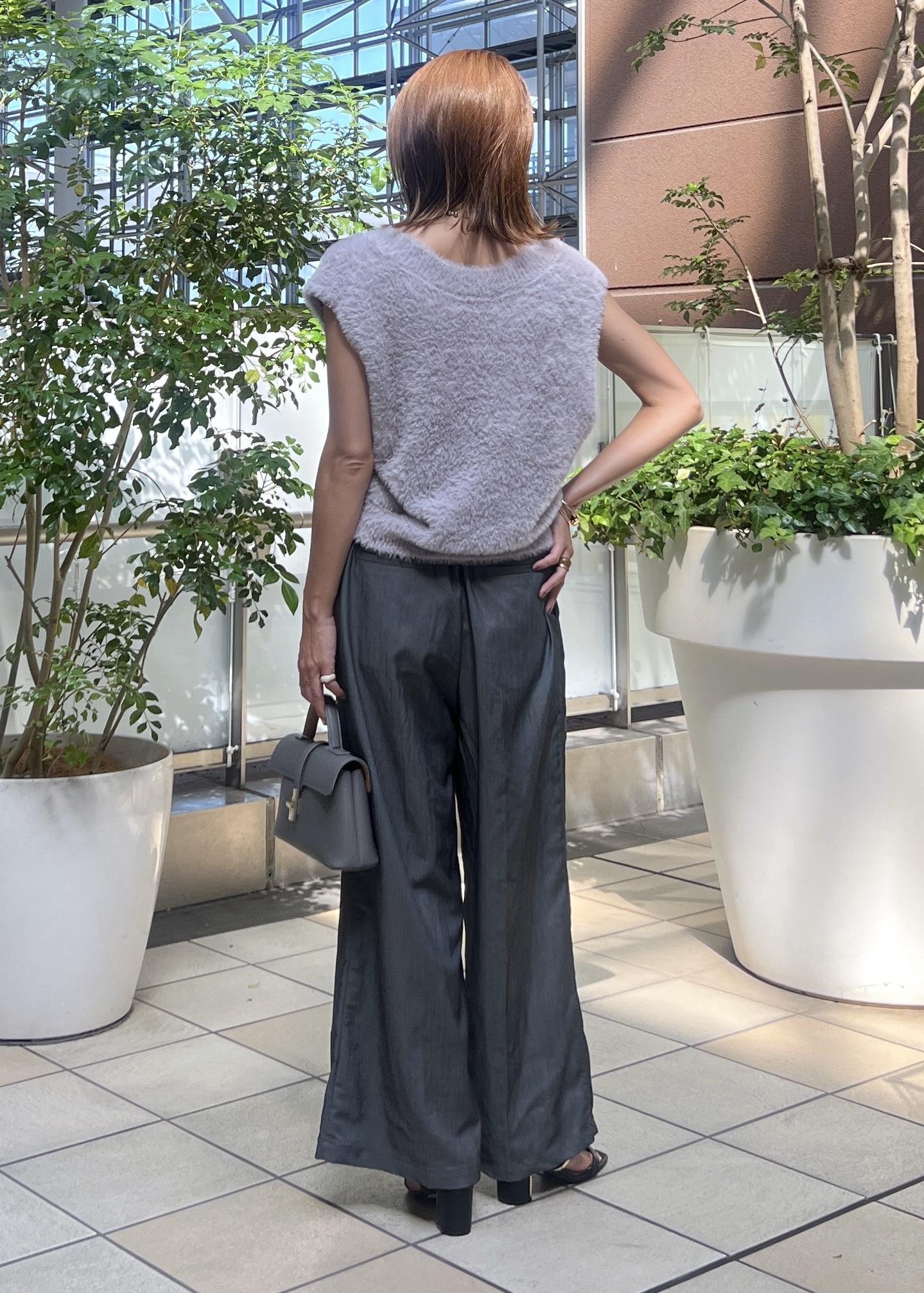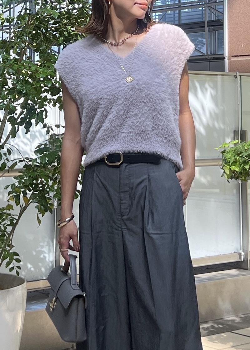 柔らかくふわふわした肌触りのフェザーベストは、タックパンツで大人カジュアルなスタイリングに。