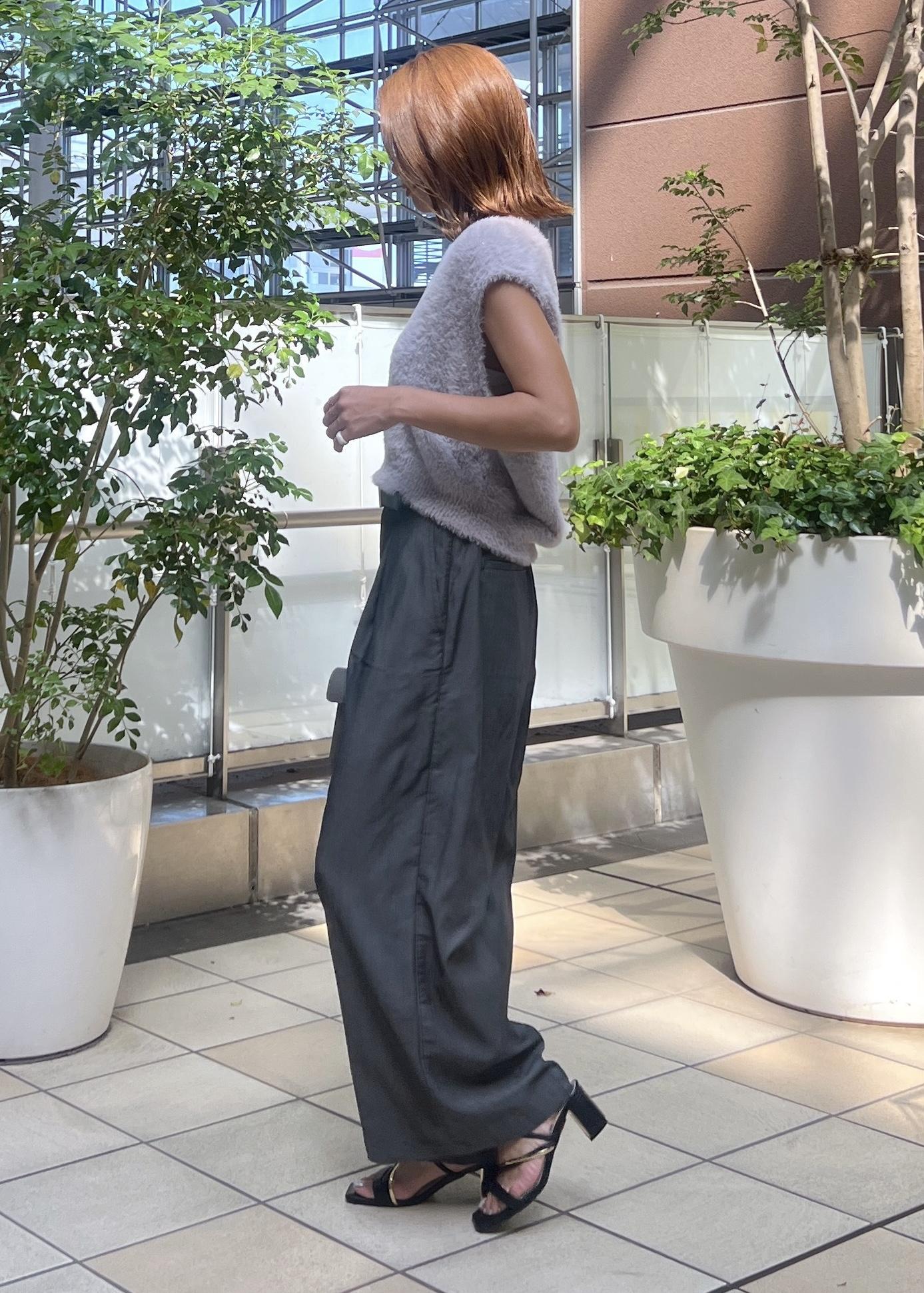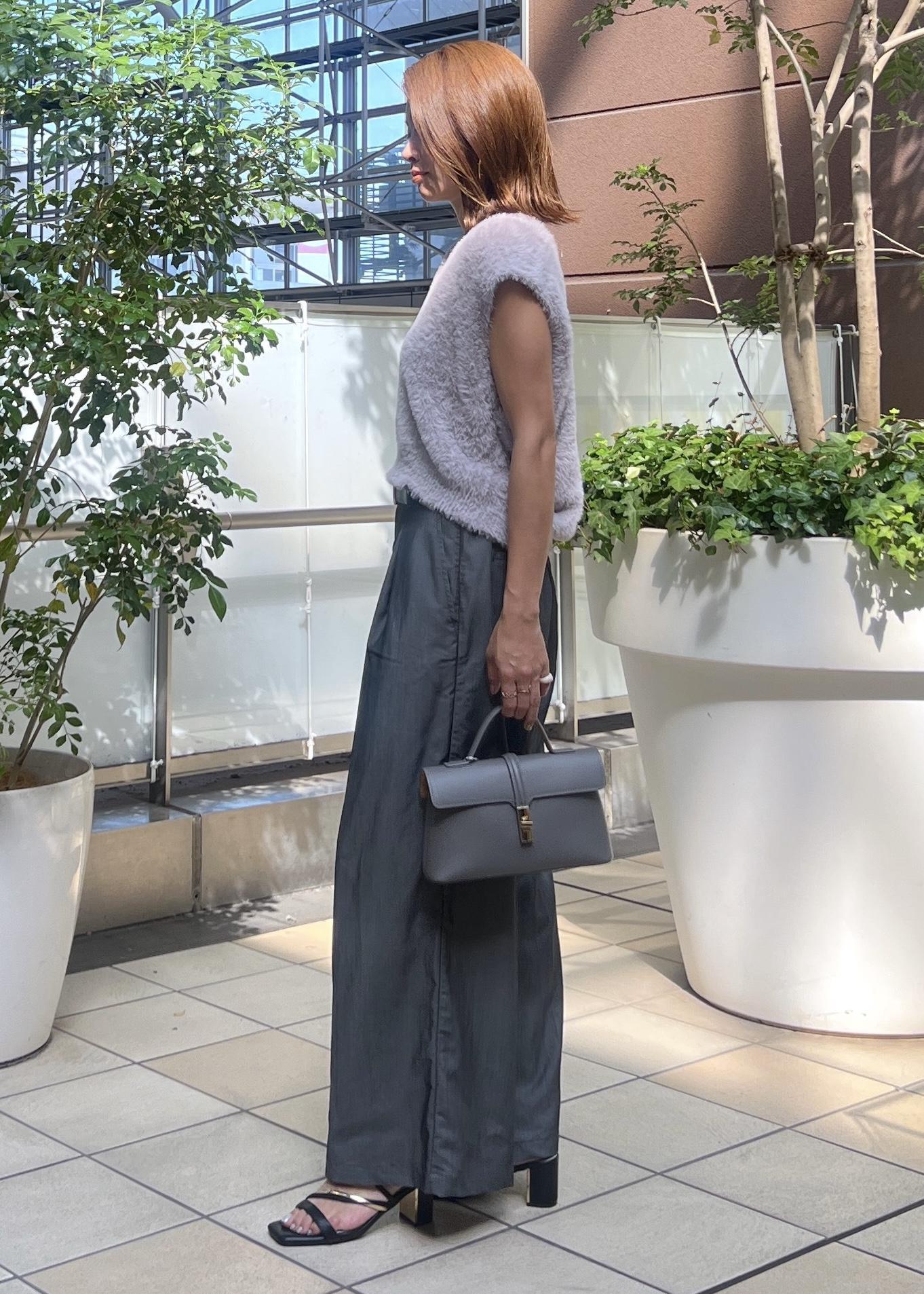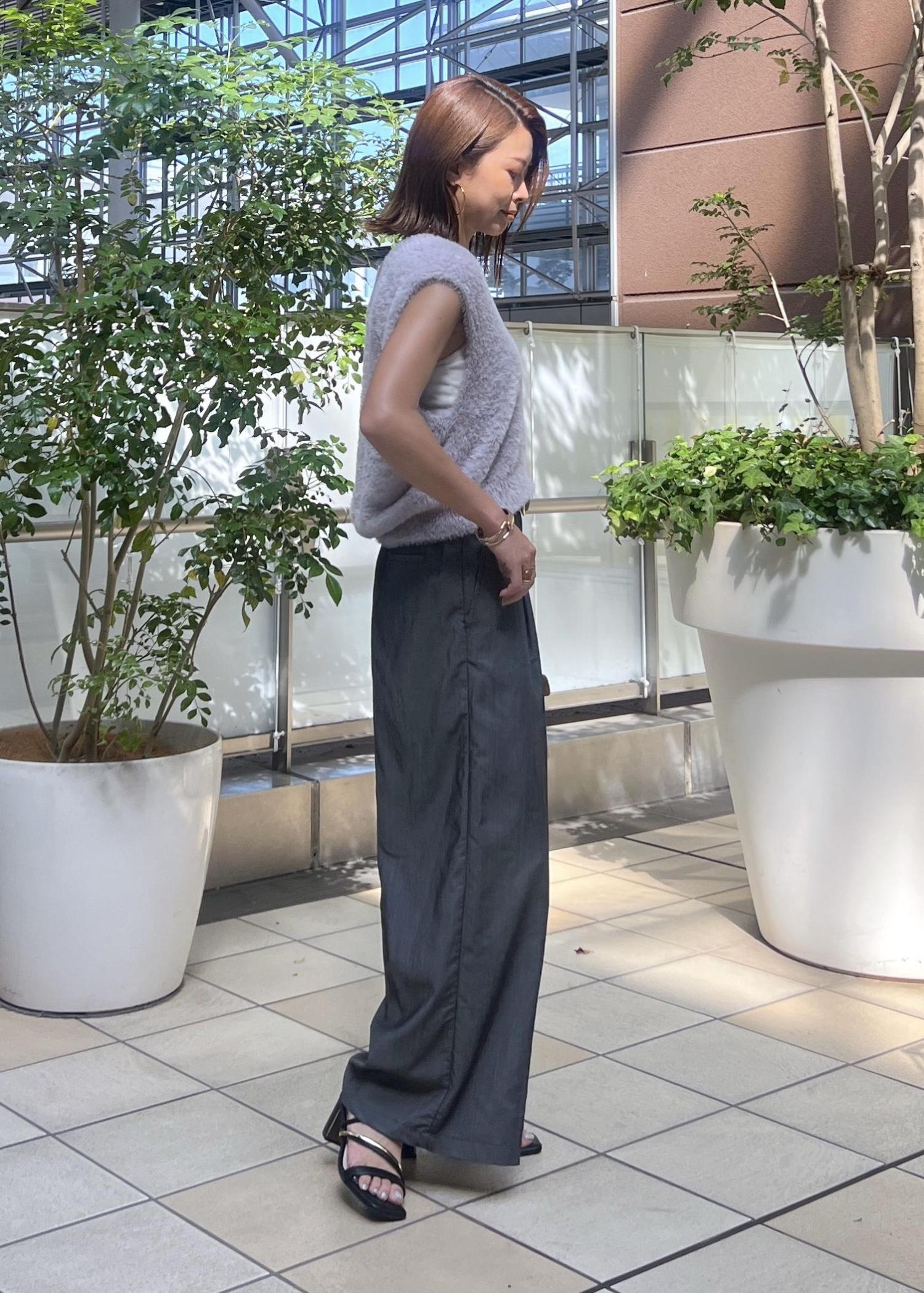 柔らかくふわふわした肌触りのフェザーベストは、タックパンツで大人カジュアルなスタイリングに。