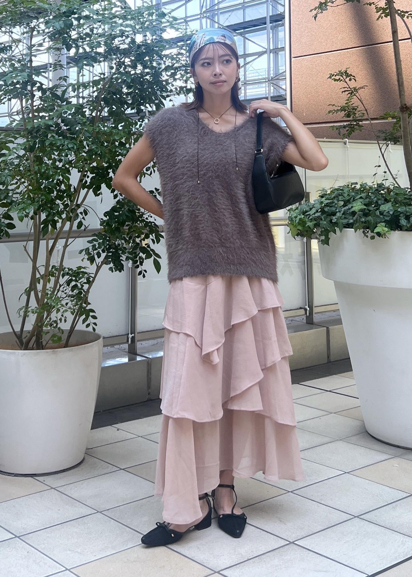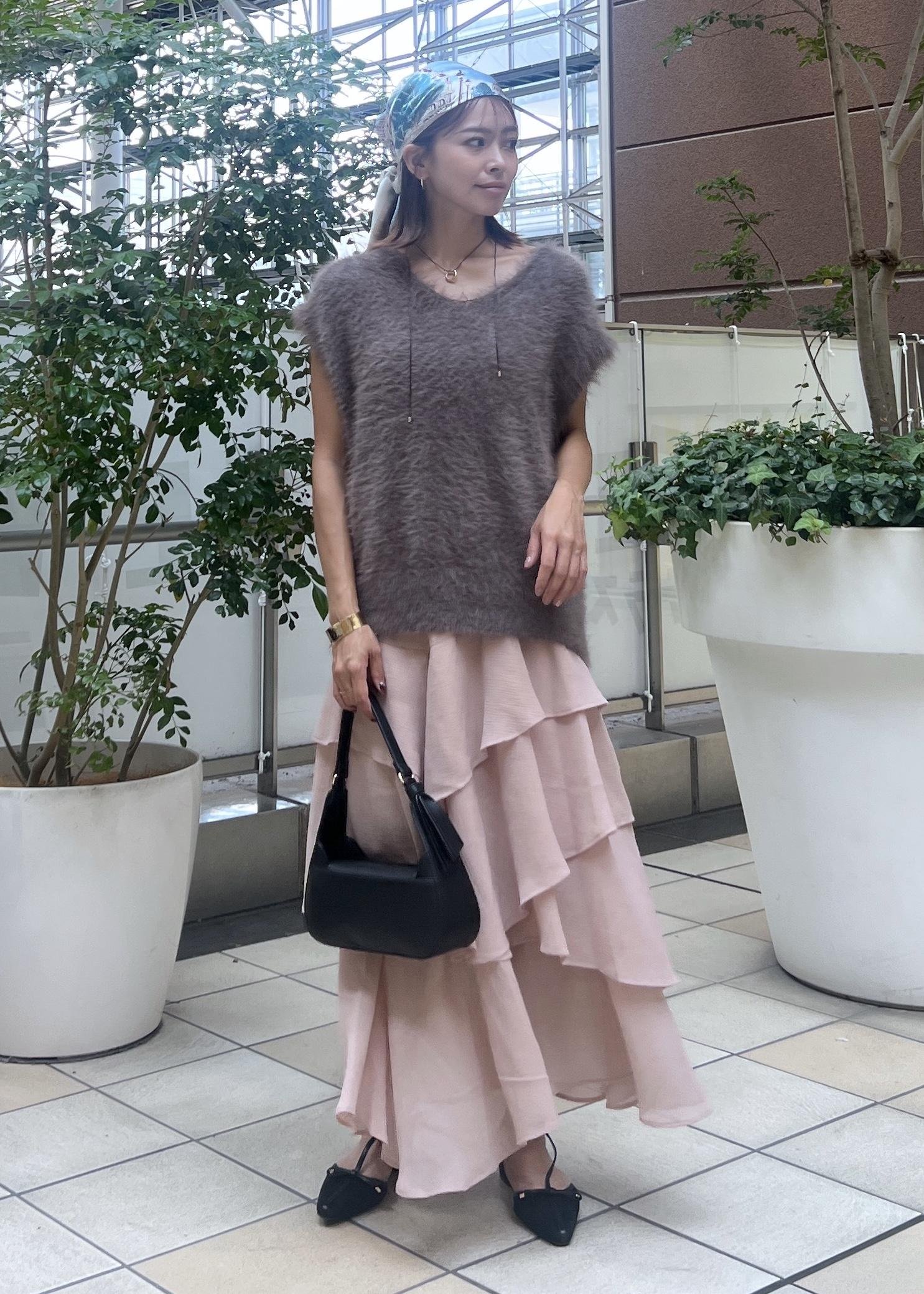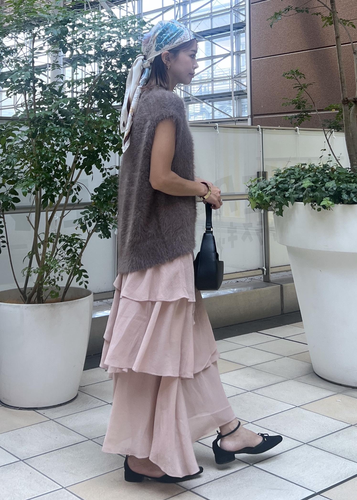 柔らかくふんわりした肌触りのフェザーベストは、ティアードスカートと合わせて大人カジュアルコーデに。