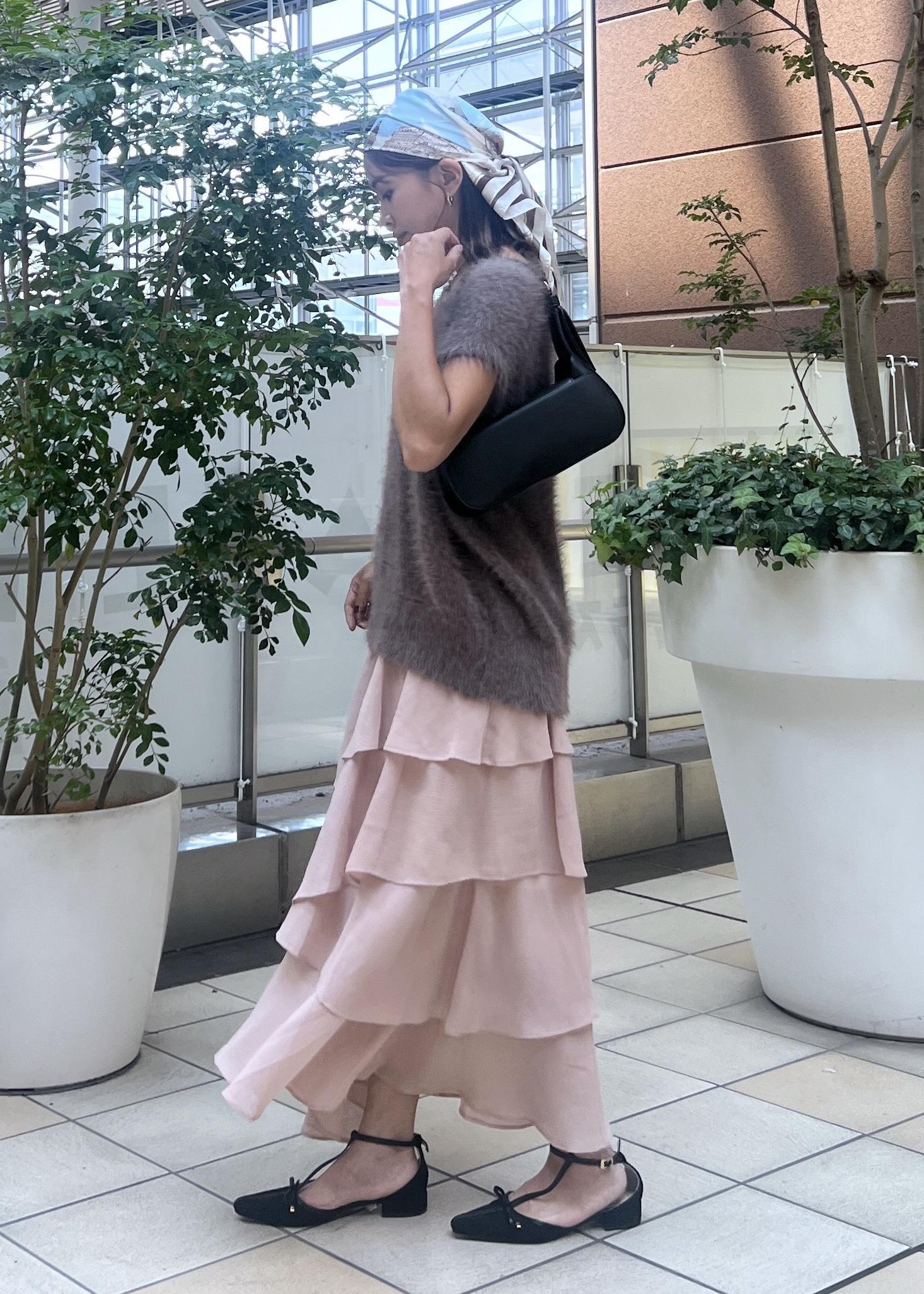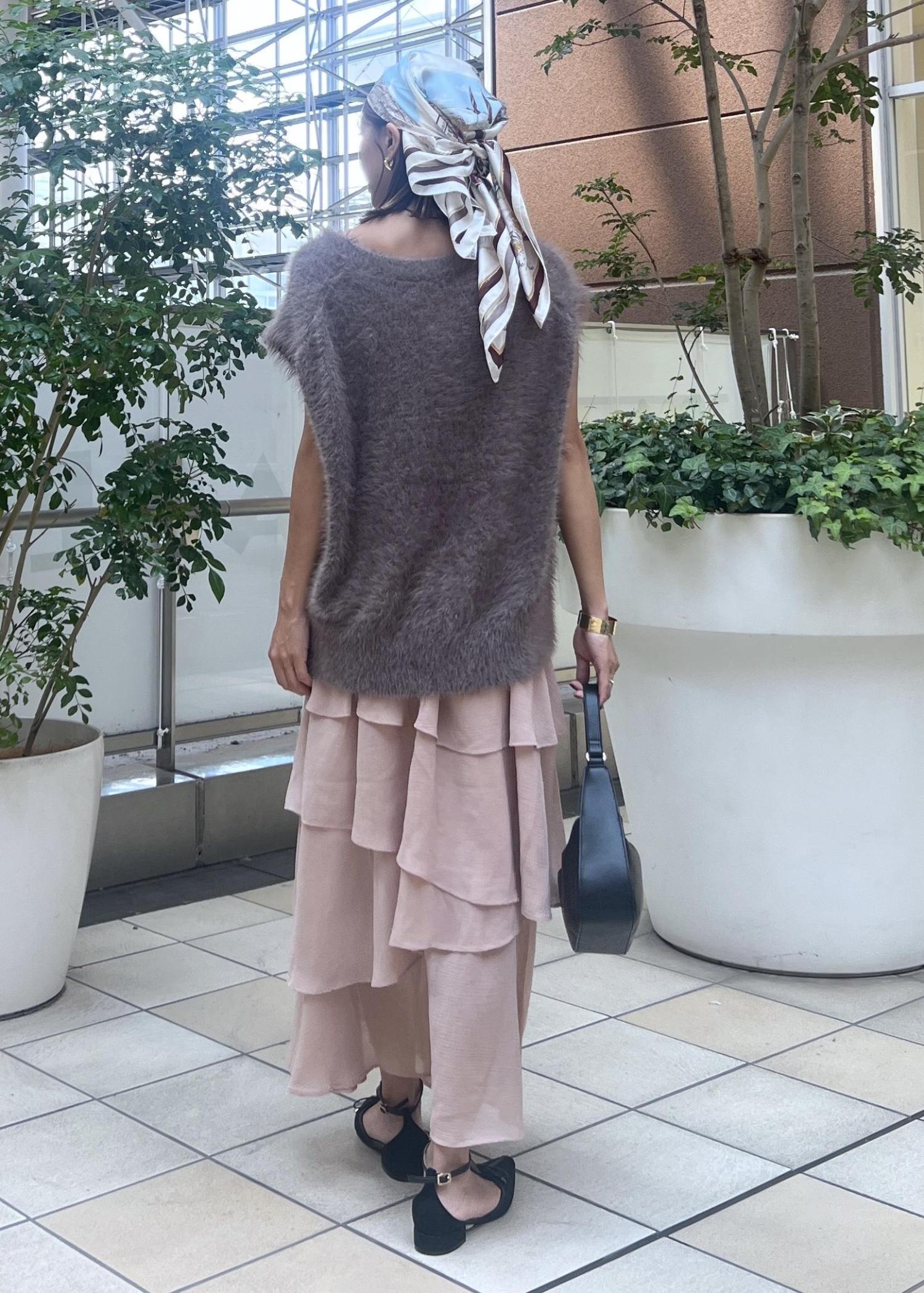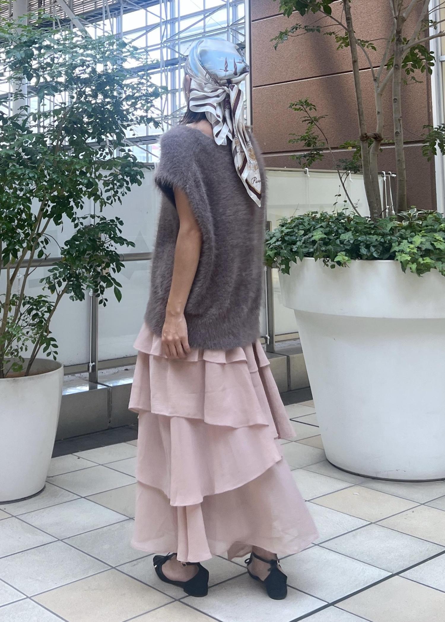 柔らかくふんわりした肌触りのフェザーベストは、ティアードスカートと合わせて大人カジュアルコーデに。