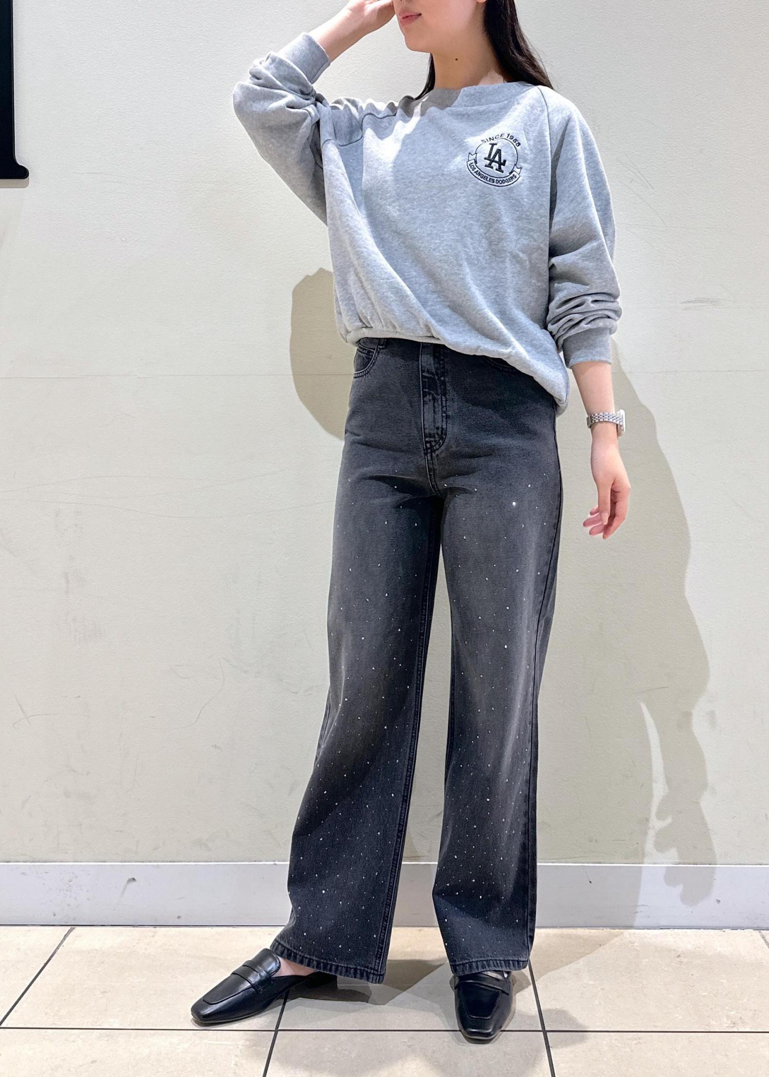 着心地:162cmで38のサイズ着用しています、ウエスト周りは余裕がありますが、丈感や足回りはばっちりです★!シルエットも目立ちにくい履きやすいデニムですが、ビジューが細かくついており、動くたびにキラキラして着用するだけでアクセントになり、気分もあがります◡̈ -