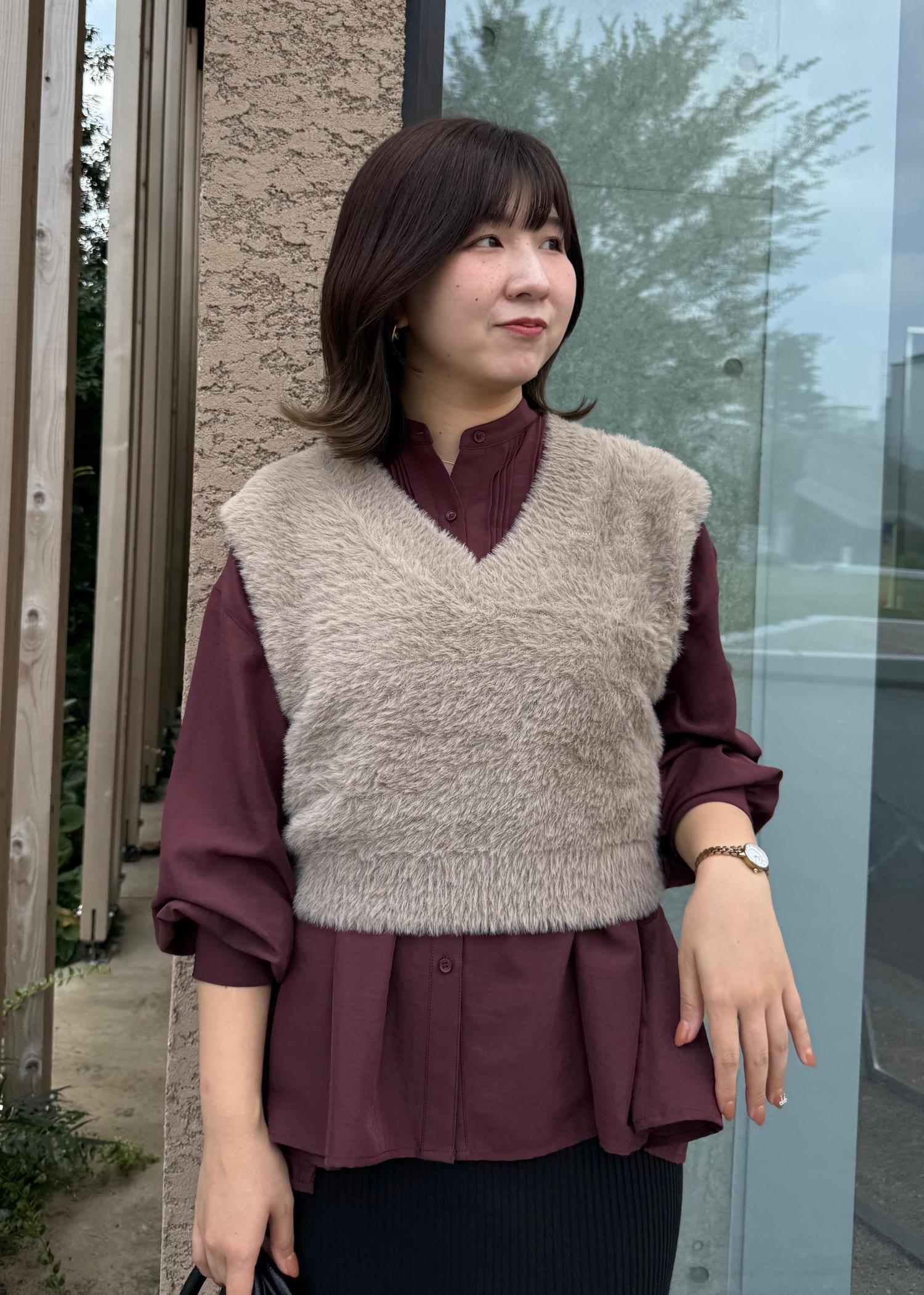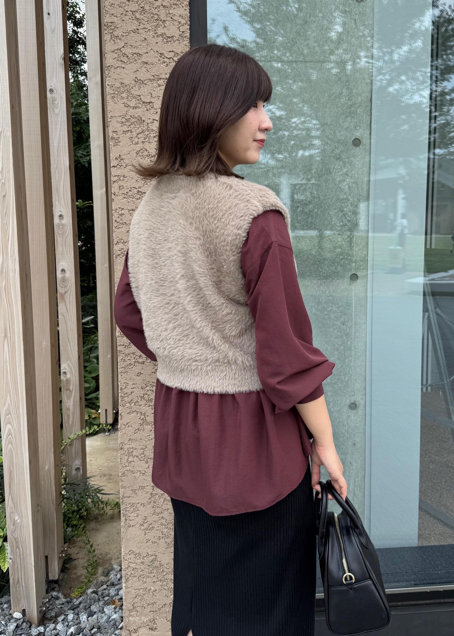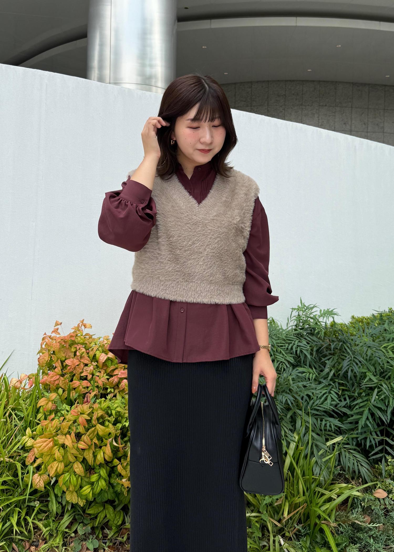 春夏大人気だったペプラムシャツの新作にフェザーベストを合わせたレイヤードスタイル。