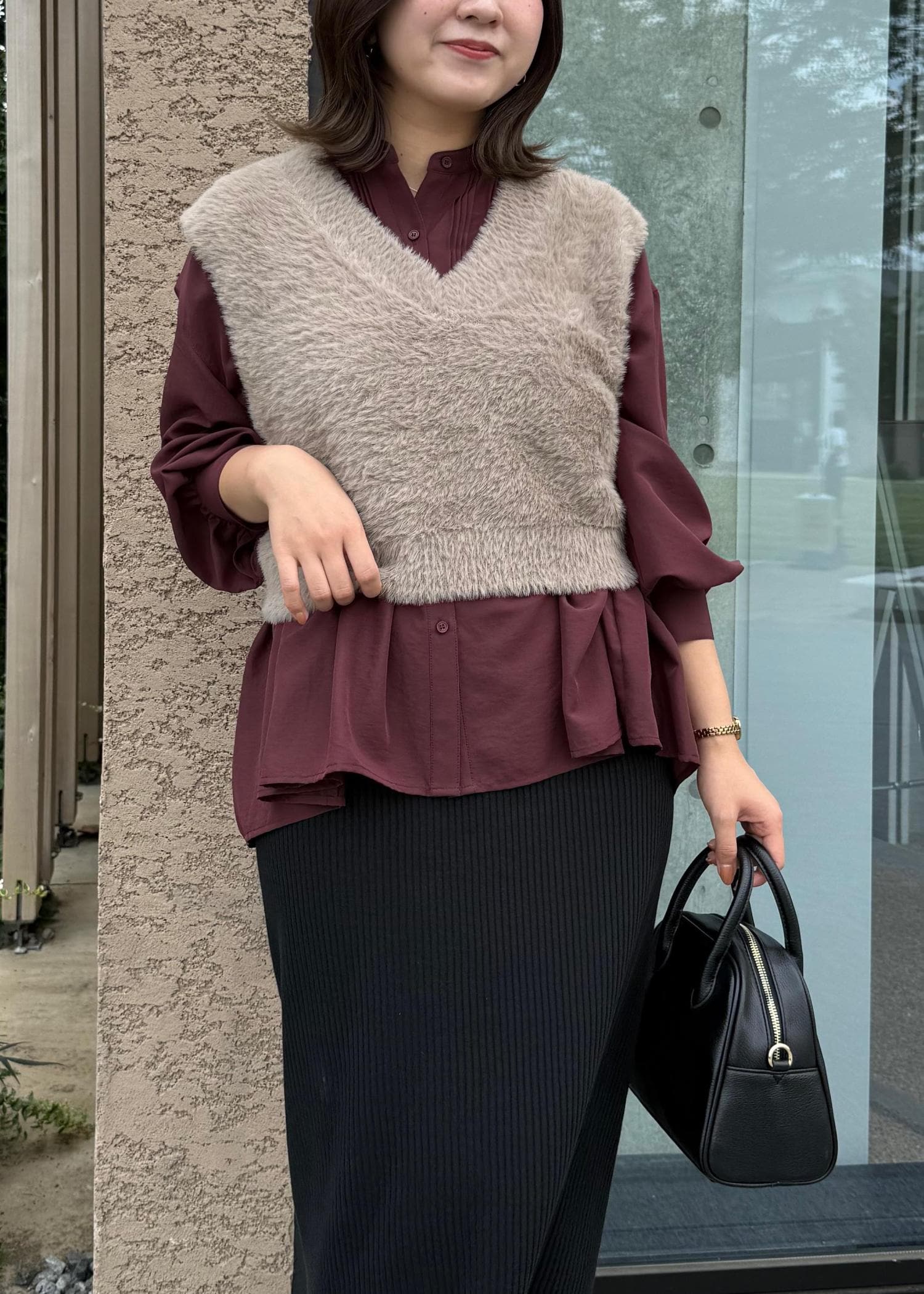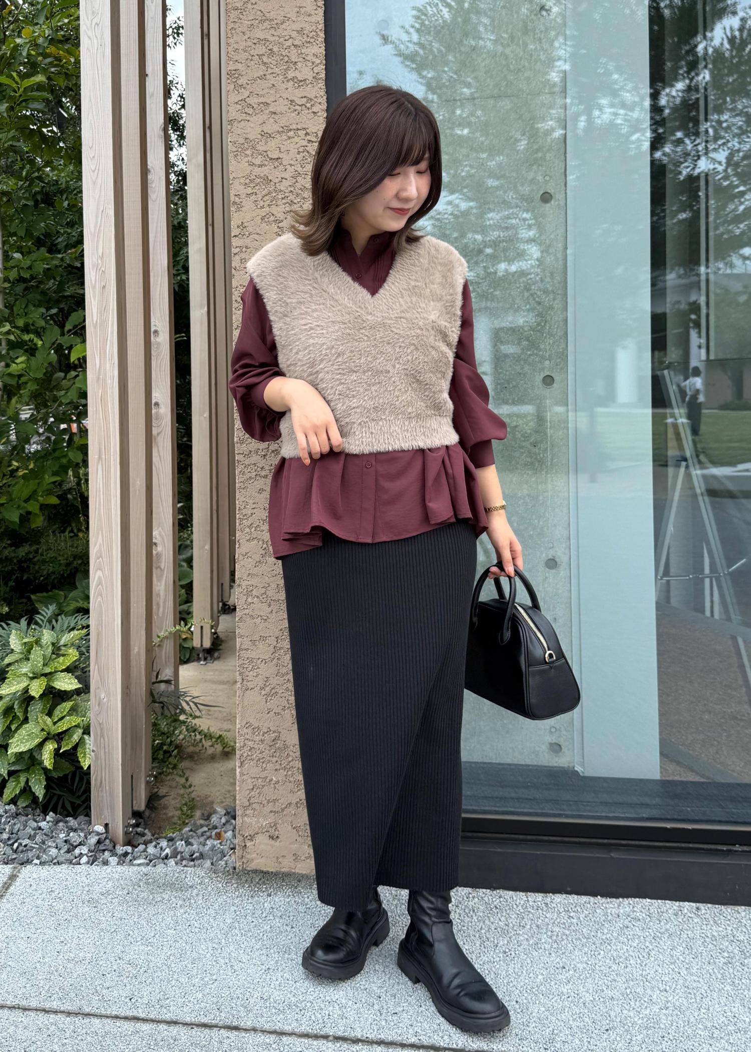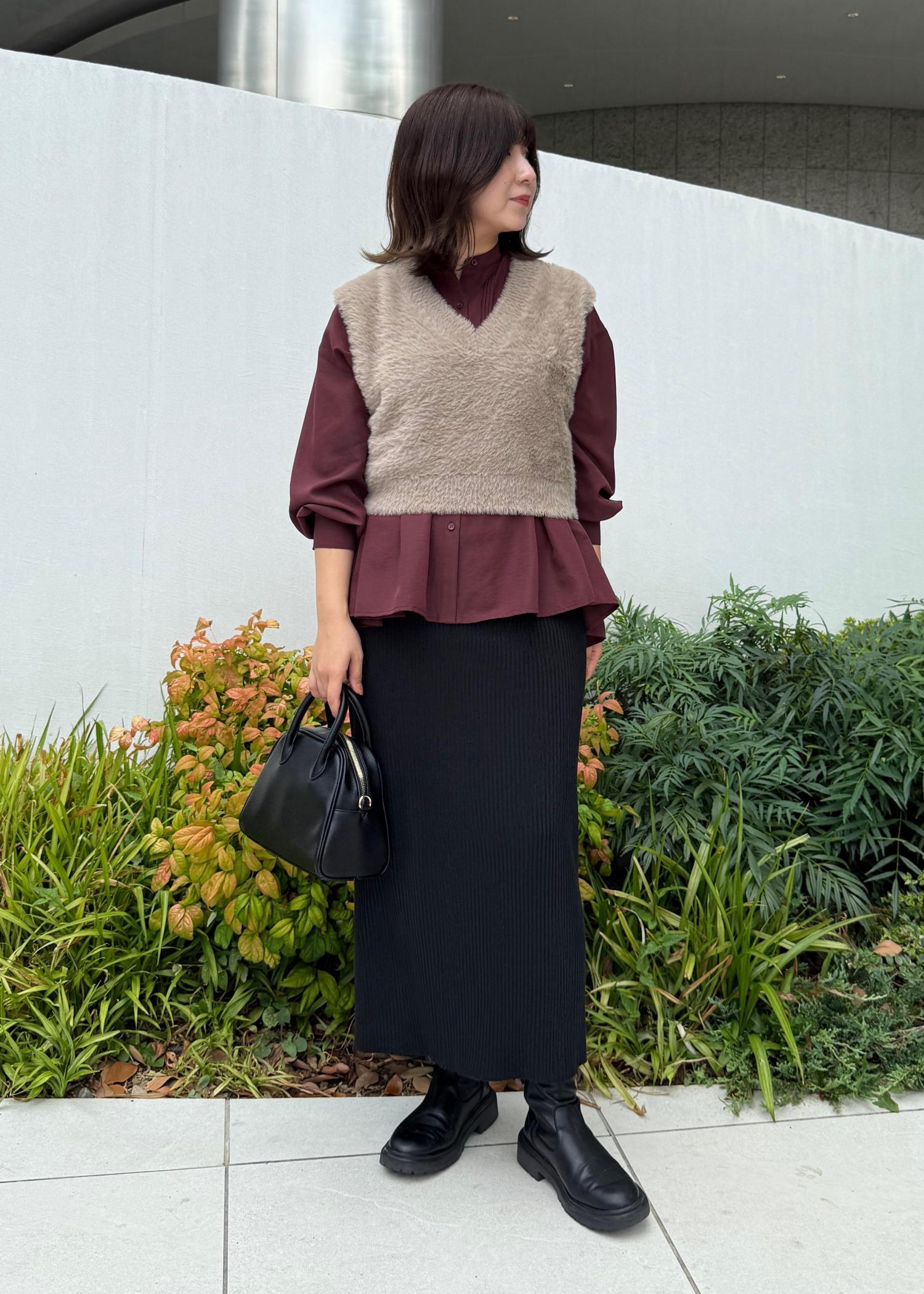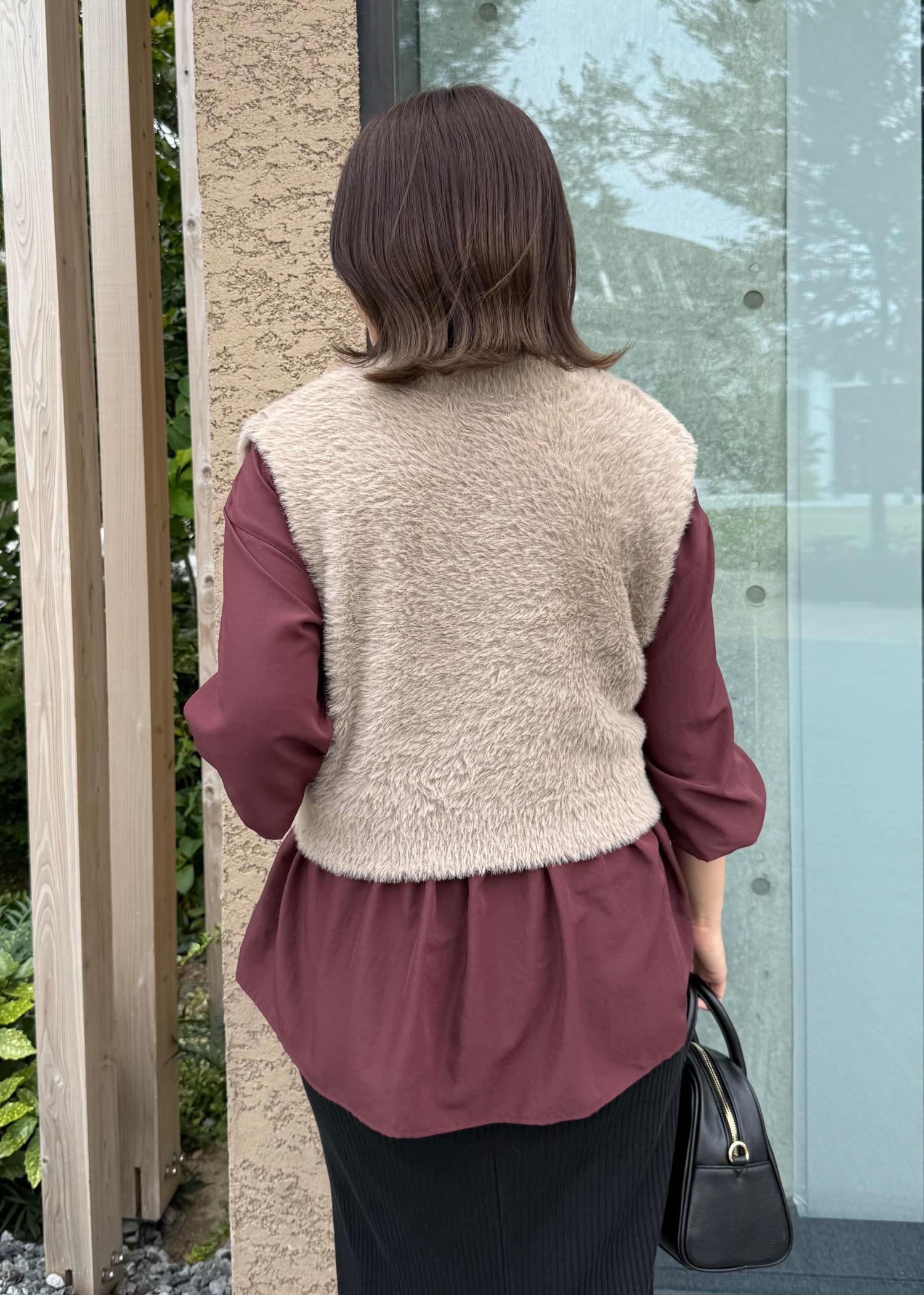春夏大人気だったペプラムシャツの新作にフェザーベストを合わせたレイヤードスタイル。