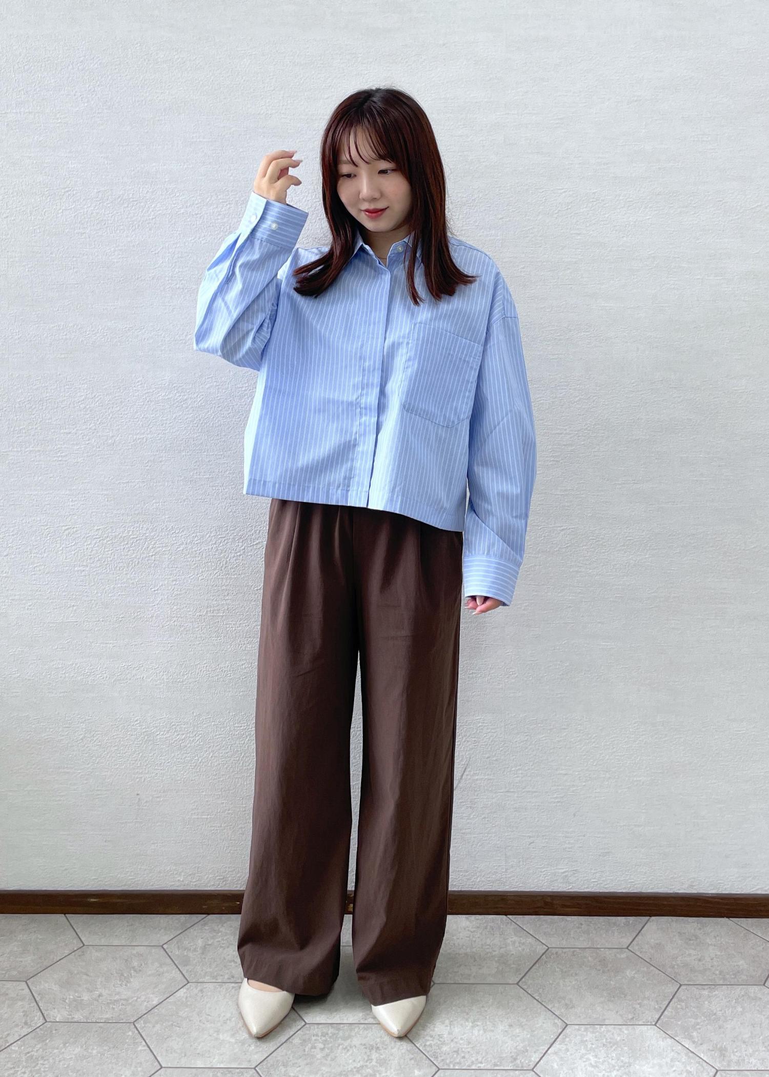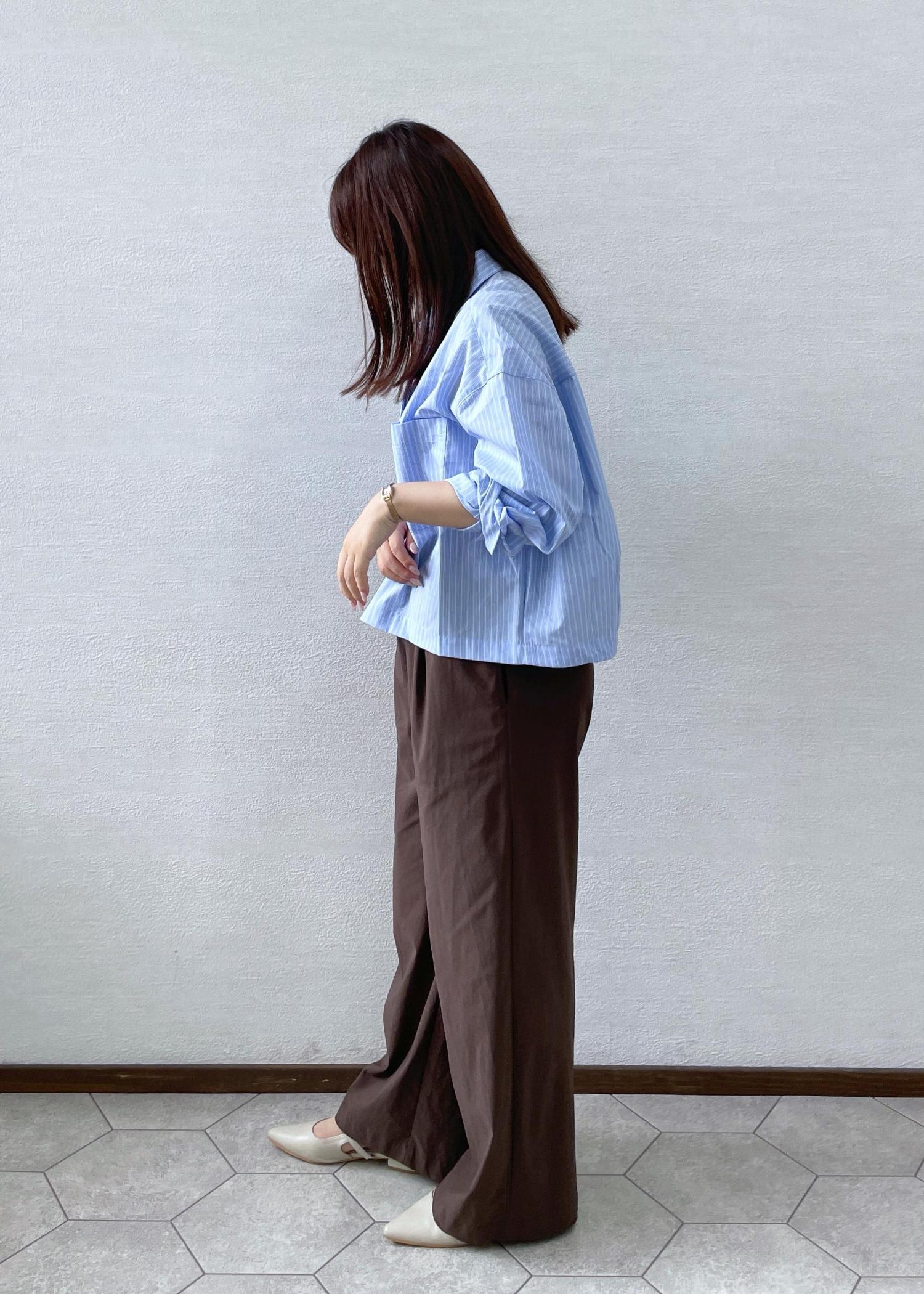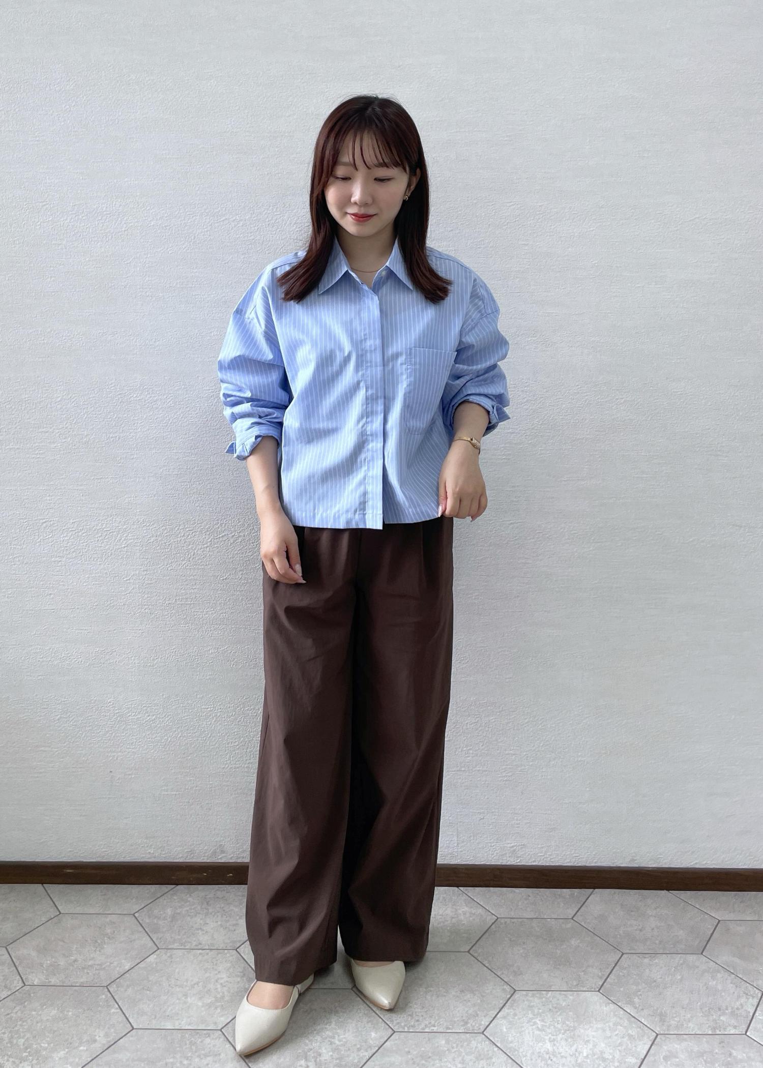 オフィスカジュアルをテーマに、少し秋らしさも取り入れたコーデにしてみました!きちんと感のあるサックスカラーのシャツにチョコのようなこっくりとしたブラウンを合わせました!
