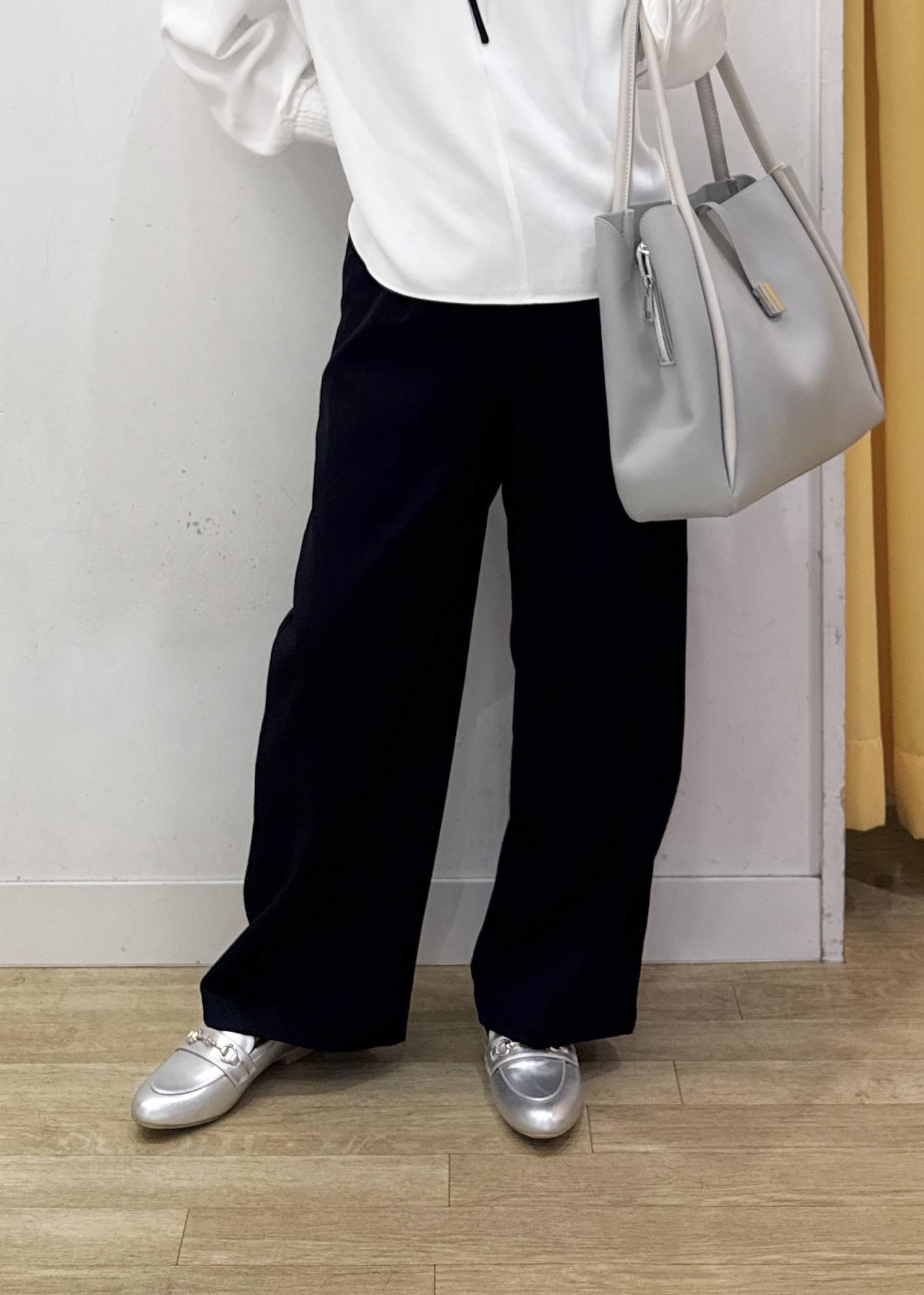 素材感は程よく厚みもあり、脚のラインを気にせずに穿けるゆったりシルエットです。