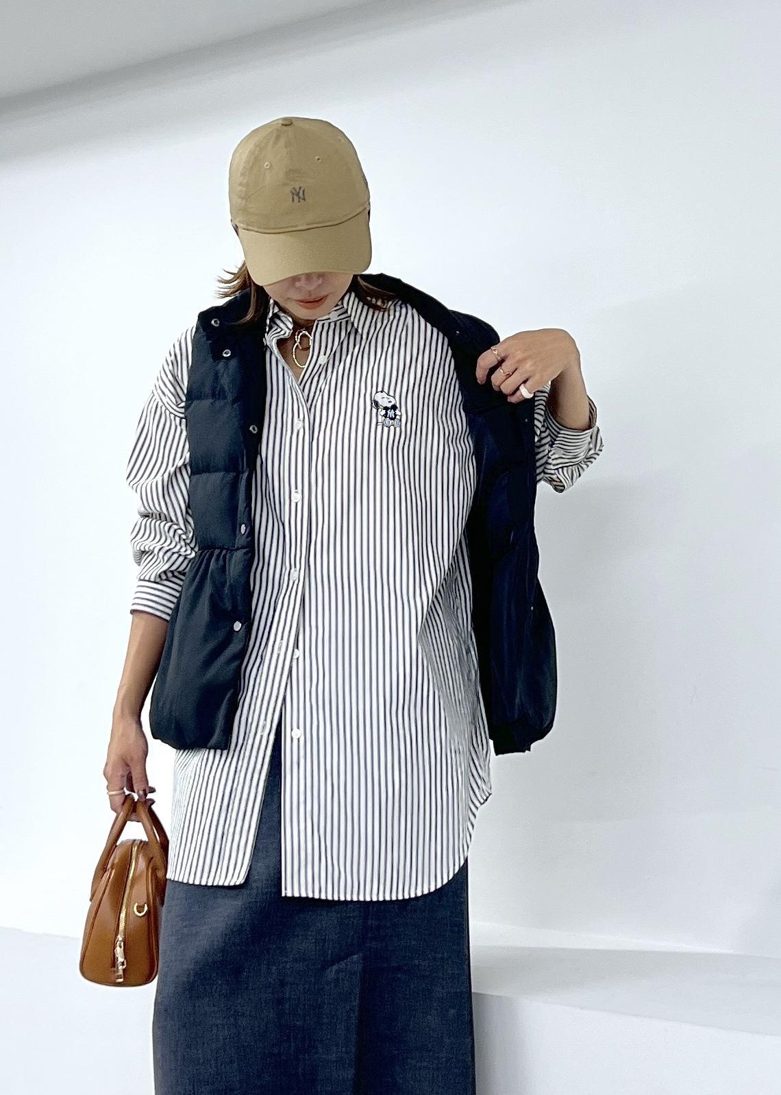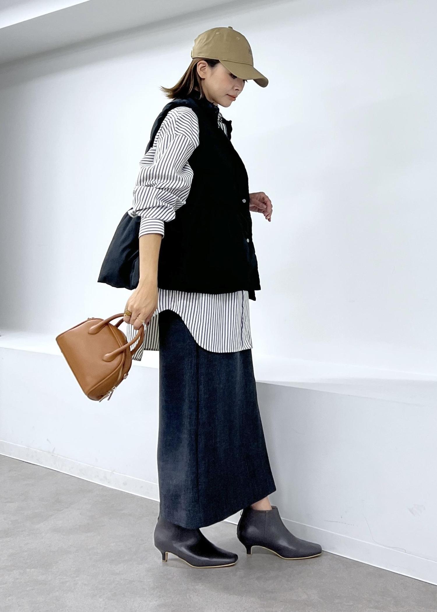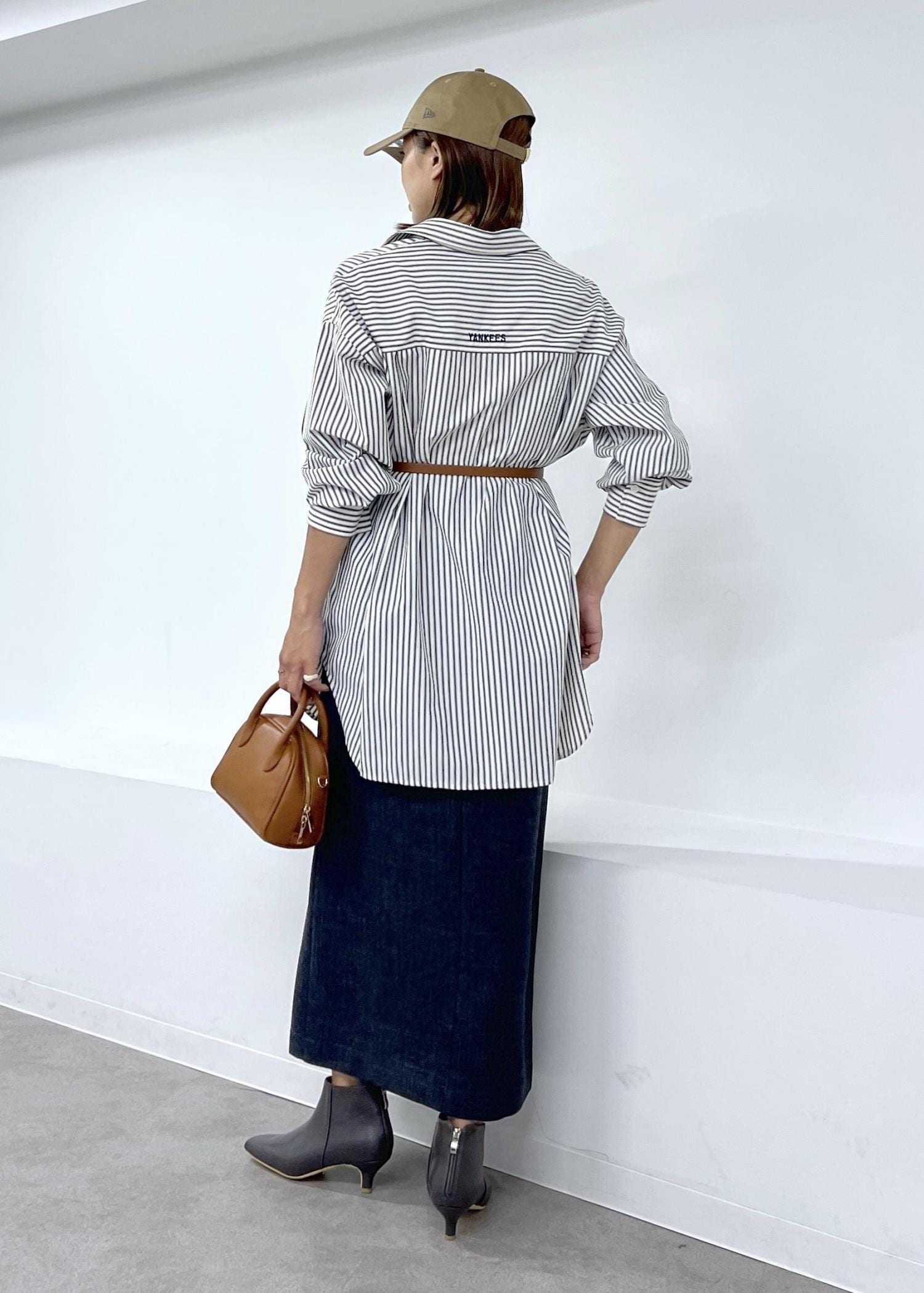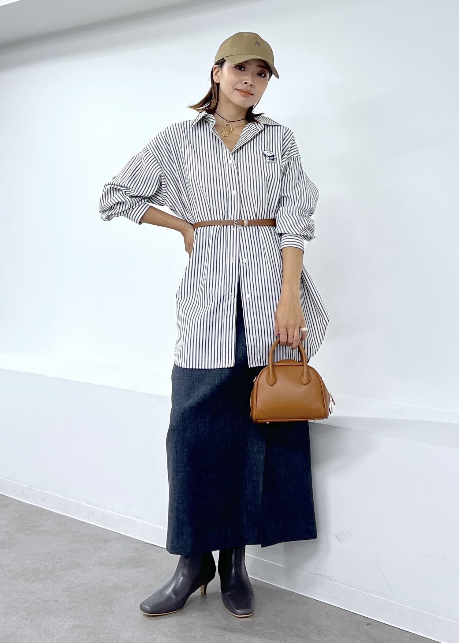 メンズライクになりすぎないようにアイラインスカートを合わせて、大人カジュアルな着こなしにしました。