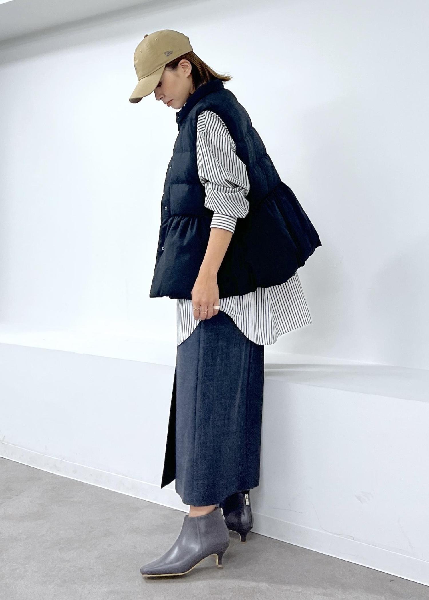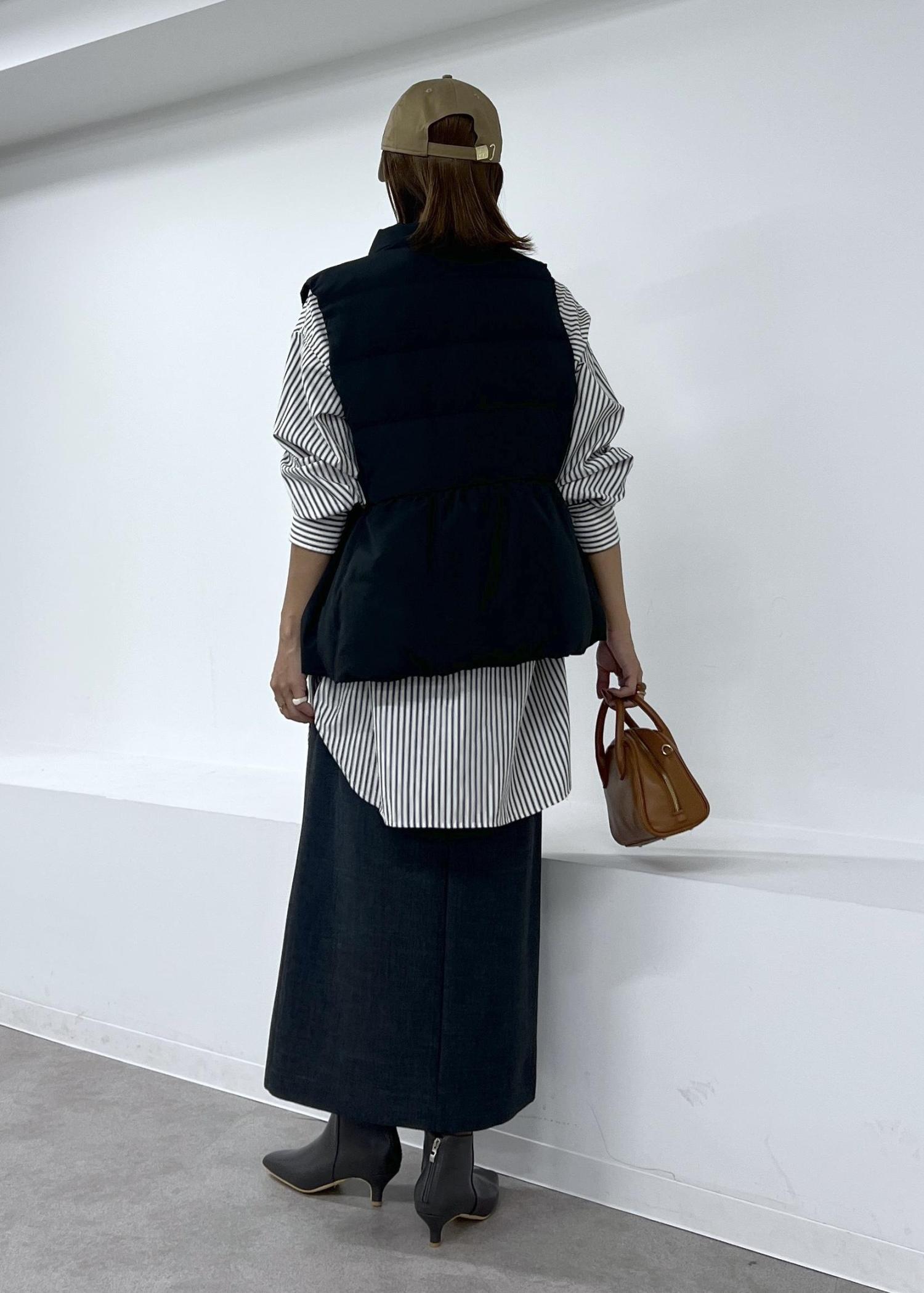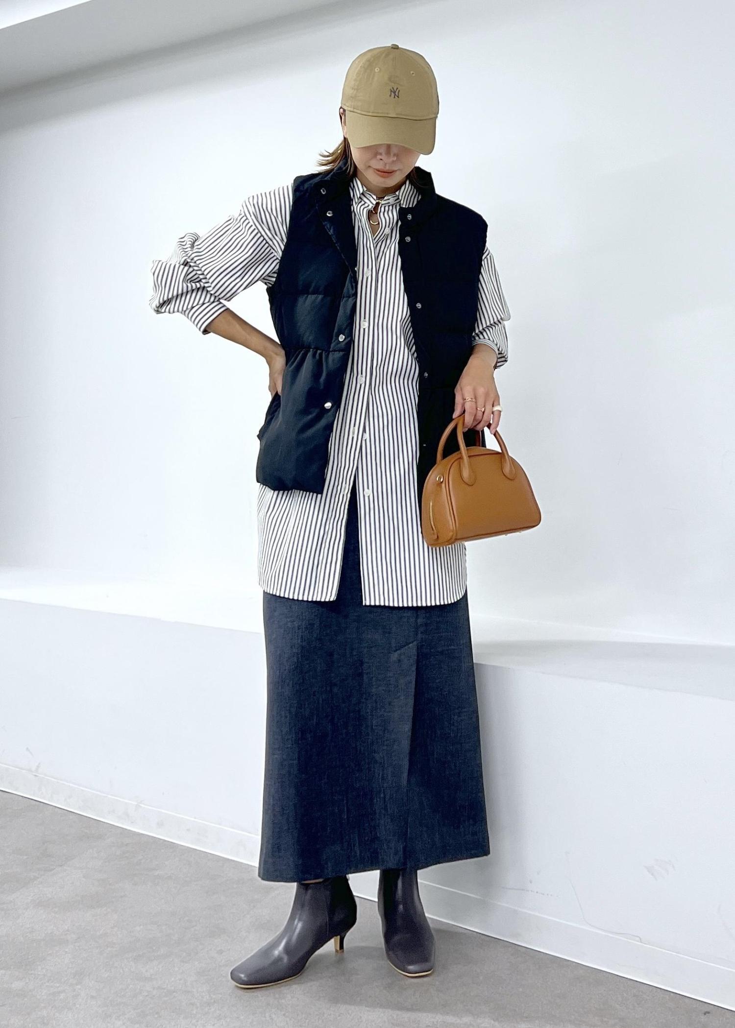 軽く暖かい着心地のダウンベストは、シャツに合わせて秋冬コーデに