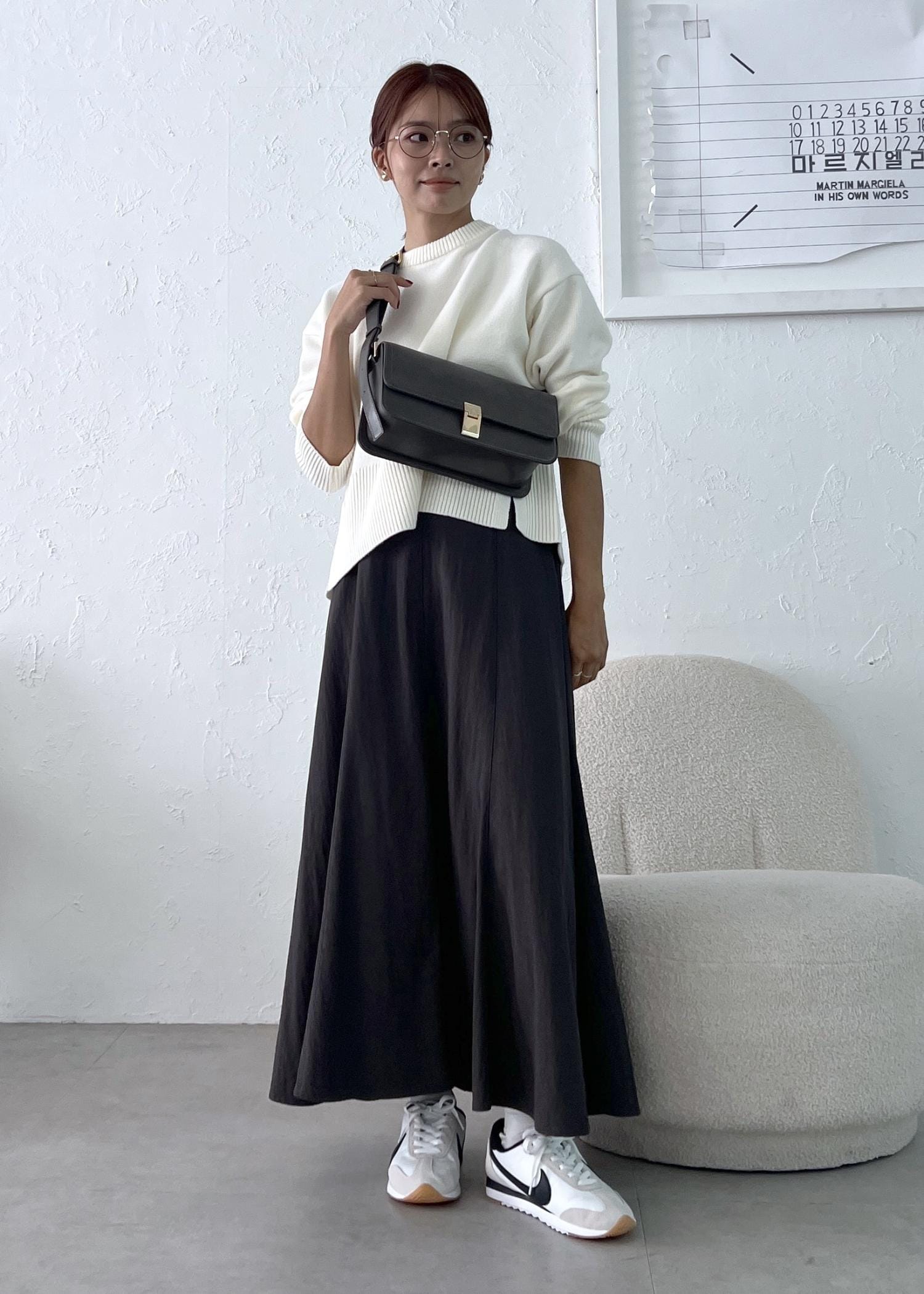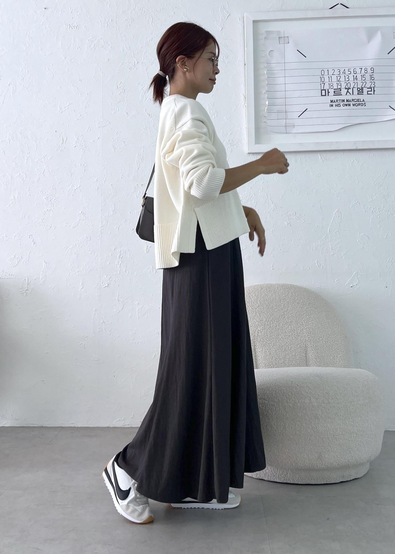 秋冬コーデに欠かせない白ニットは、グレーのマーメイドスカートを合わせて大人カジュアルなスタイリングに。