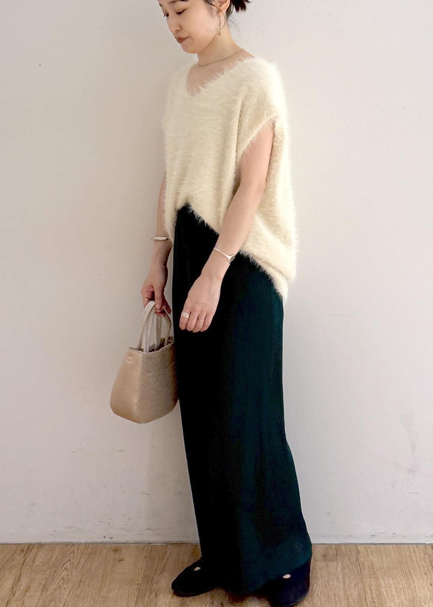 店頭でも大人気のフェザーシリーズ。かたちもカジュアルすぎないので大人っぽく着用できます。