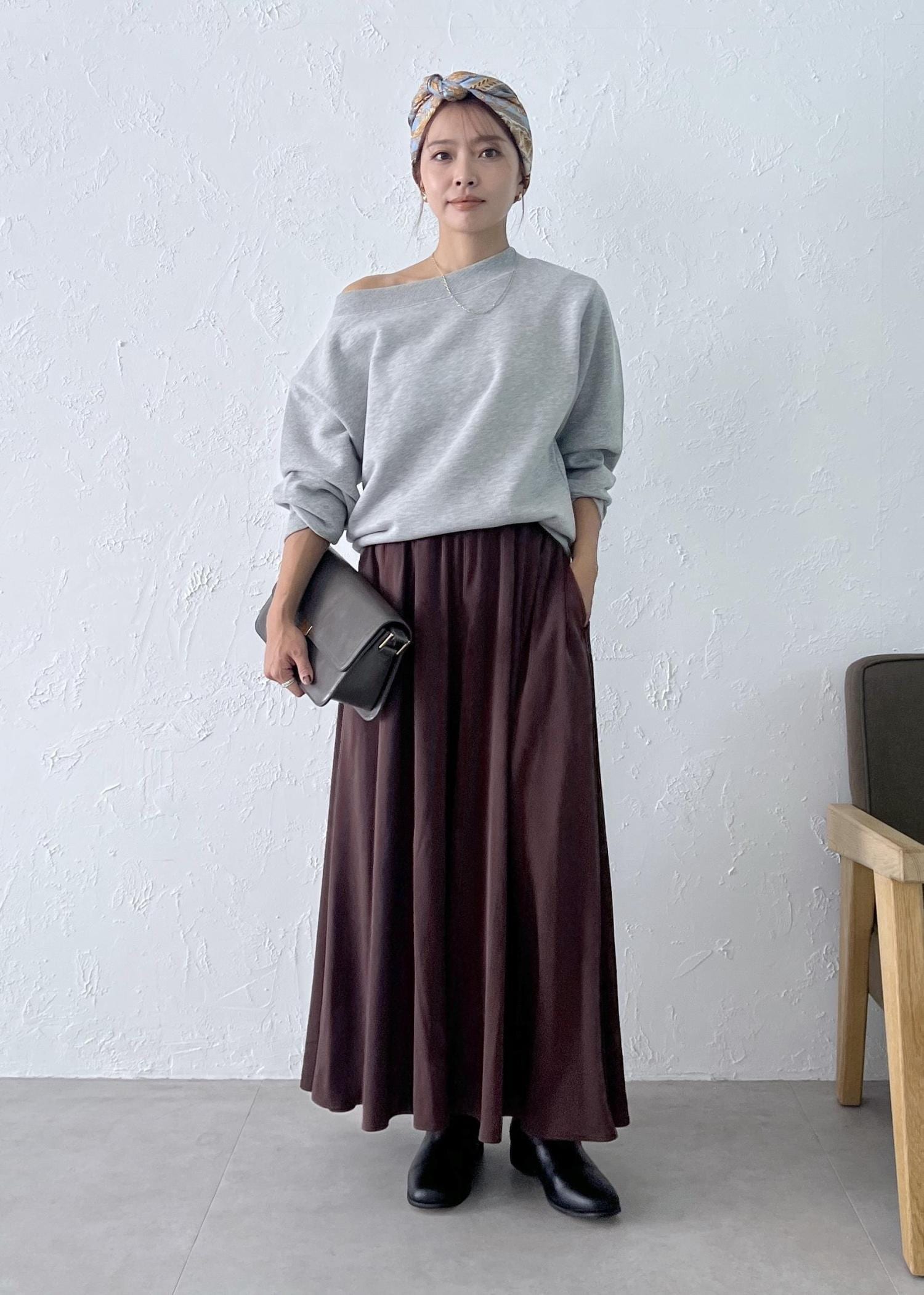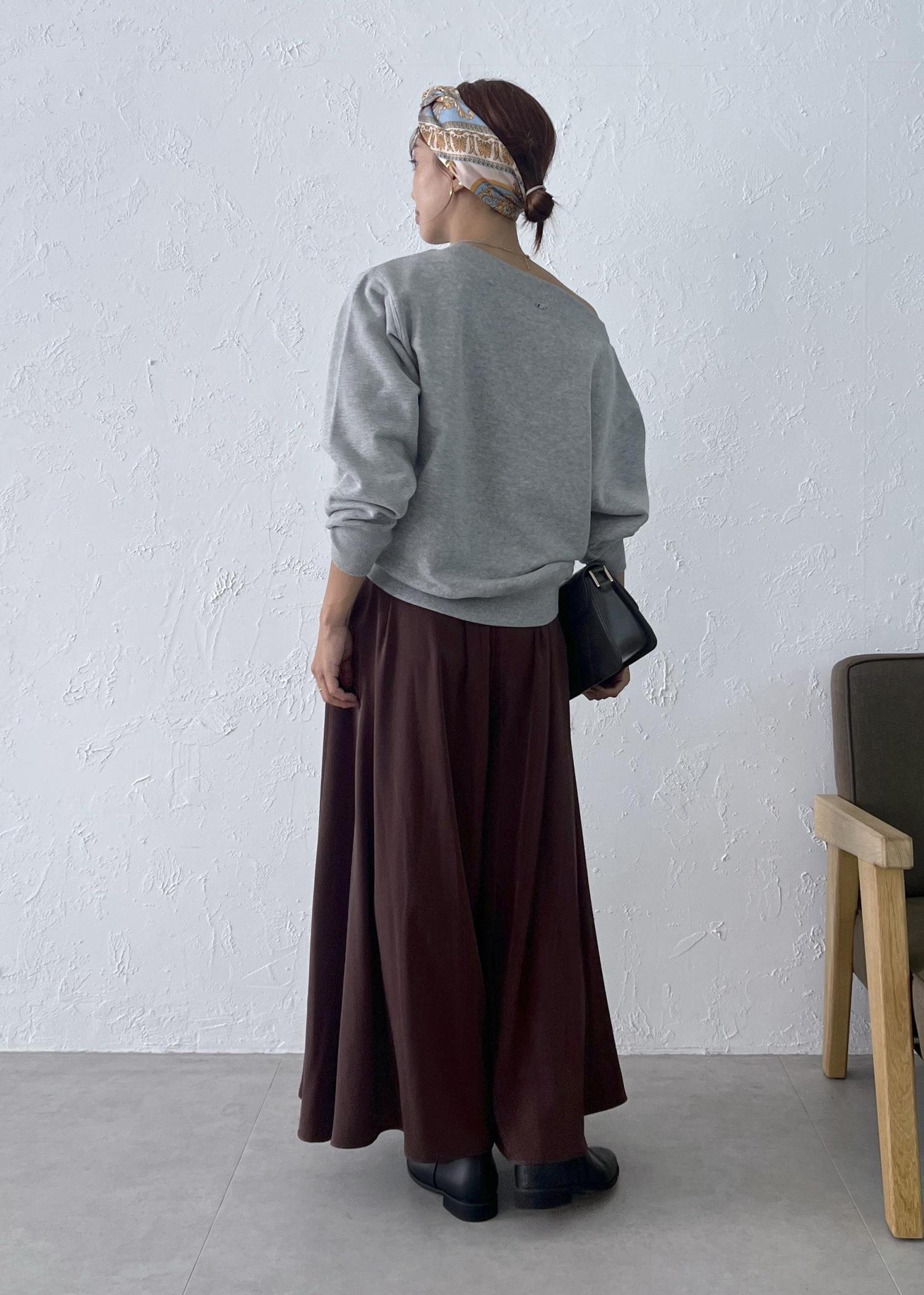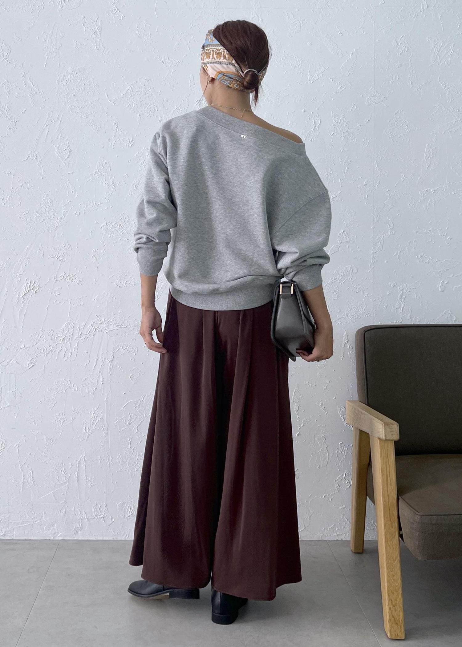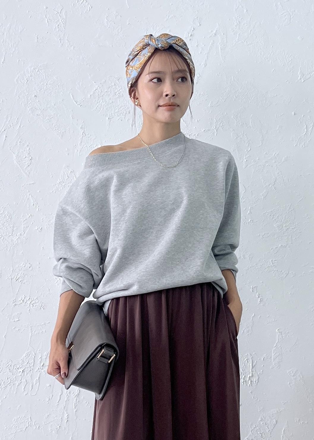 季節の変わり目に着やすいスウェットトップスは、片方の肩を落としてワンショルダーの着方もできる2way仕様。