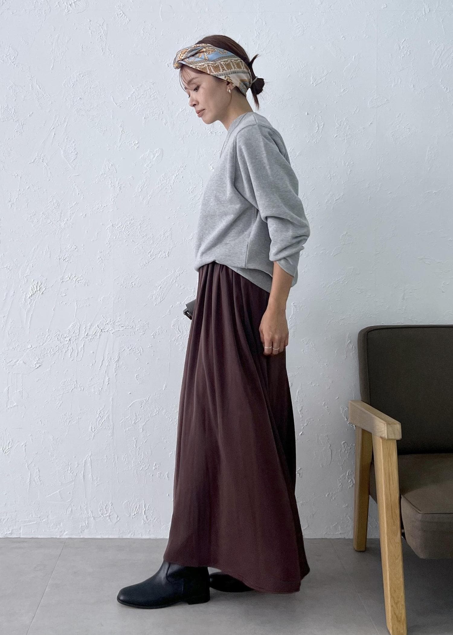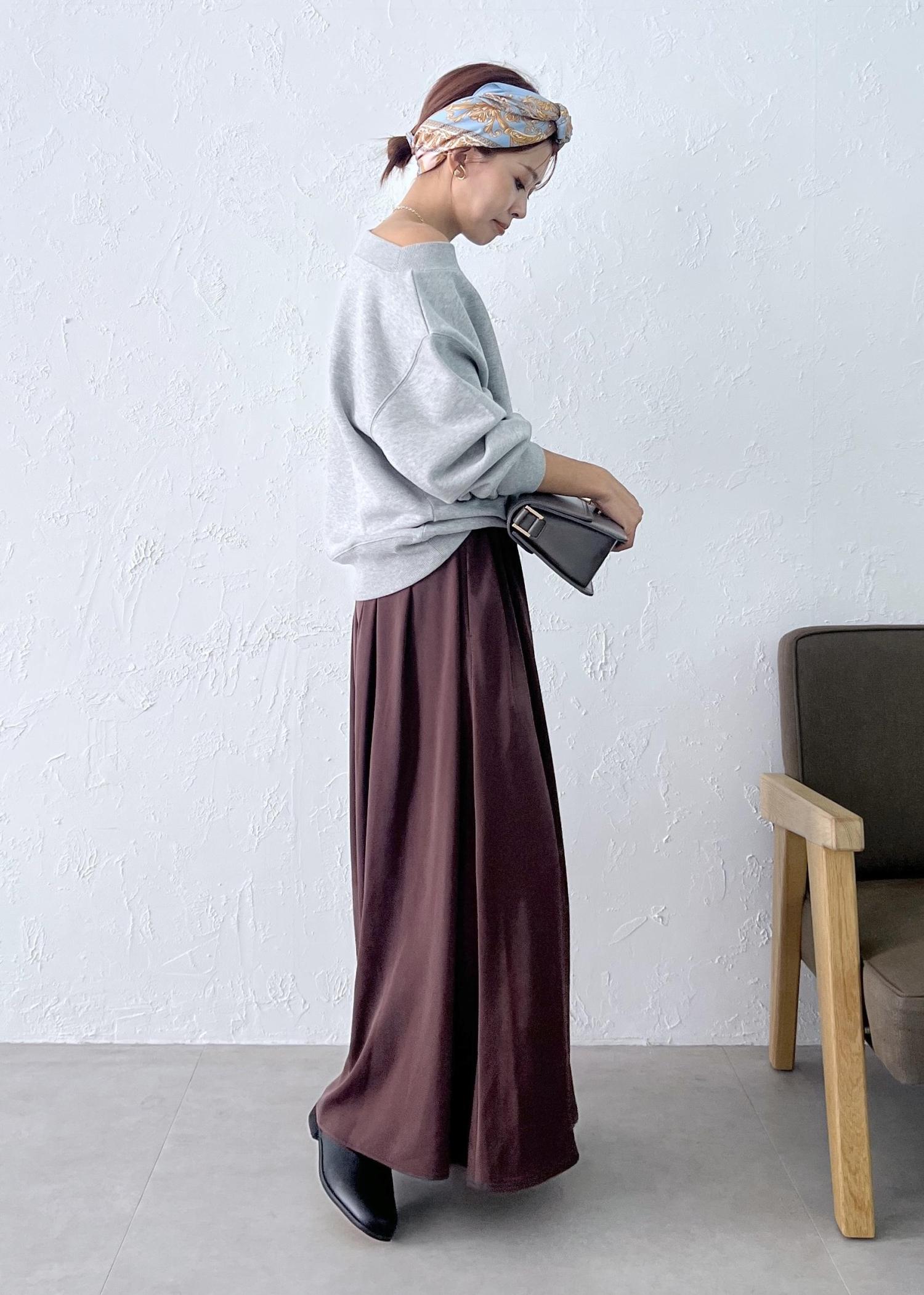 光沢感のあるスカーチョを合わせて、大人の余裕があるリラクシーなスタイリングにしました。