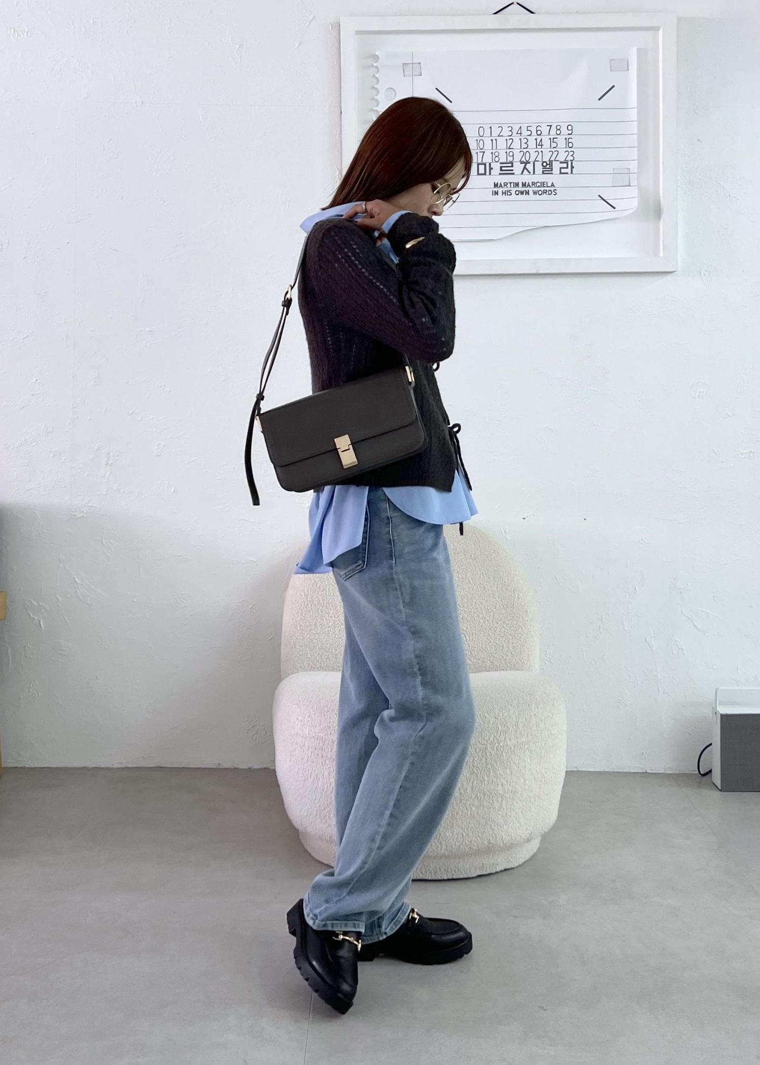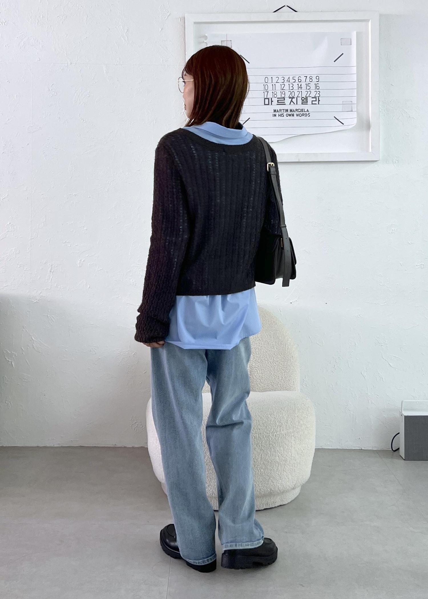 シャツと透かし編みカーディガンのレイヤードコーデ