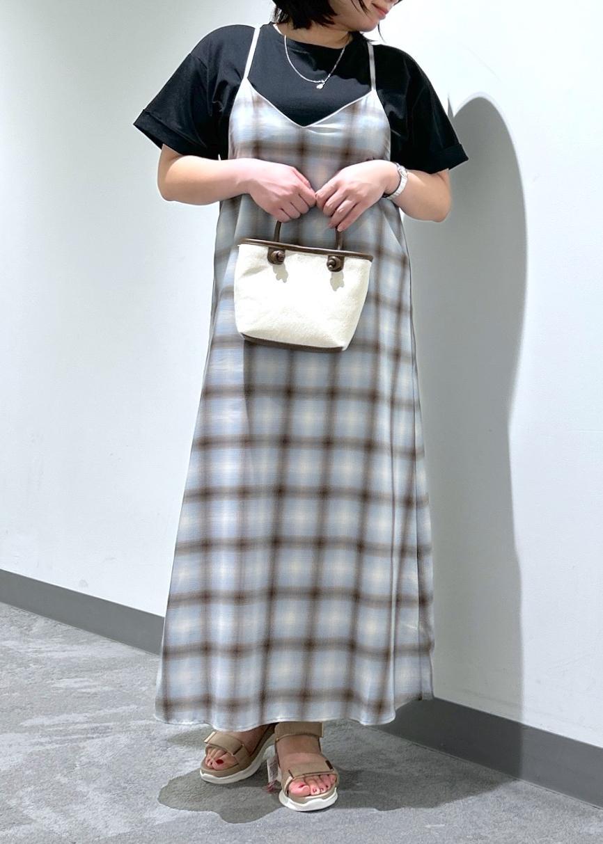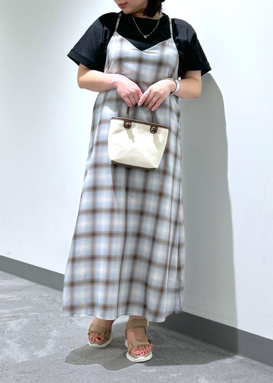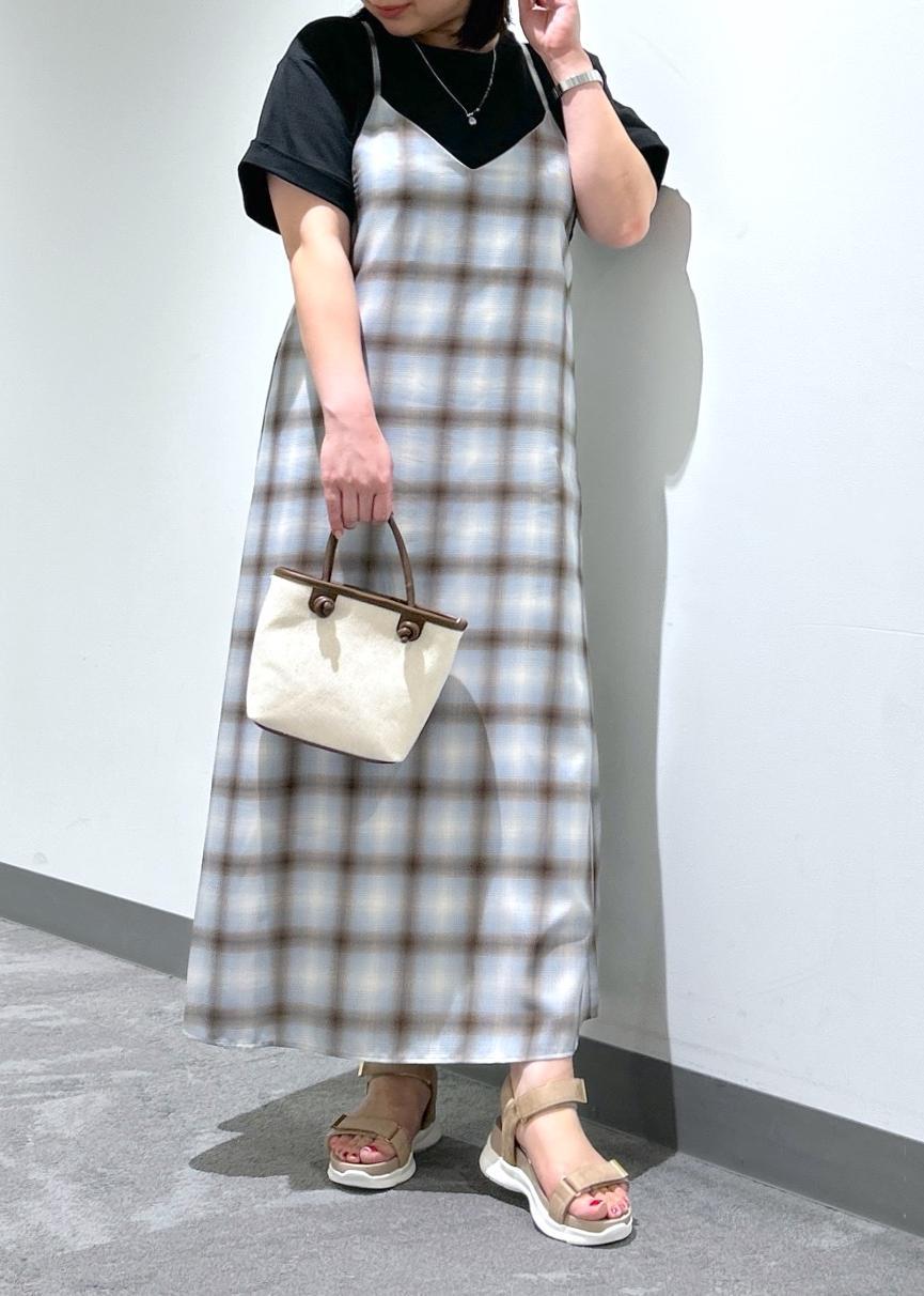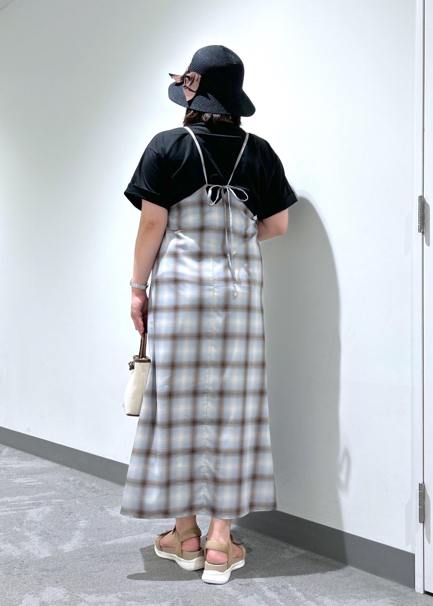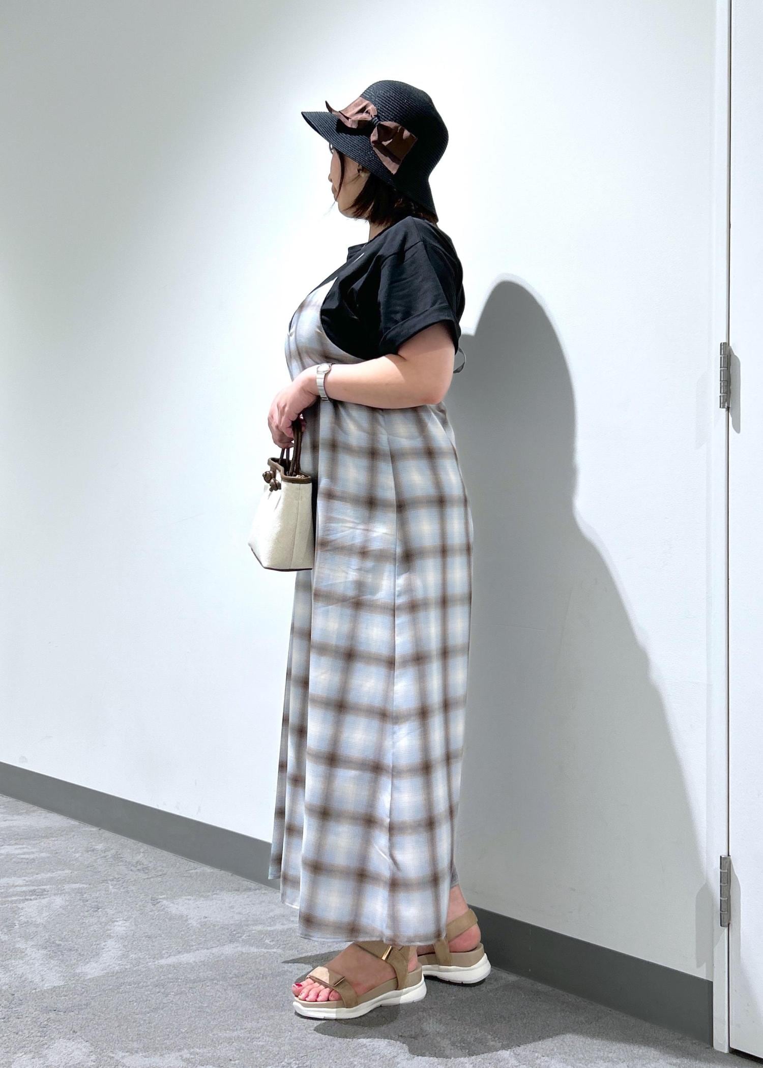 ゆったりとしたシルエットで体型カバーのできる着回し力抜群の万能Tシャツと、チェック柄のキャミソール型ロングワンピースです。