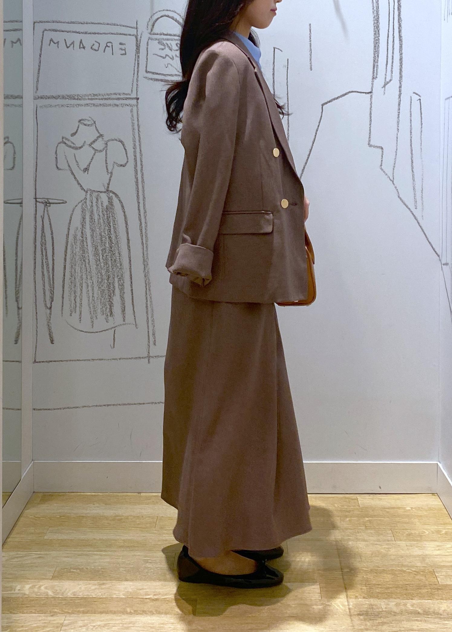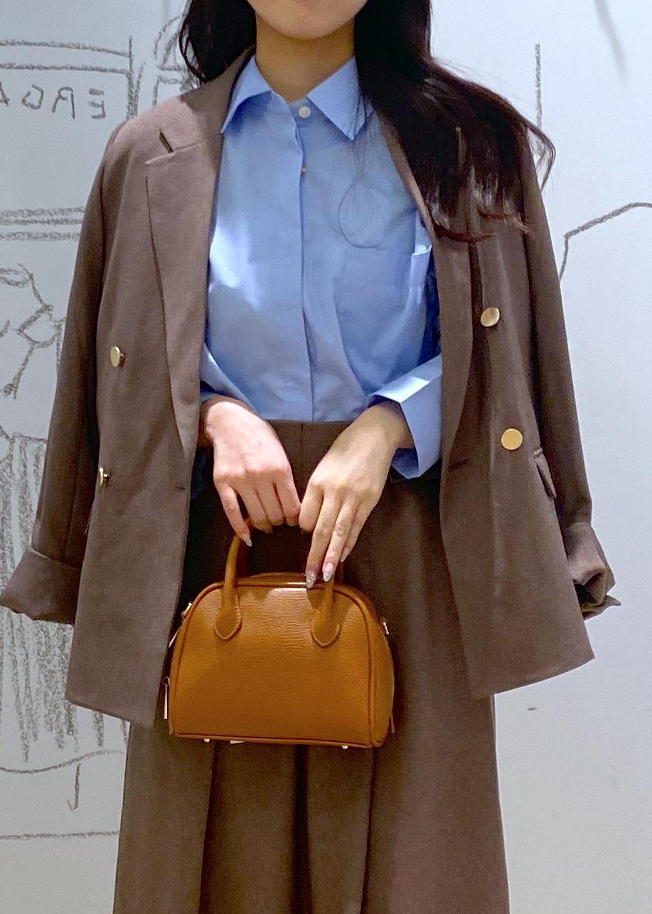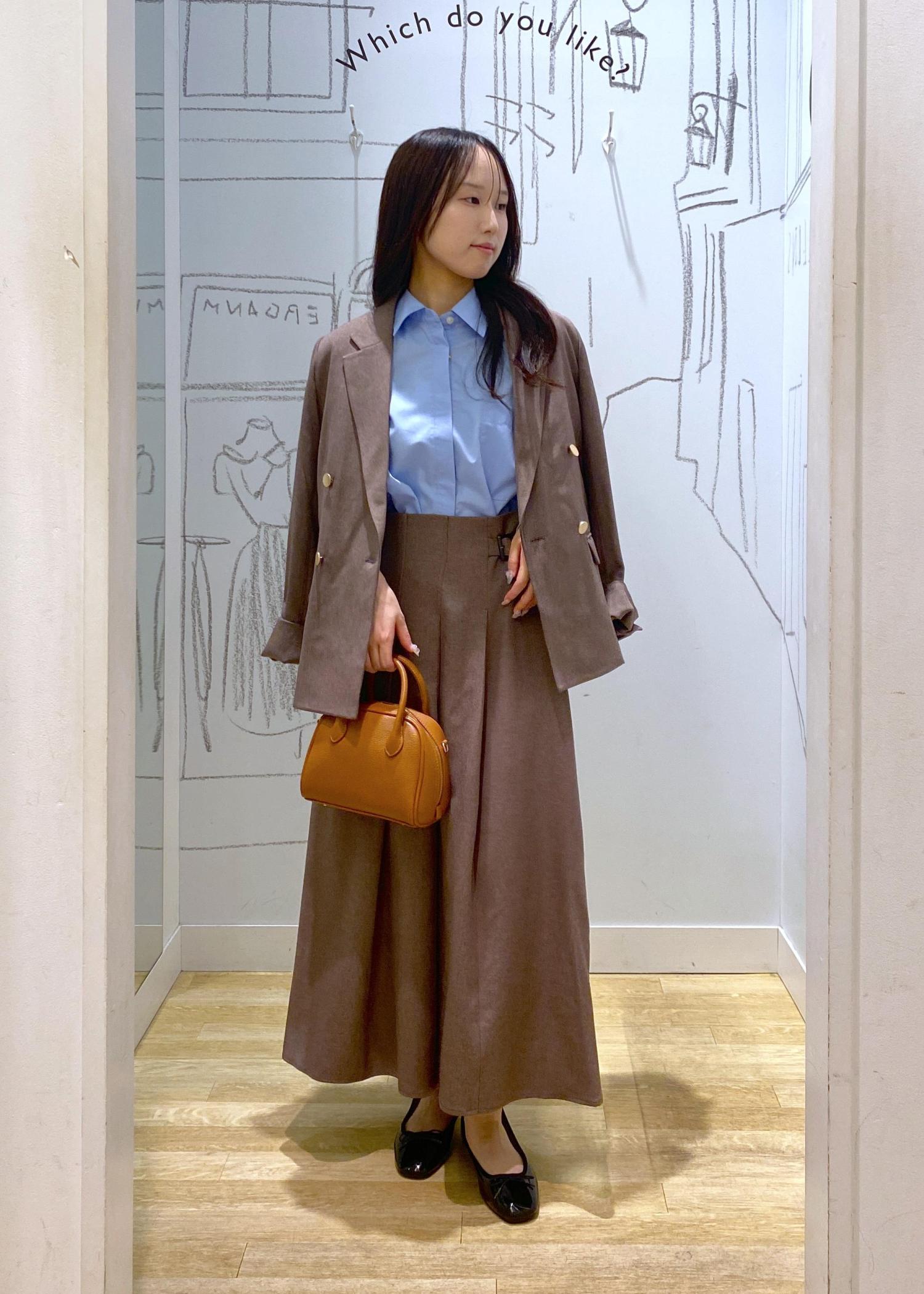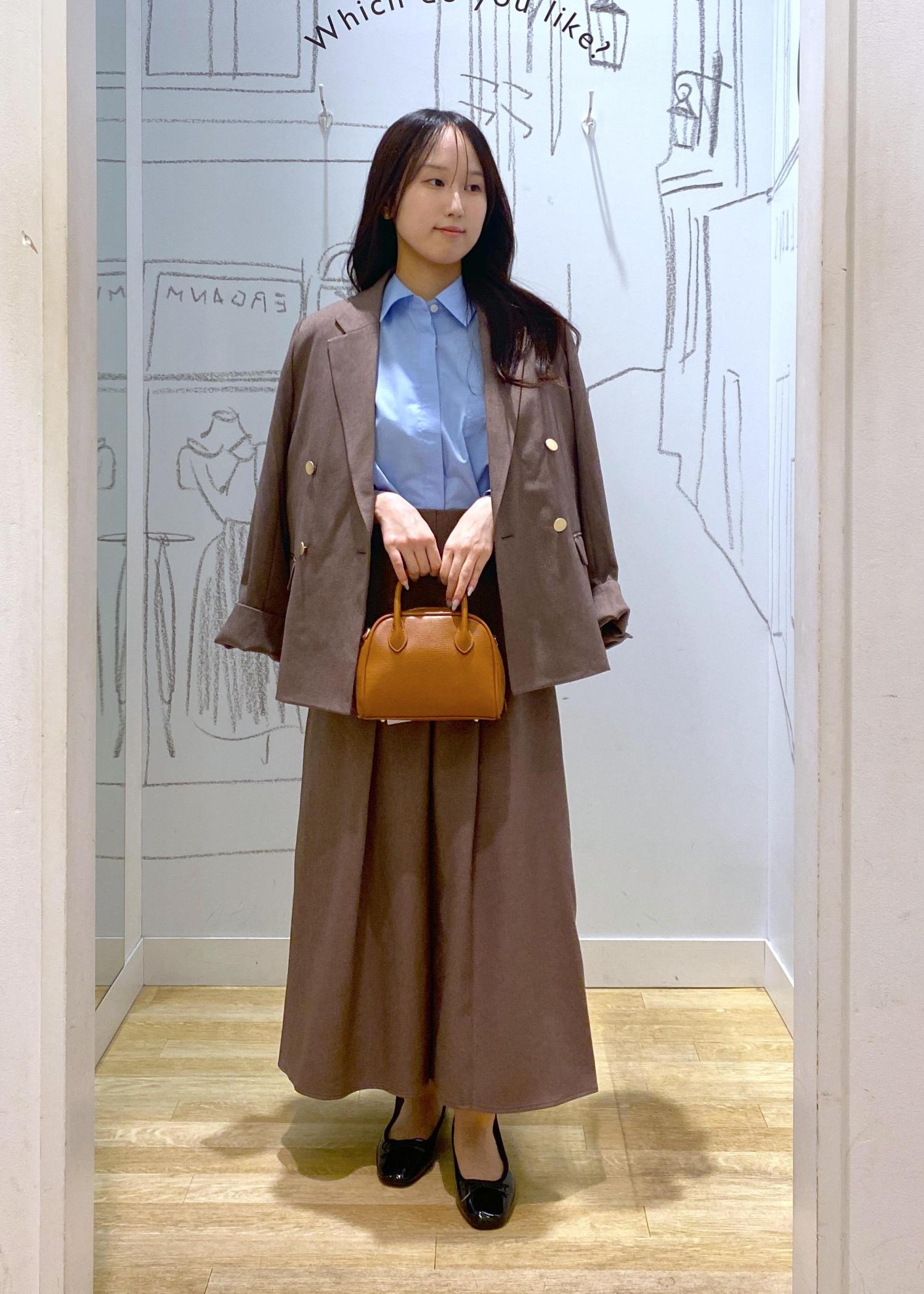 ブラウンと淡めのお色味なのでインナーをパキッとしたブルーを合わせることでコーデにメリハリがでます◎
