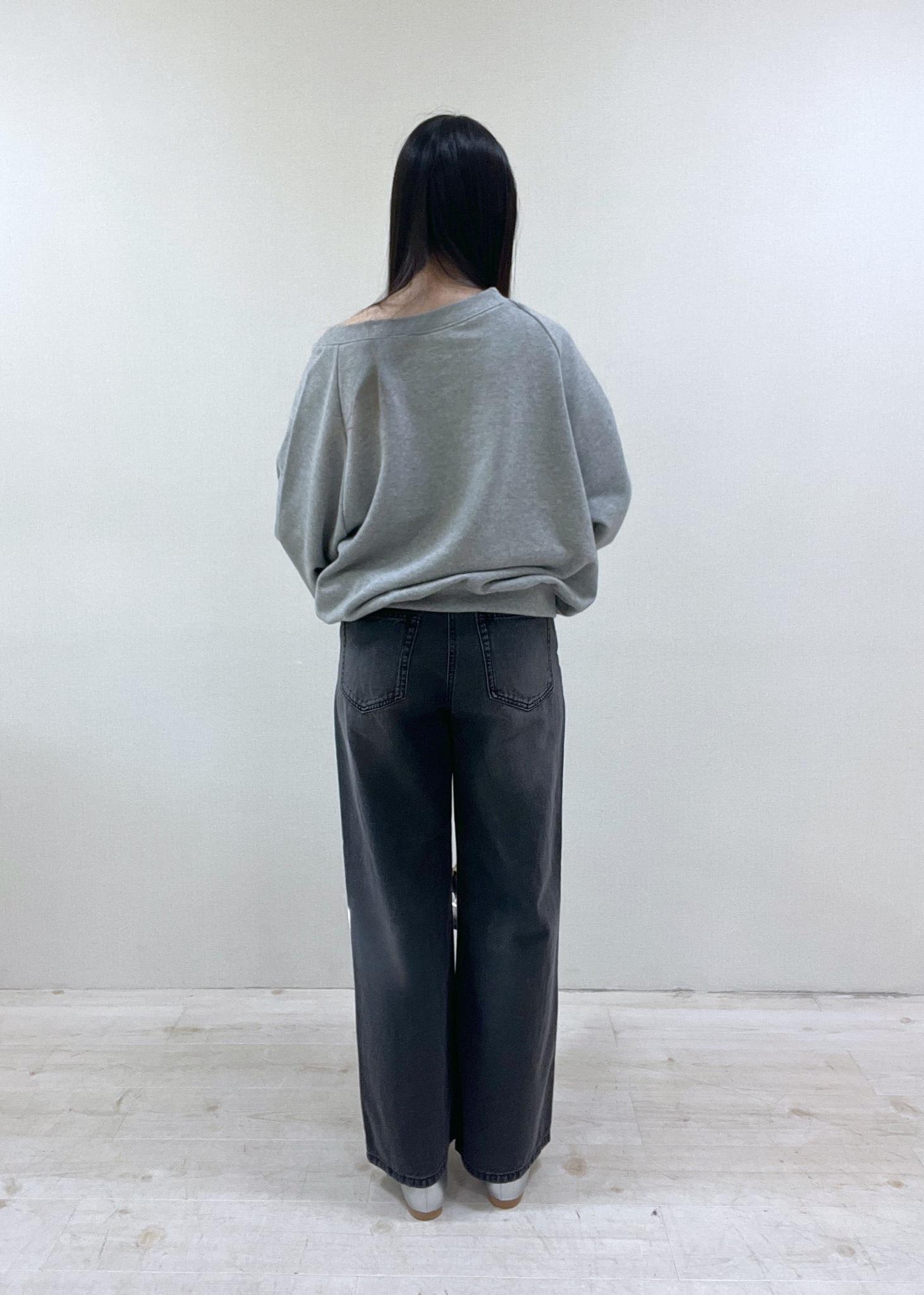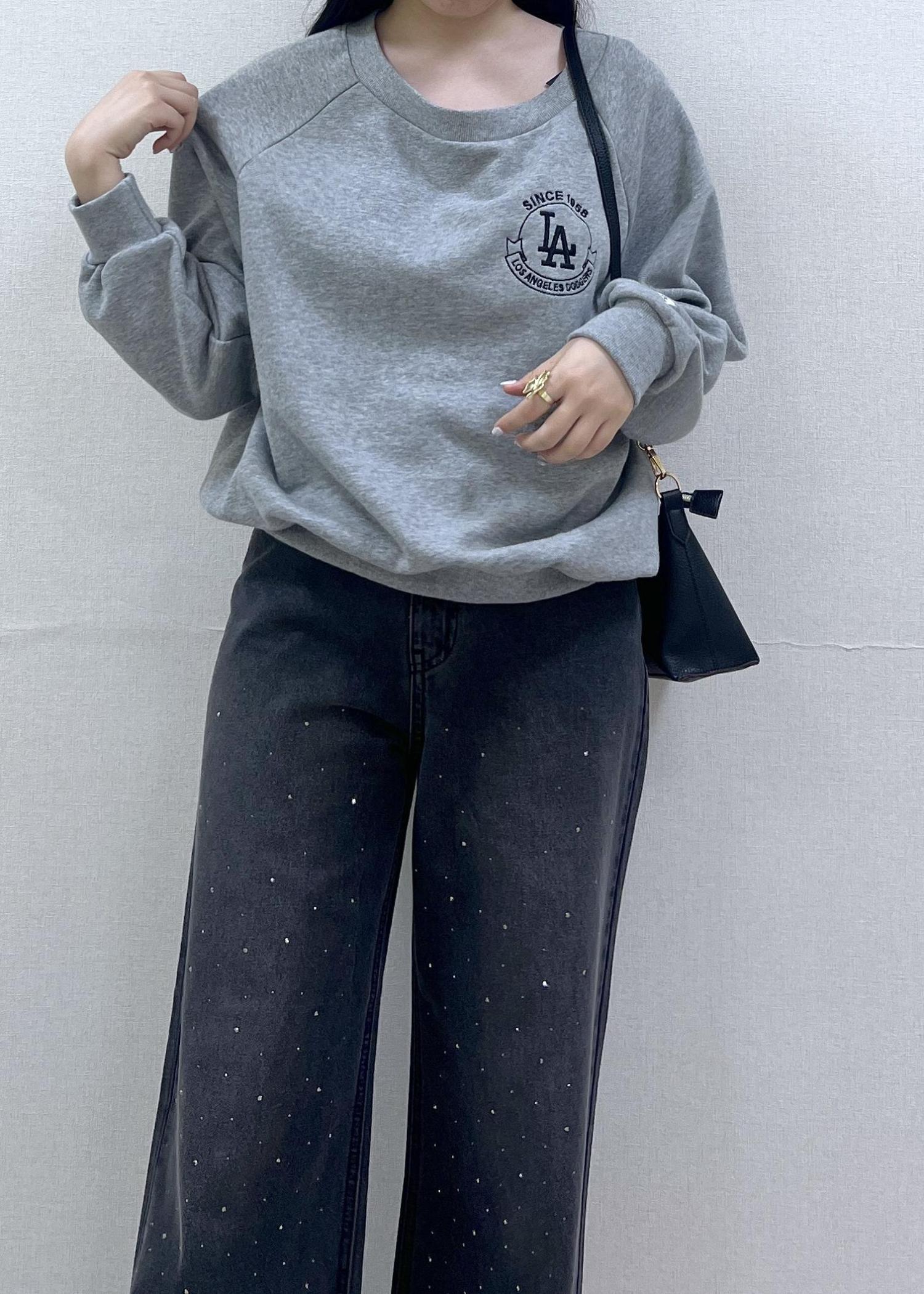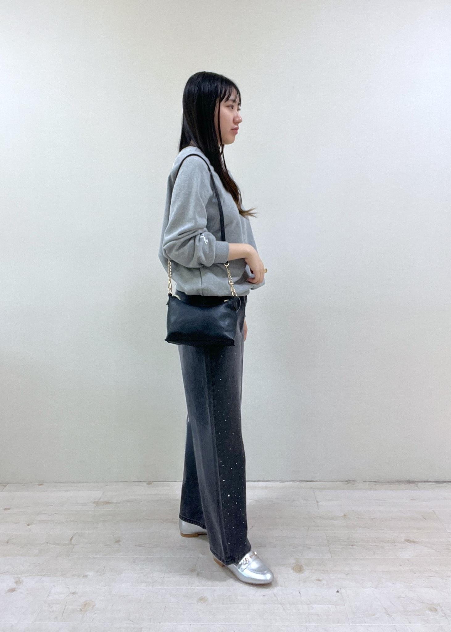 グレーのスウェットにビジューデニムを合わせてカジュアルすぎないきれいめなコーディネートです◎