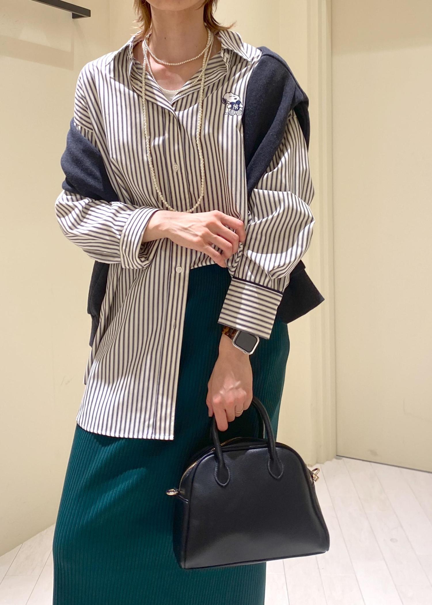 ルーズシャツをキレイ目アイテムでキレイ目カジュアルにスタイリング。スウェット肩がけで抜け感をプラス。