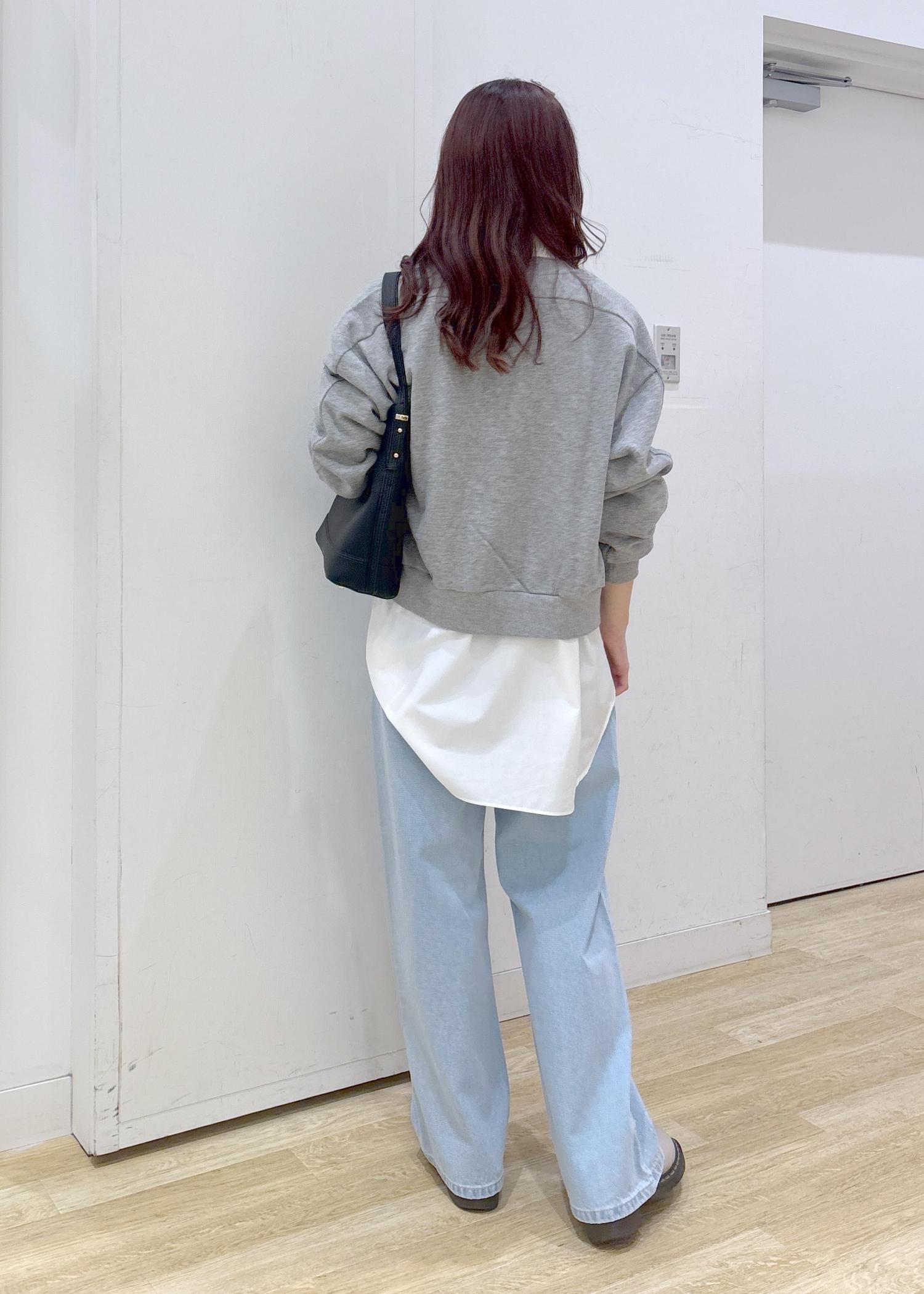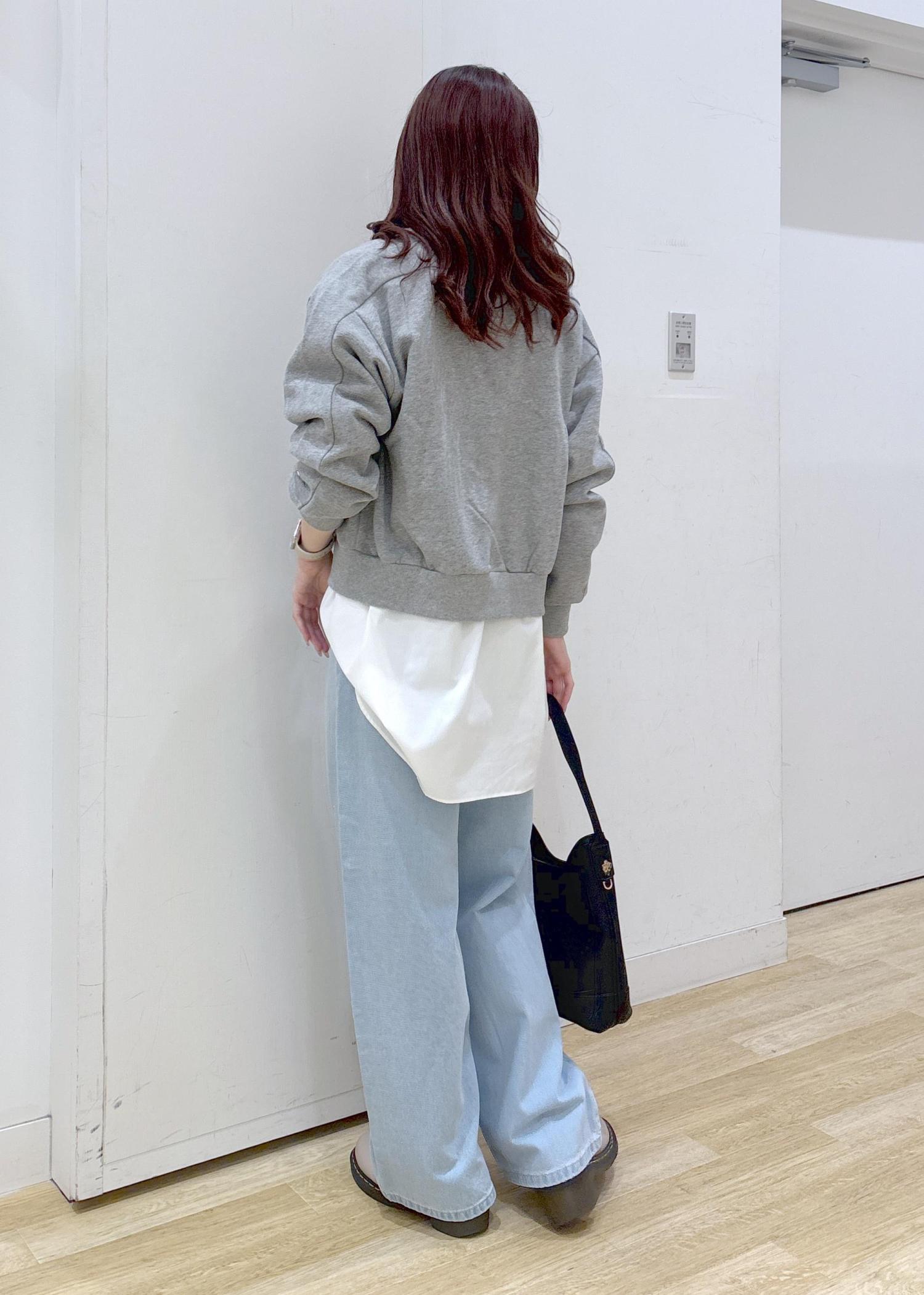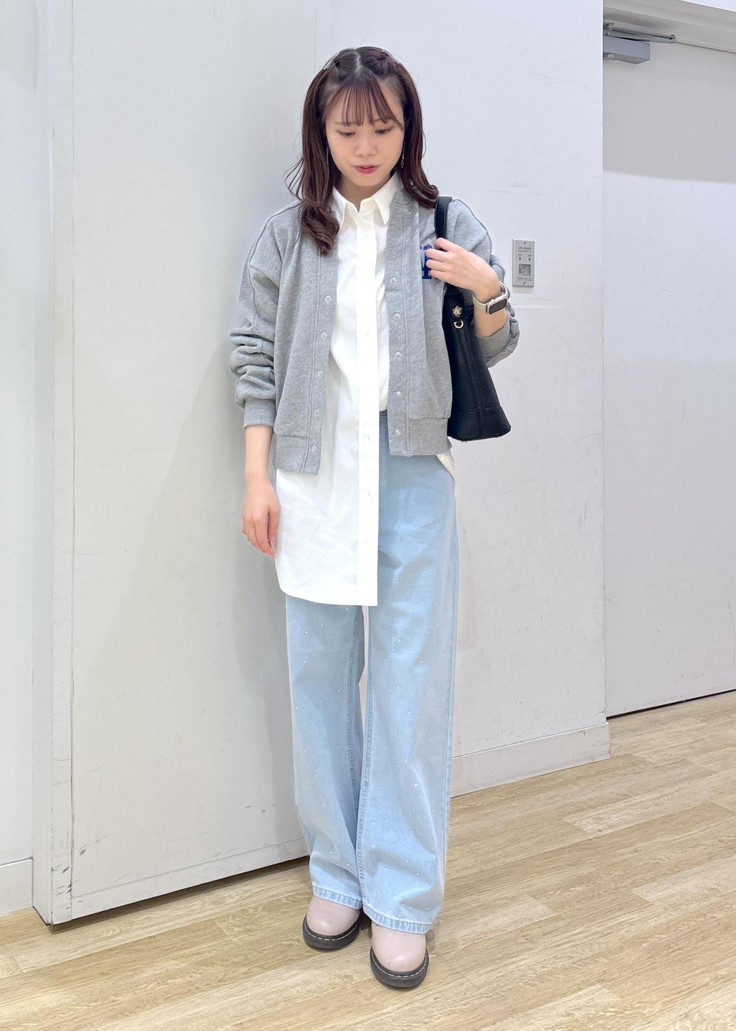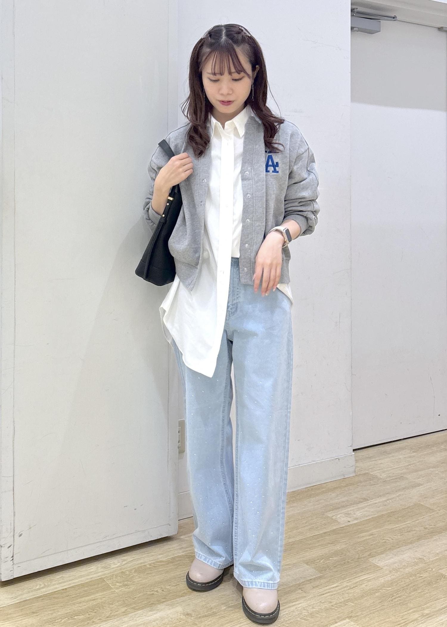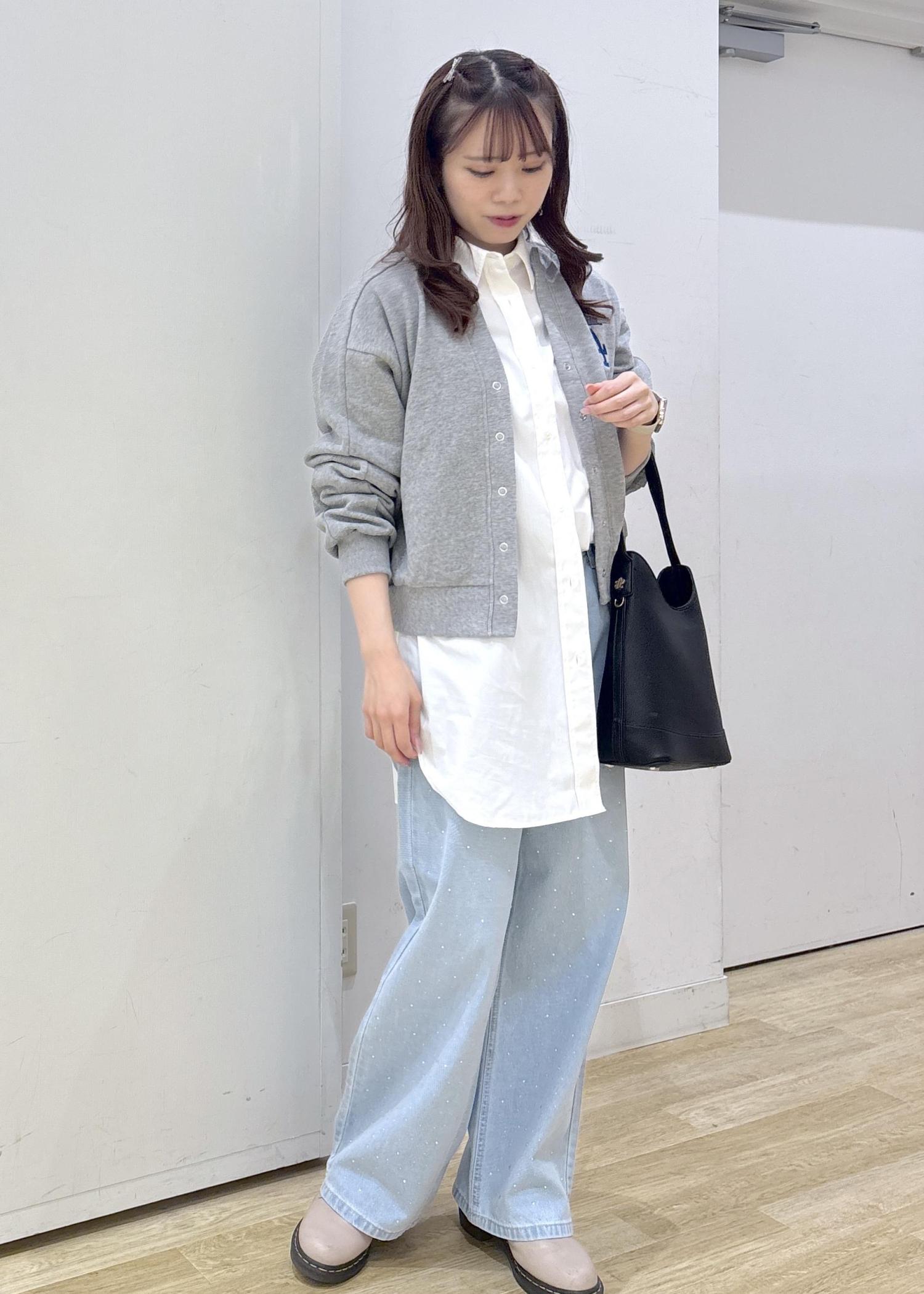 スウェットカーディガンとデニムでカジュアルにしつつ、シャツをインナーに入れることで少しキレイめな印象も取り入れました◎