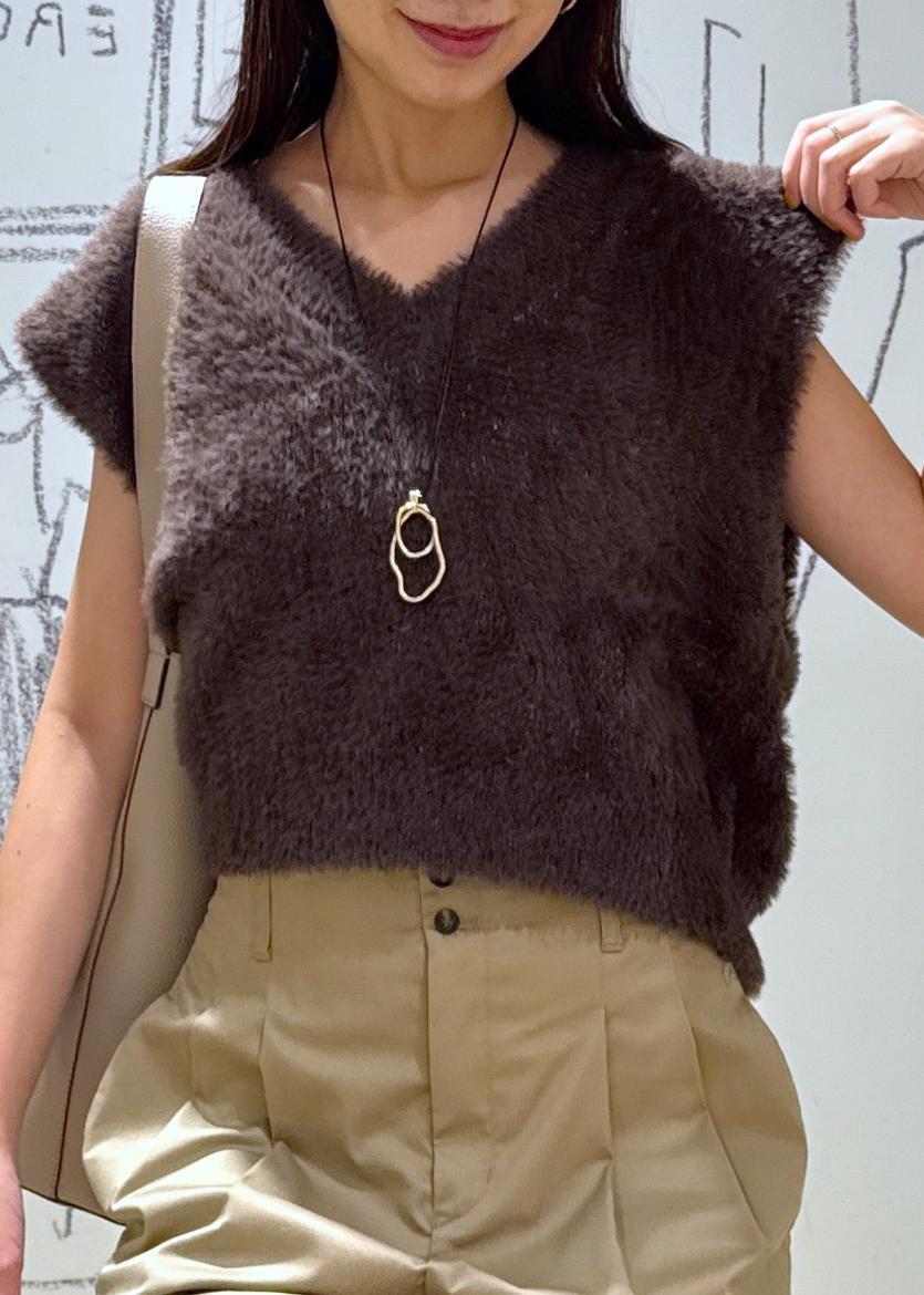 ROPÉ PICNICショートフェザーニットベストダークブラウン / F¥3,993レビュー深すぎるVネックではないので一枚着としても着られます。直接肌に触れてもチクチク感がないのも嬉しいところ。ショート丈なのでどんなボトムスとも好相性です。