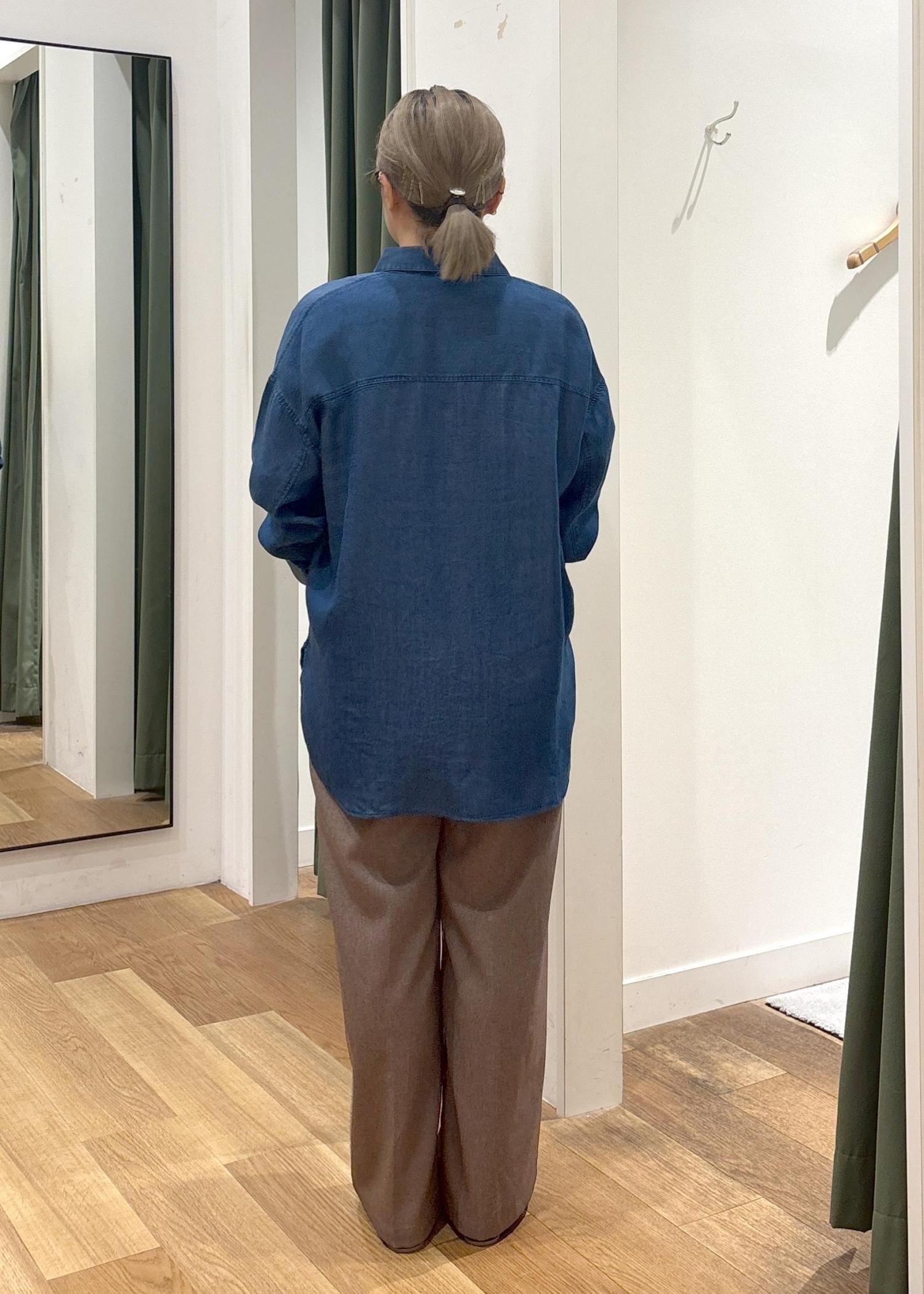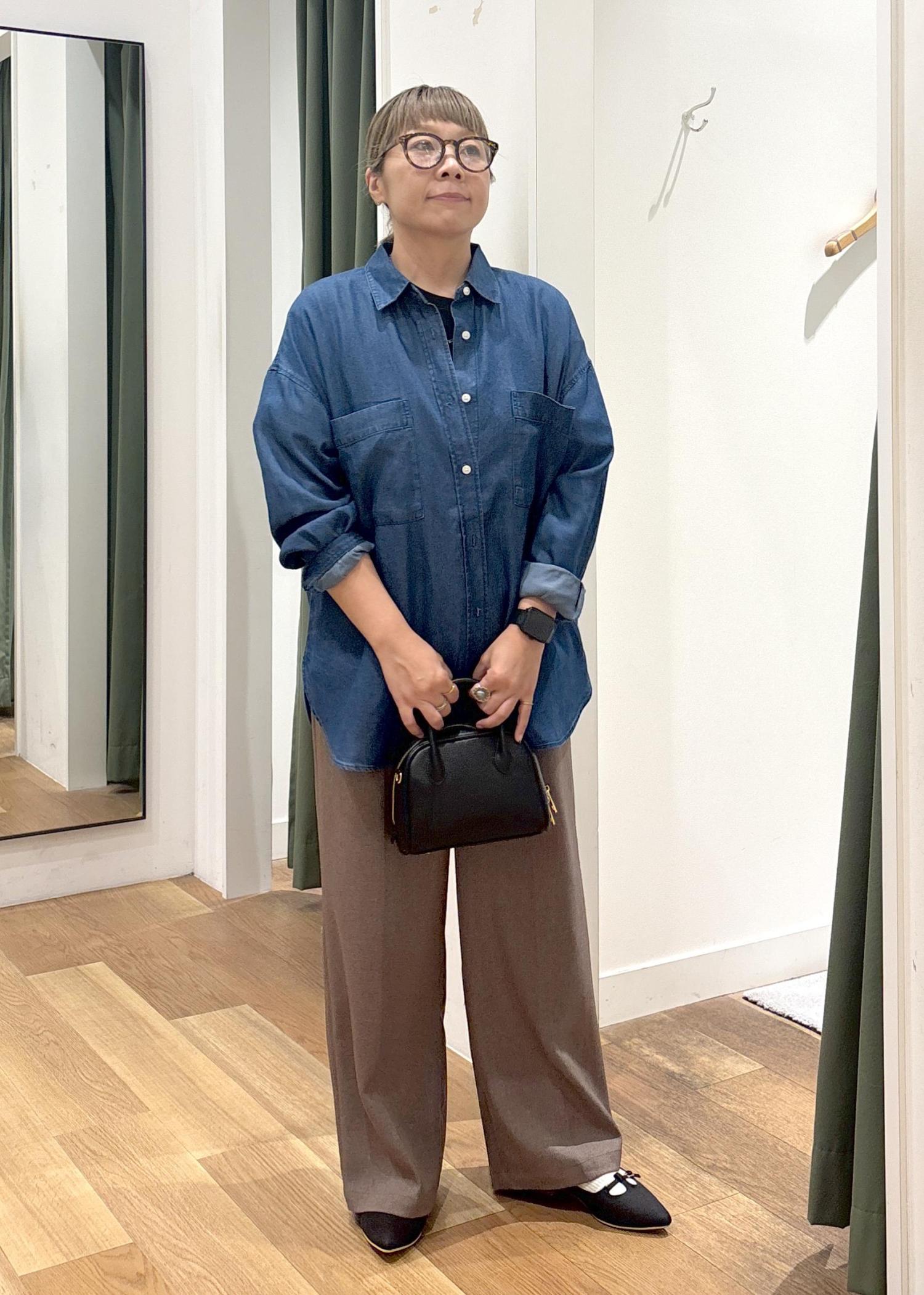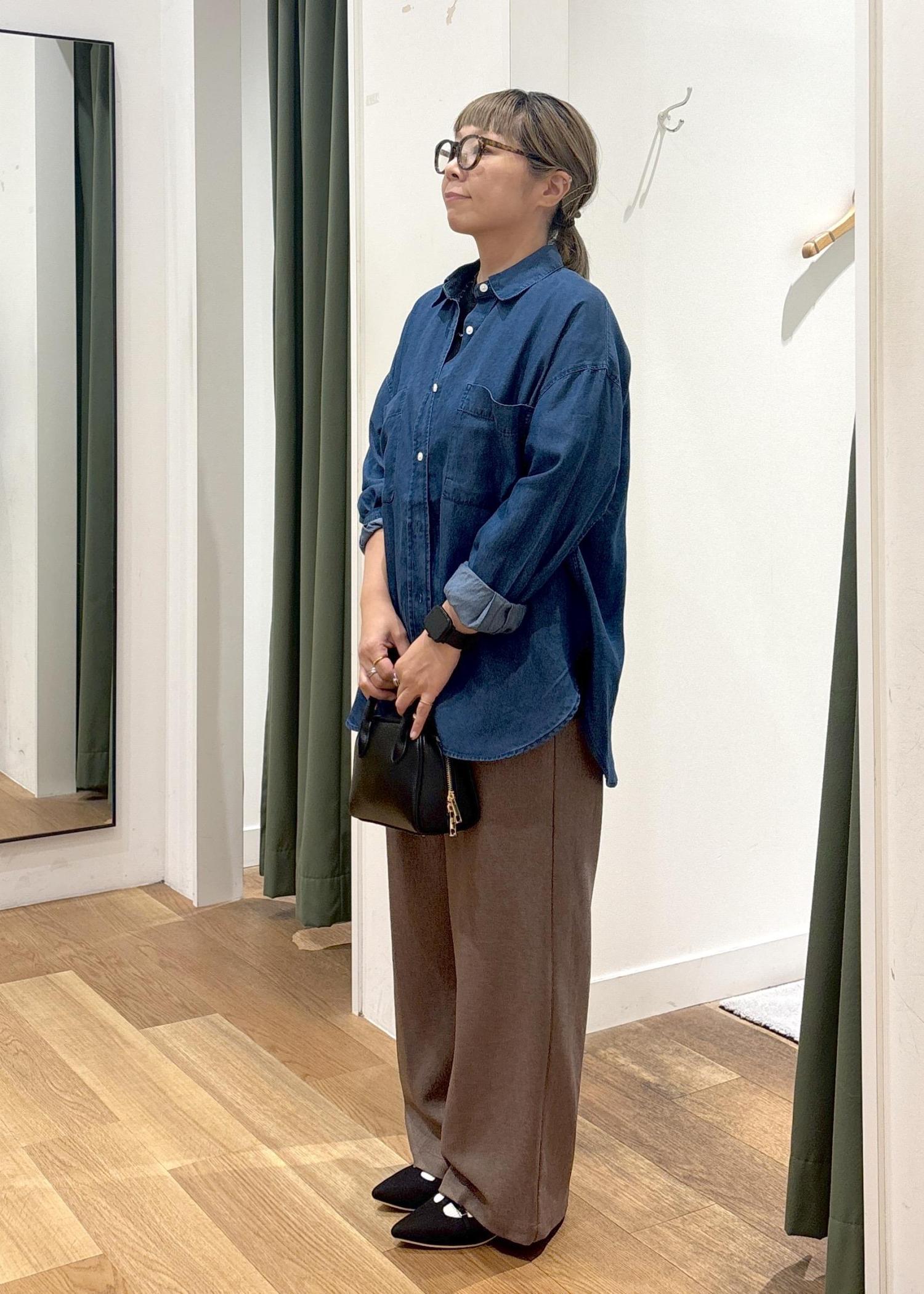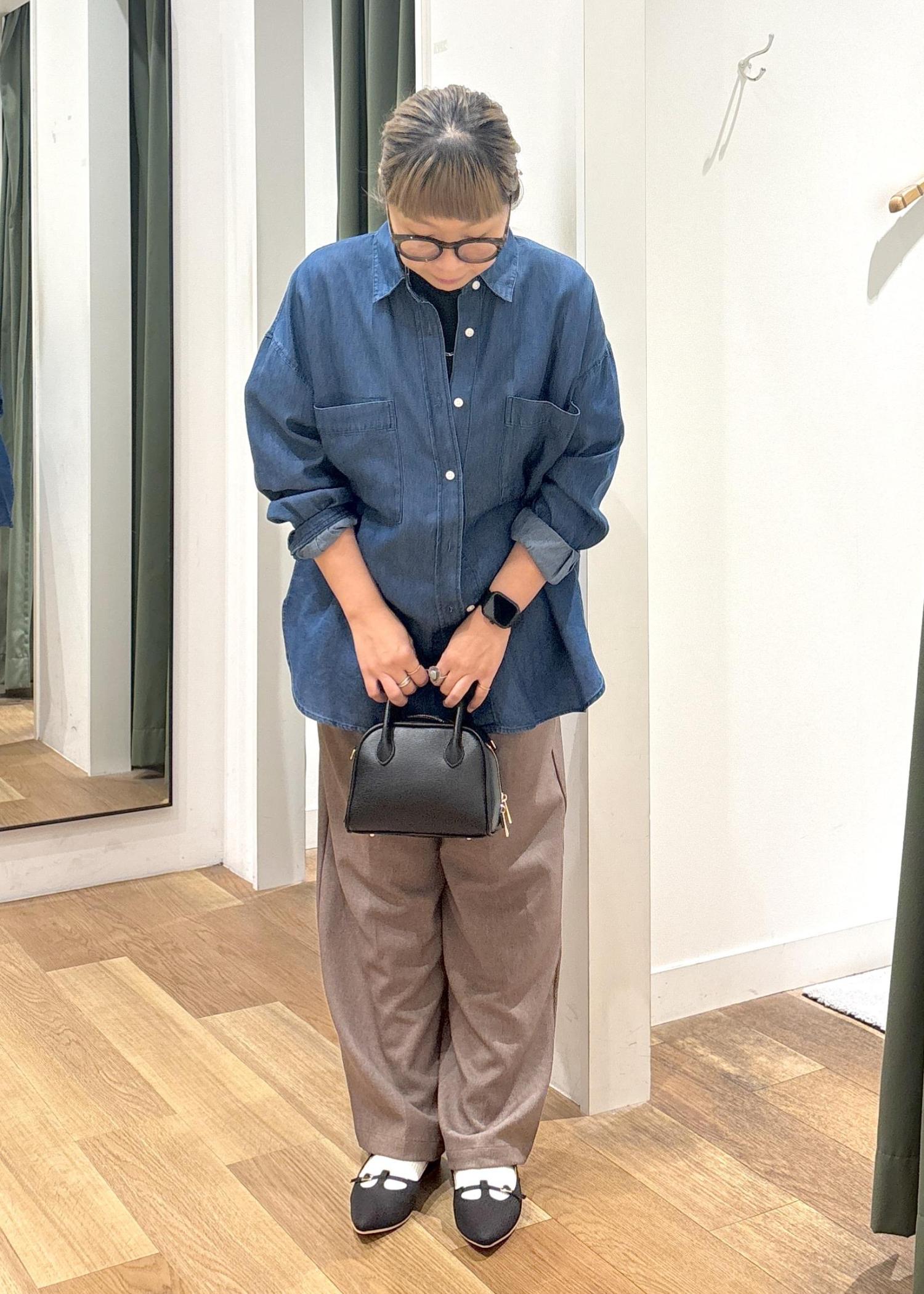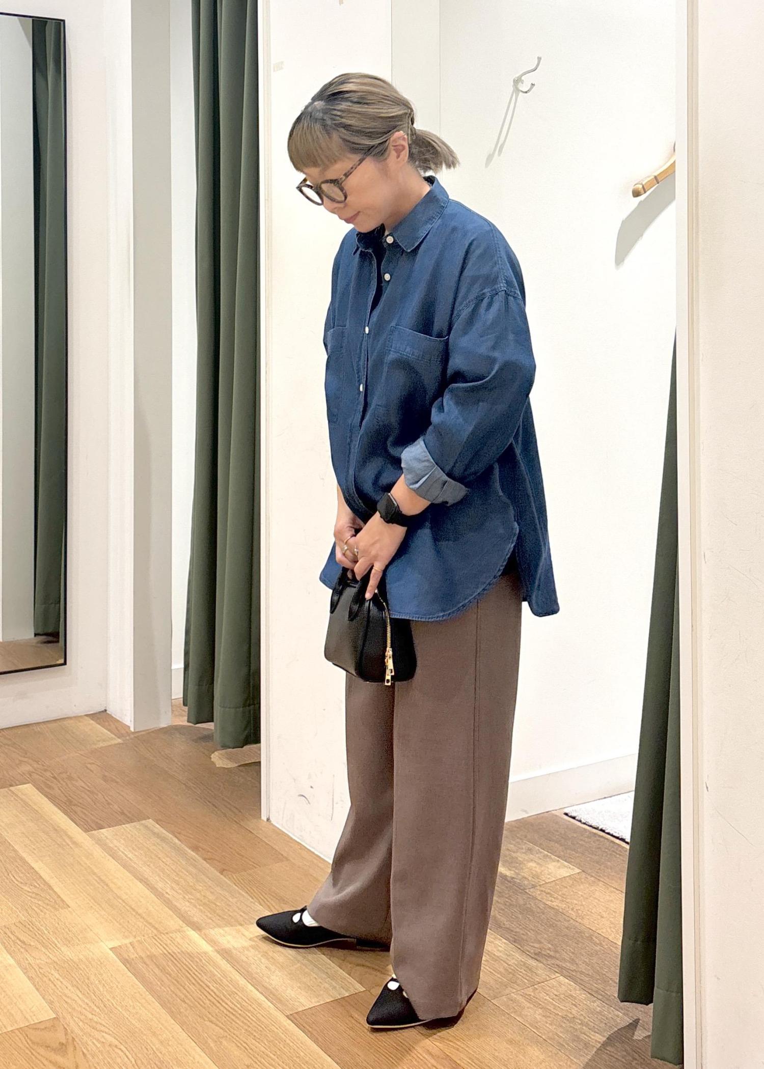 程よいオーバーサイズのシャツはカジュアルになりがちなので、綺麗めなパンツやパンプスを取り入れると綺麗めカジュアルなスタイリングになるのでオススメです☺︎
