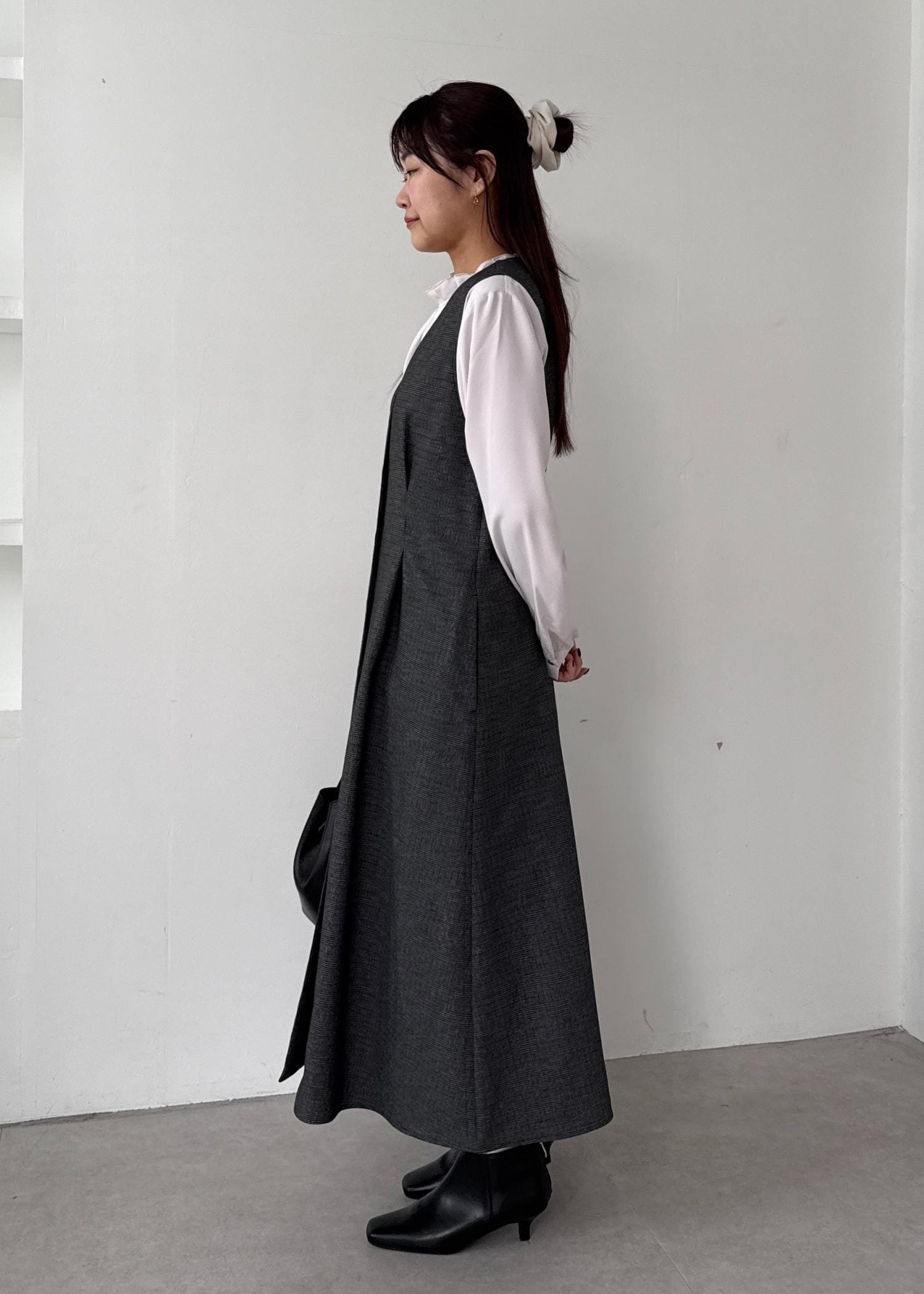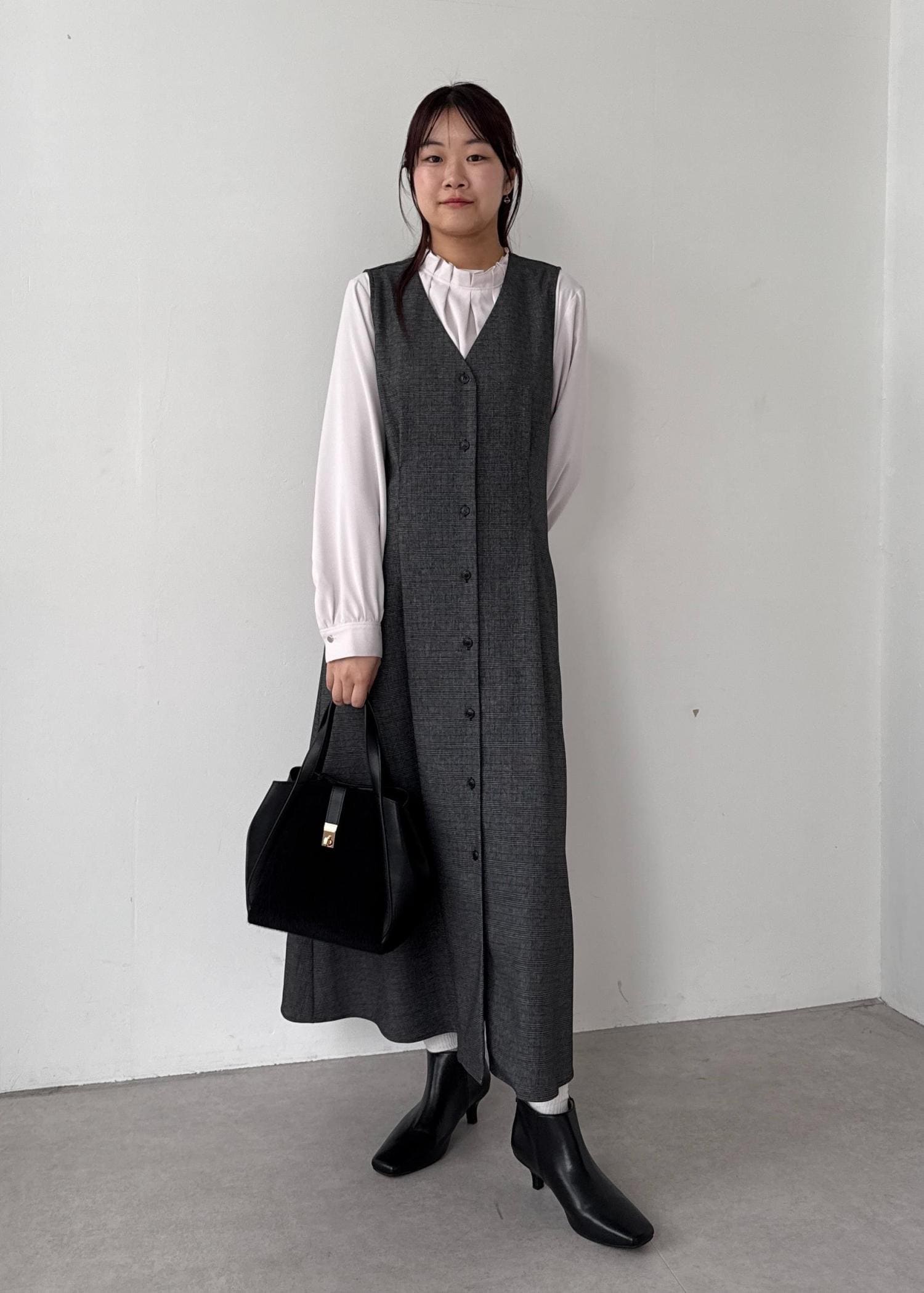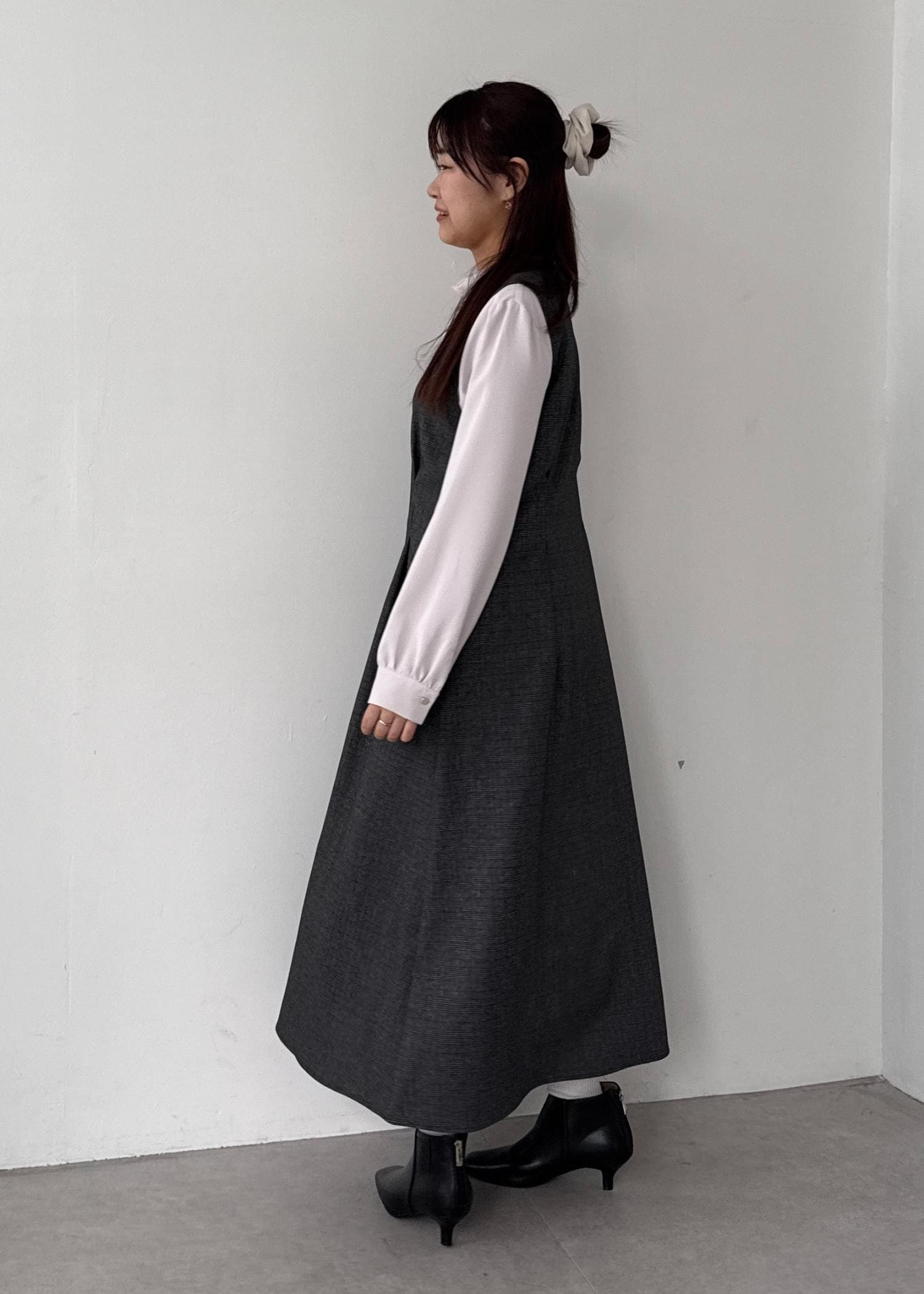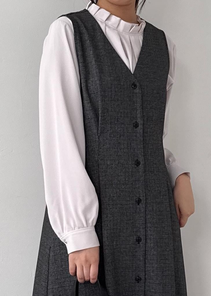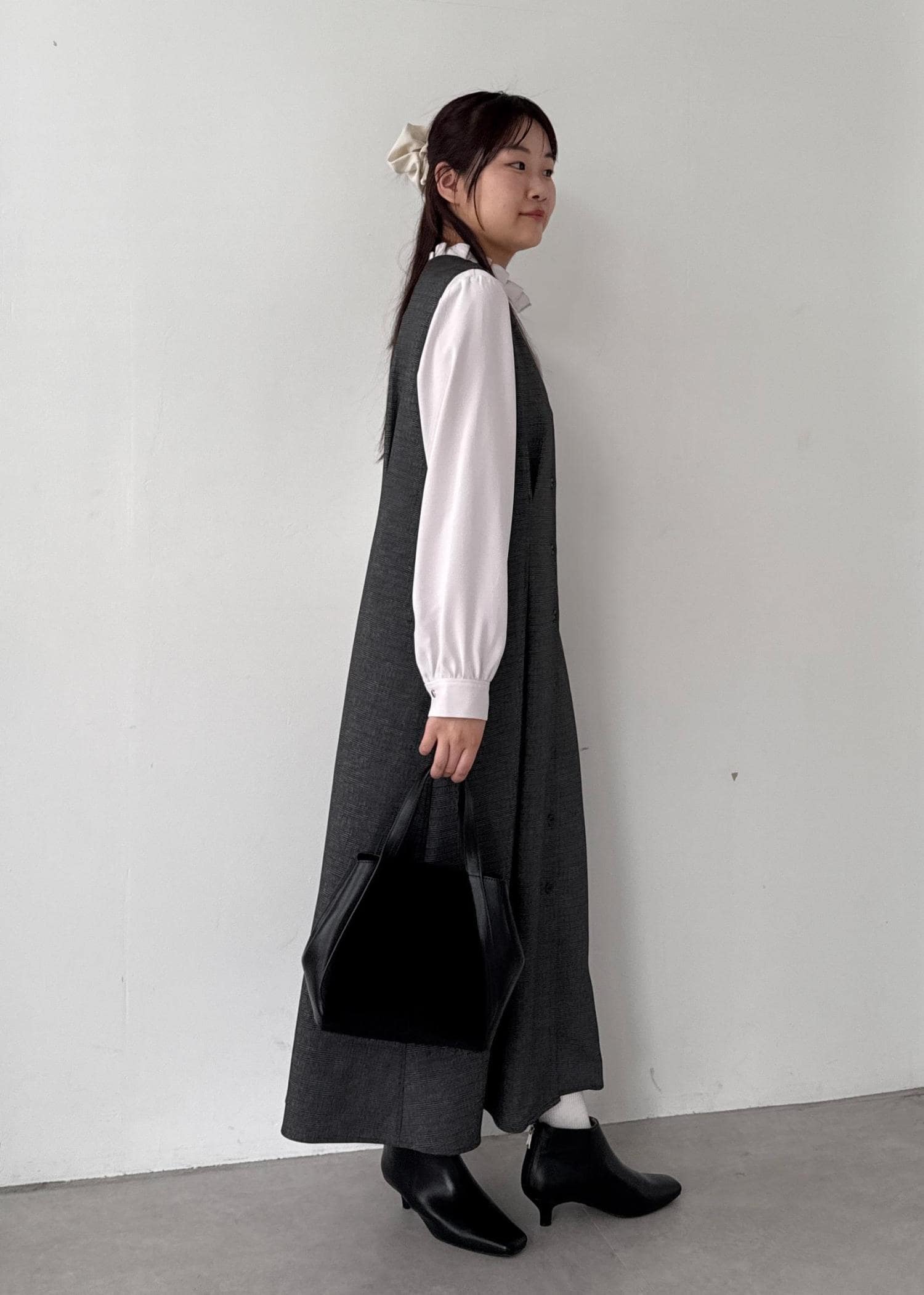 シックなカラーのジャンパースカートにローズピンクのブラウスを合わせたきれいめコーデにしました。