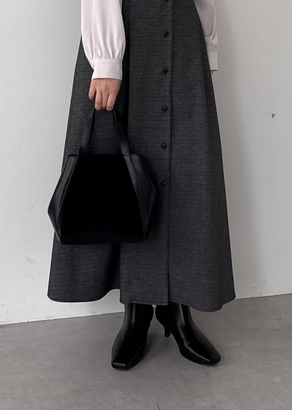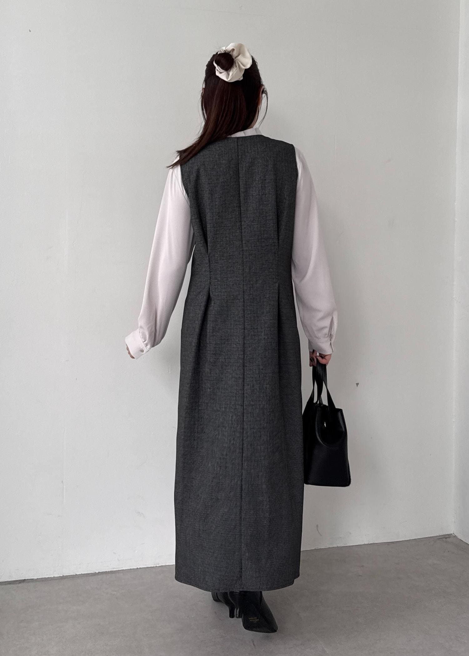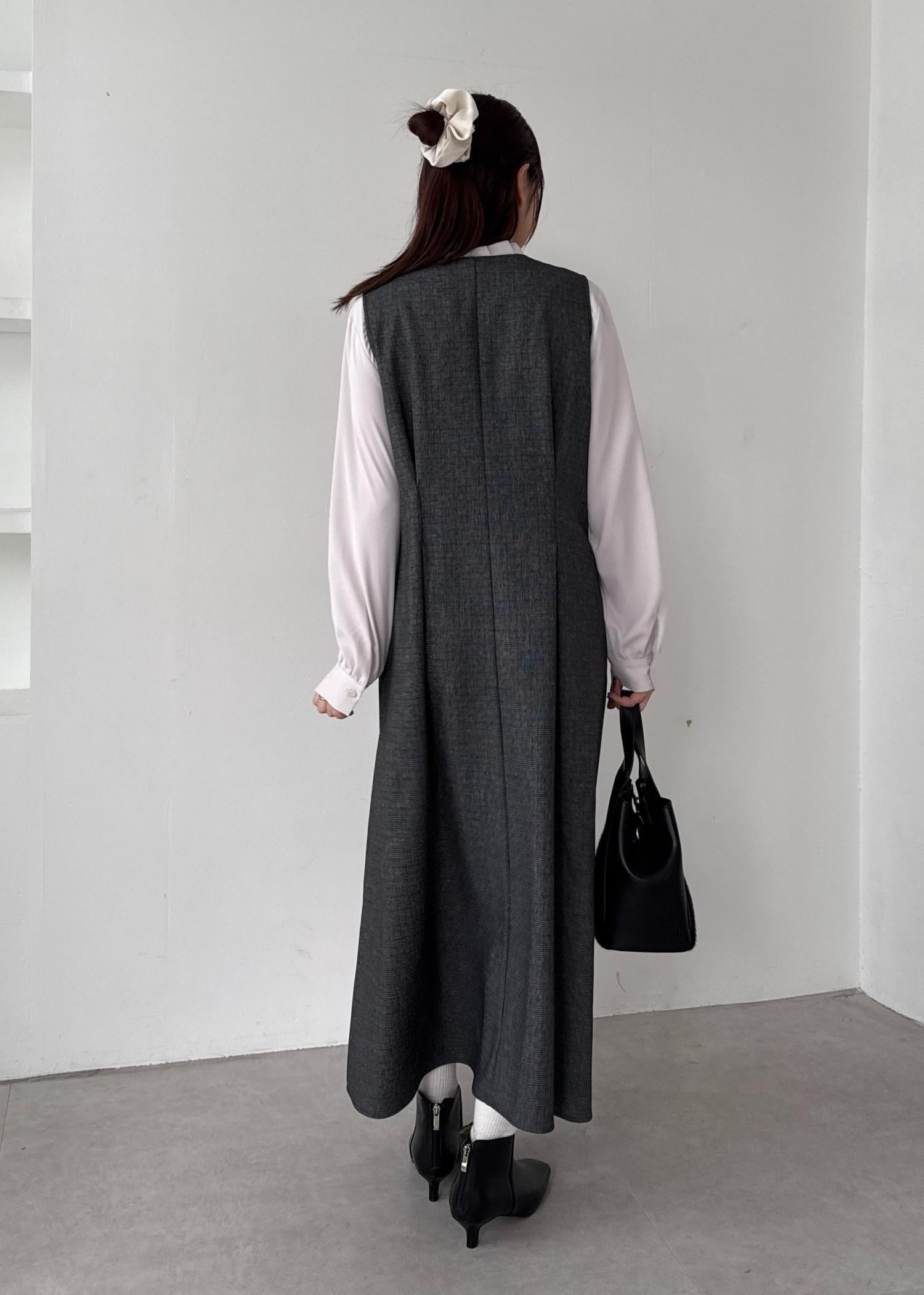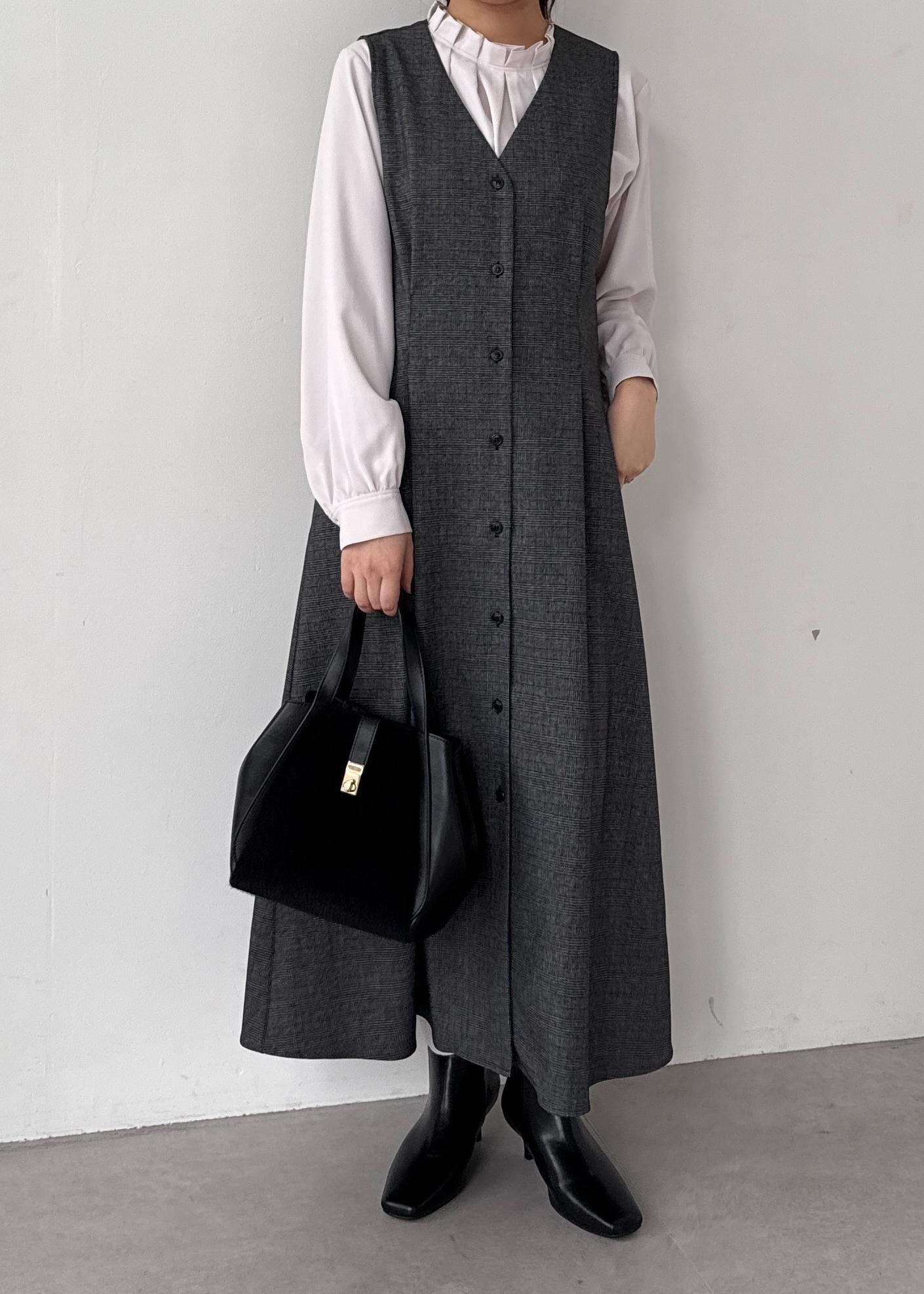 シックなカラーのジャンパースカートにローズピンクのブラウスを合わせたきれいめコーデにしました。