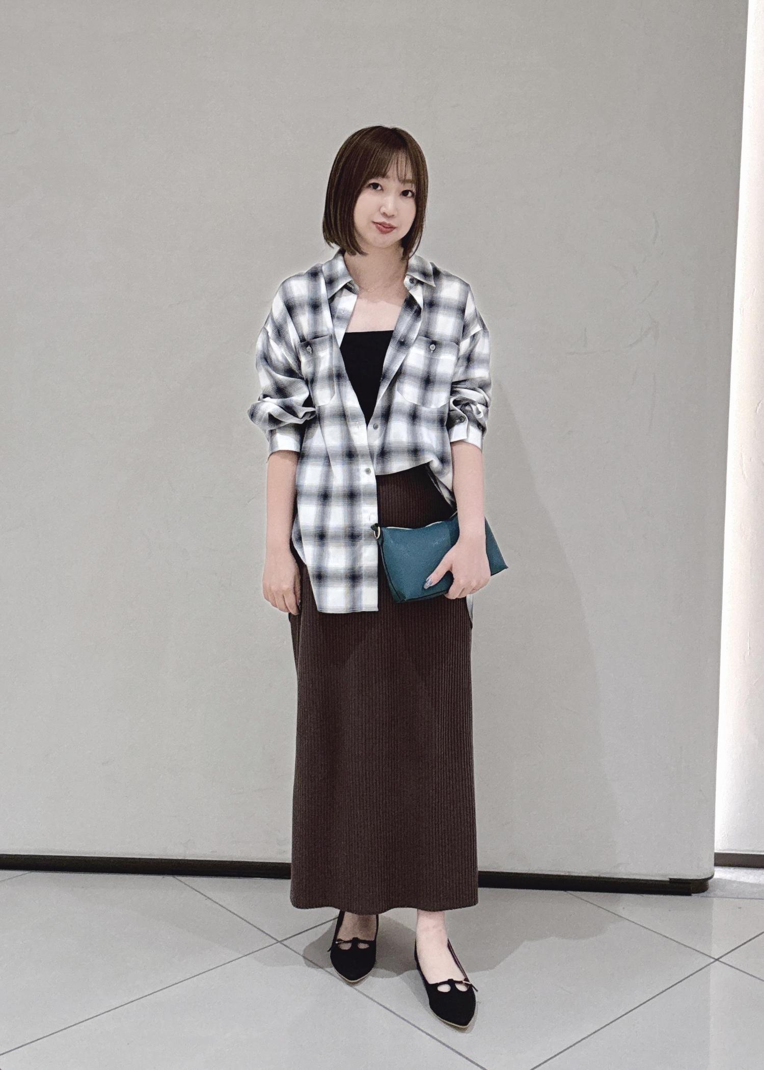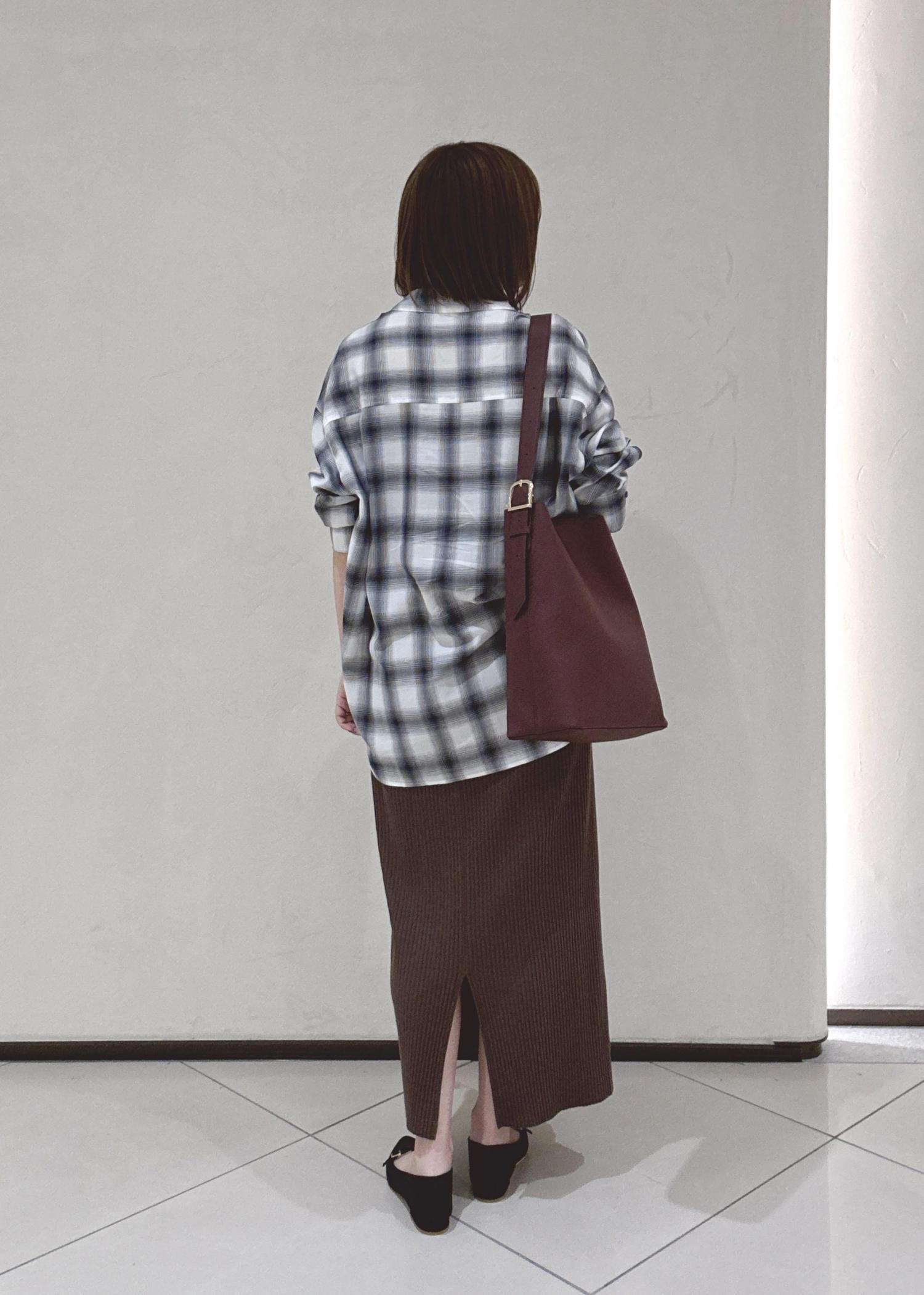 タイトスカートと合わせてカジュアルすぎず、女性らしいコーデに。シャツを片方だけインしてこなれ感を出しました。