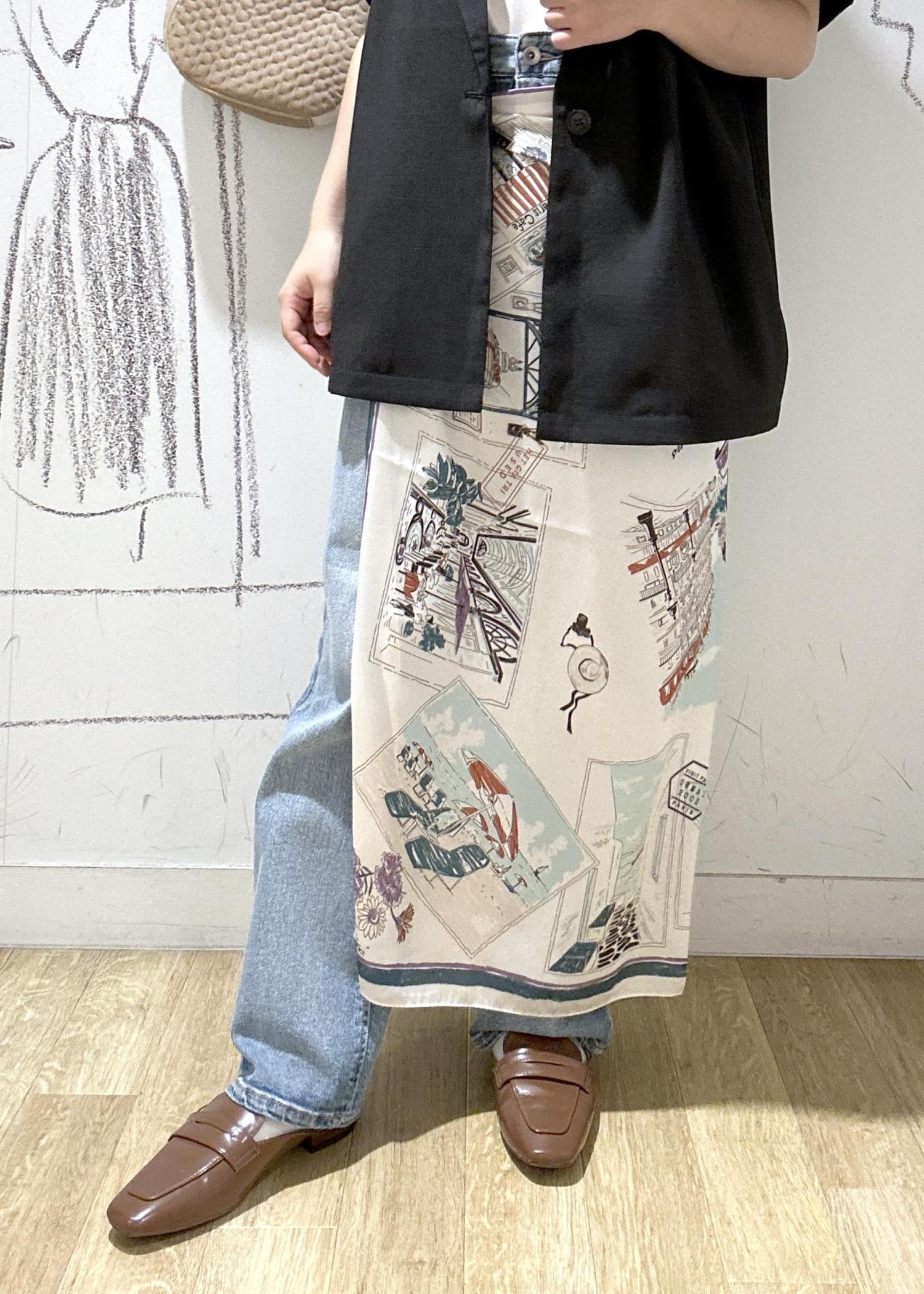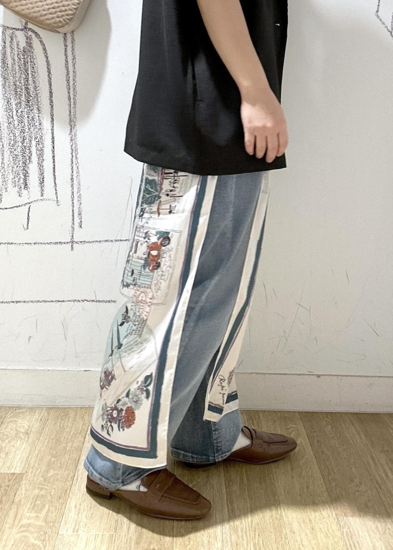 デニムにスカーフを巻きつけて、トレンド感をプラスした、大人可愛いスタイル。