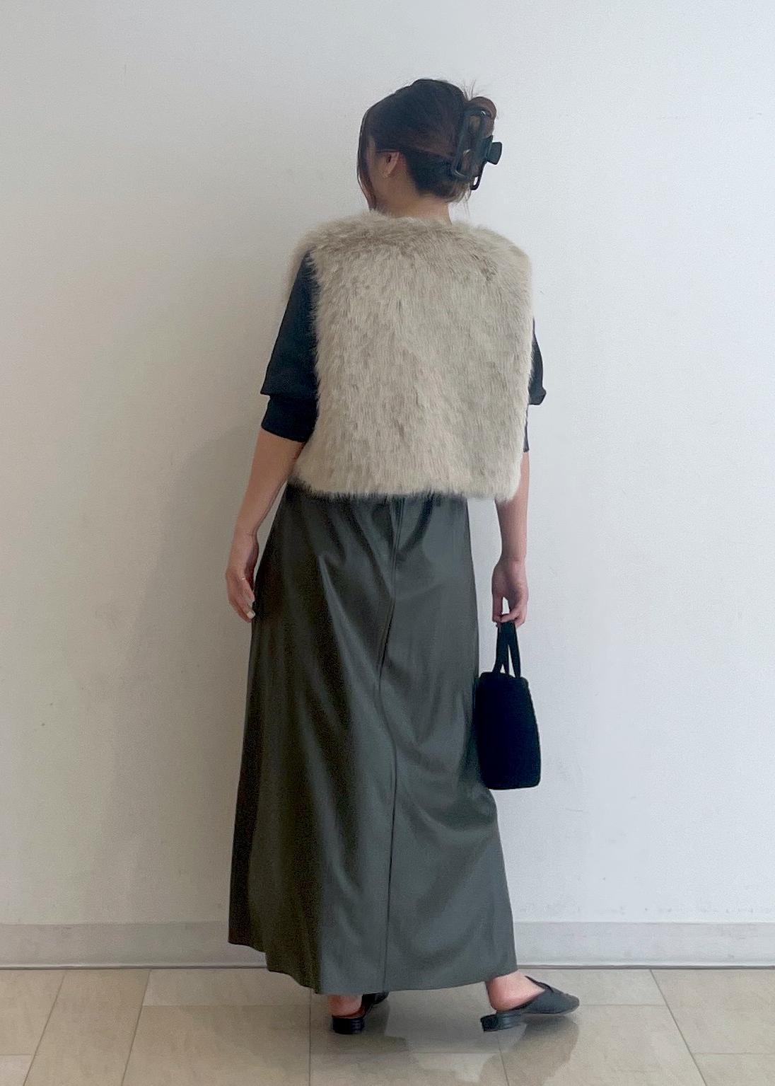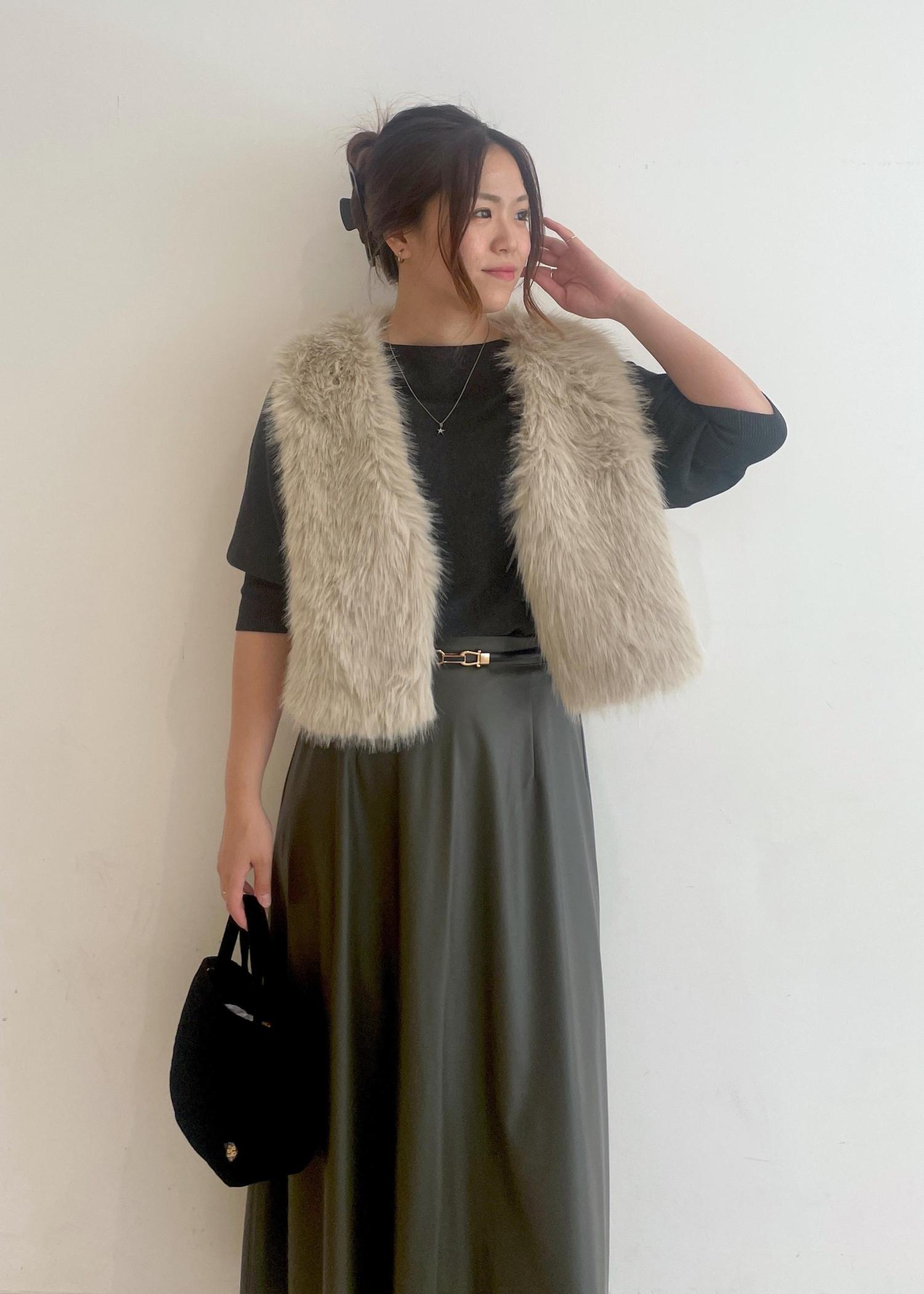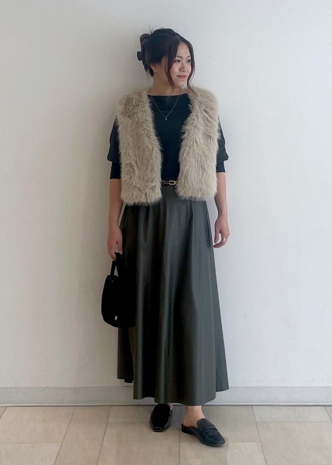 シンセティックレザーのスカートとファーベストを合わせた、大人の華やかコーデです!