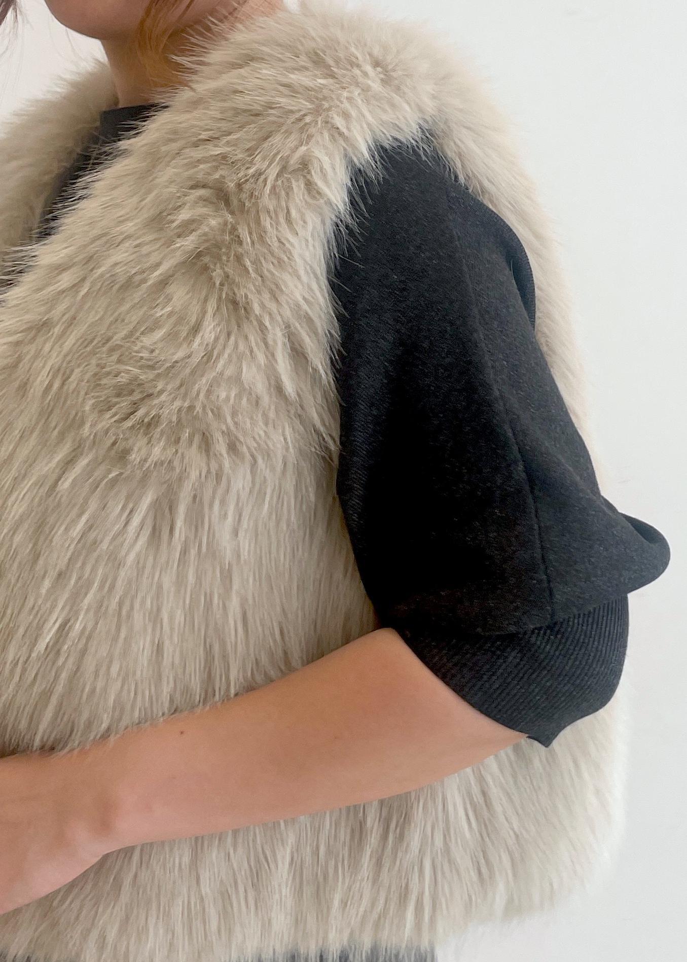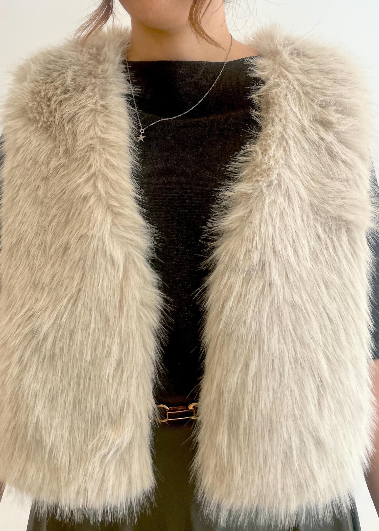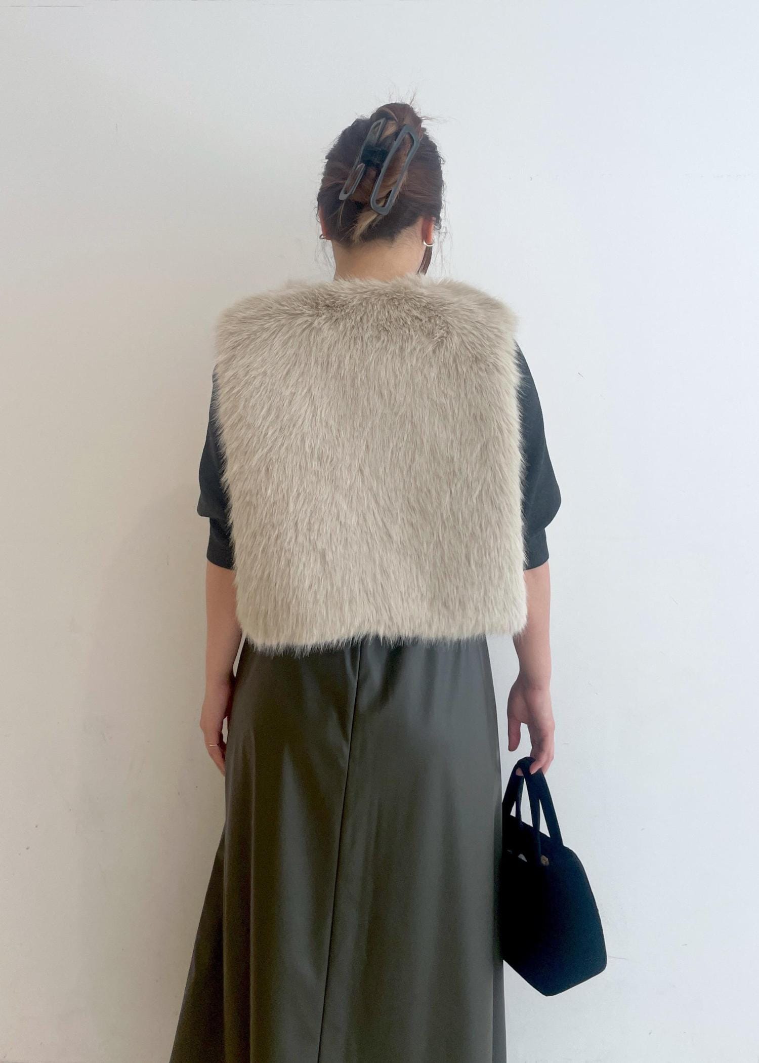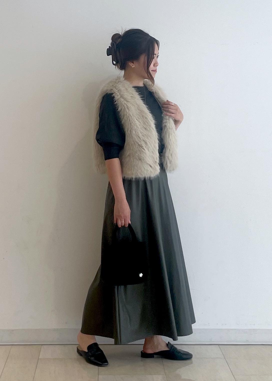 シンセティックレザーのスカートとファーベストを合わせた、大人の華やかコーデです!