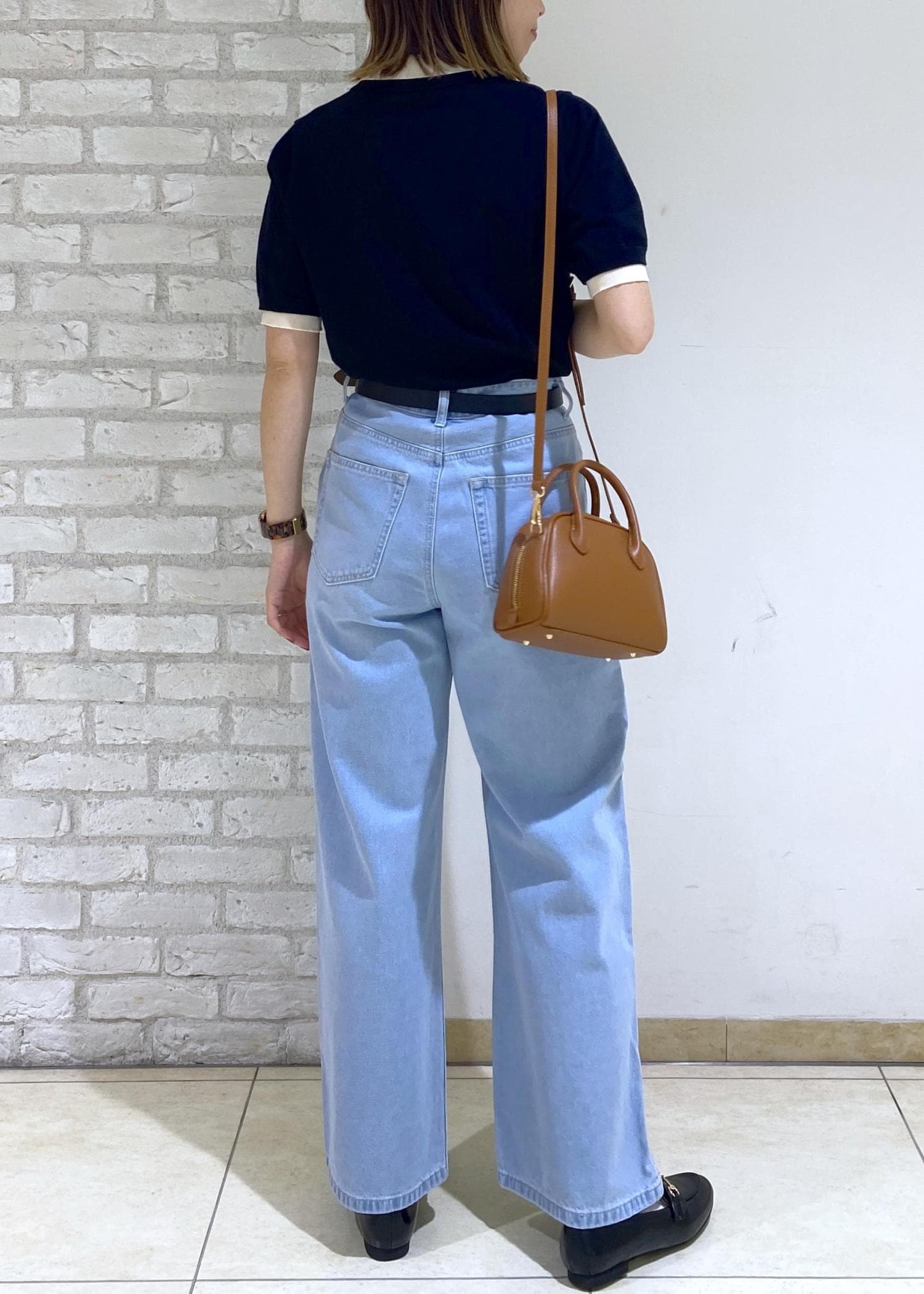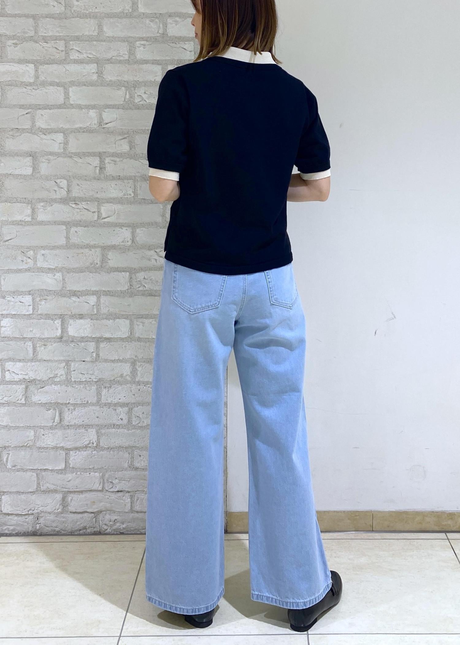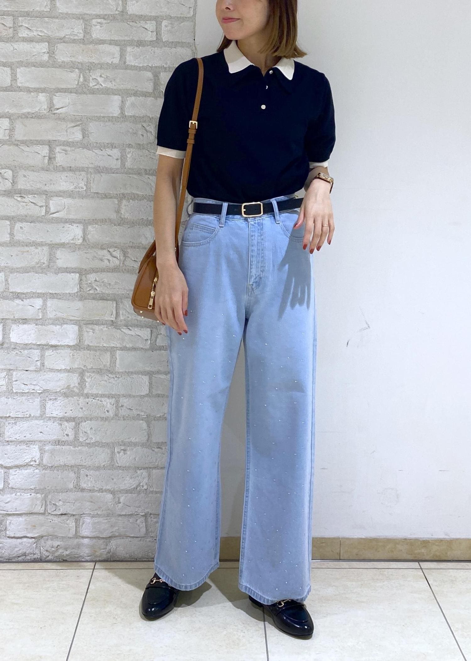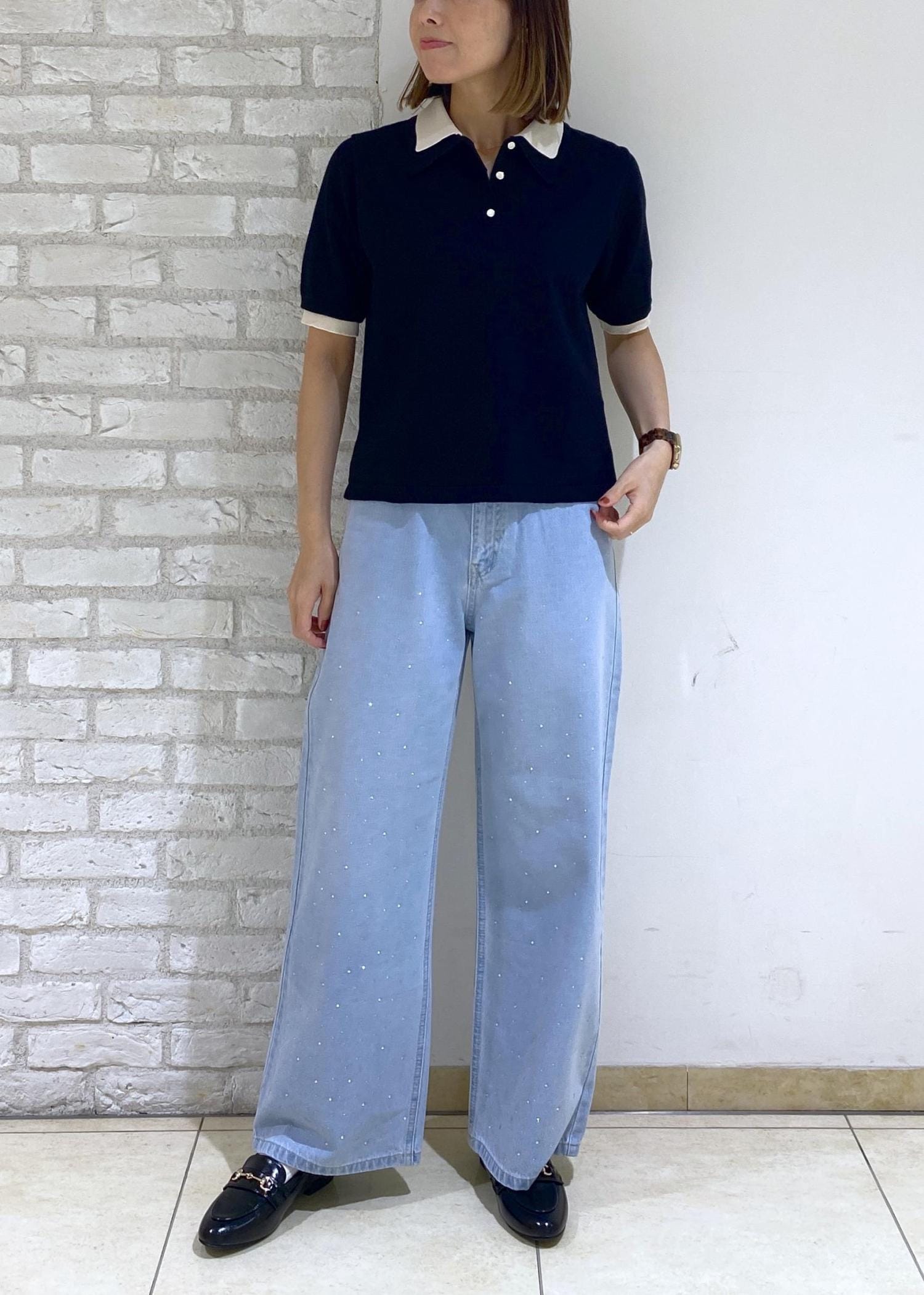 ブラックのポロニットにビジューデニムを合わせた