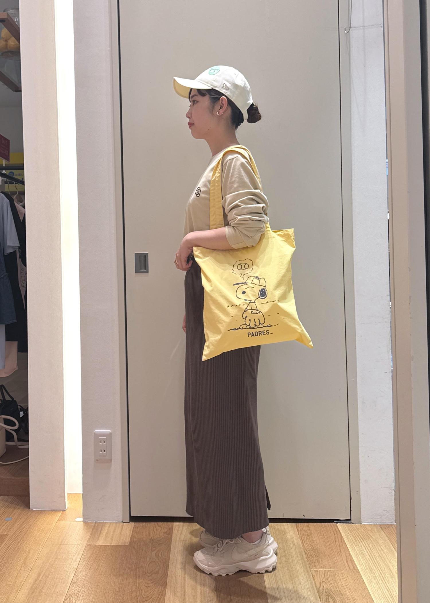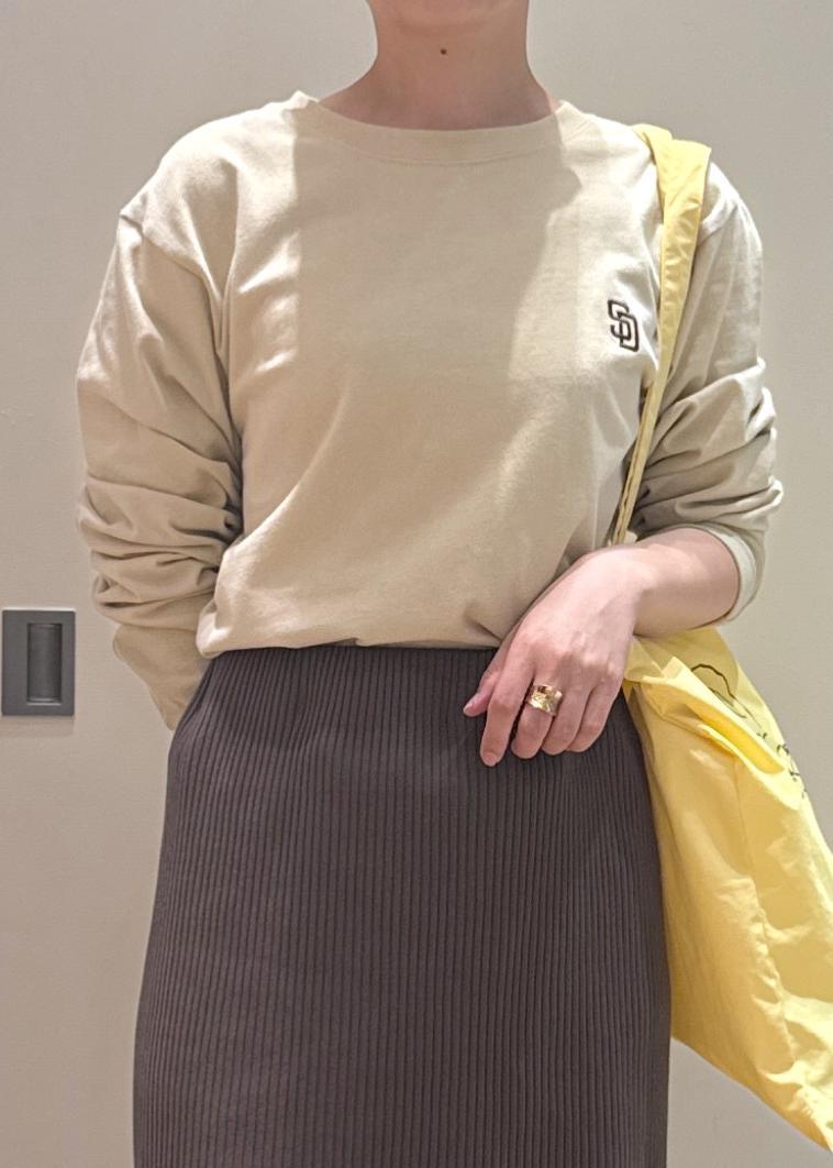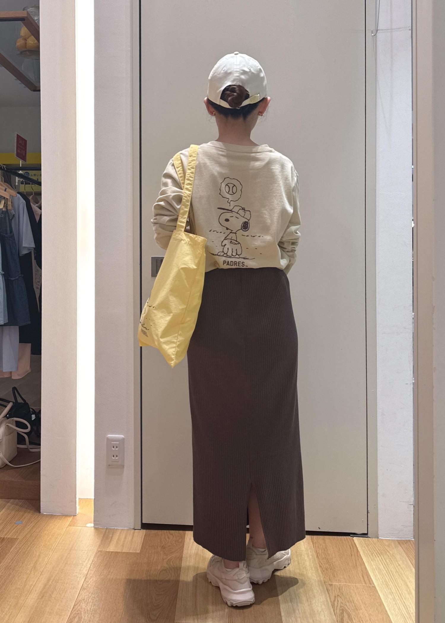 PEANUTS × MLB COLLECTION BY ROPÉ PICNICのロンTに、タイトスカートを合わせたカジュアルコーデです。