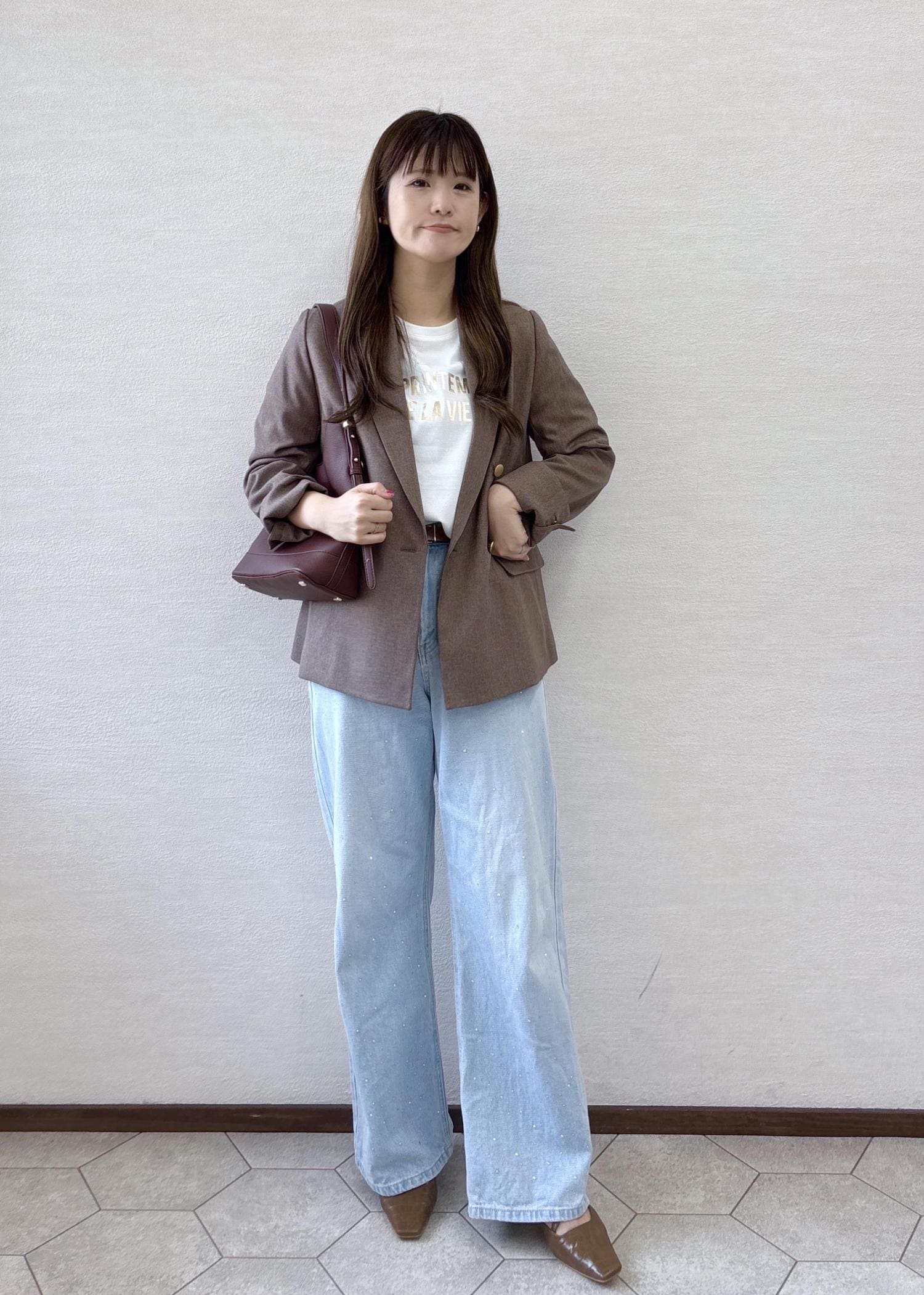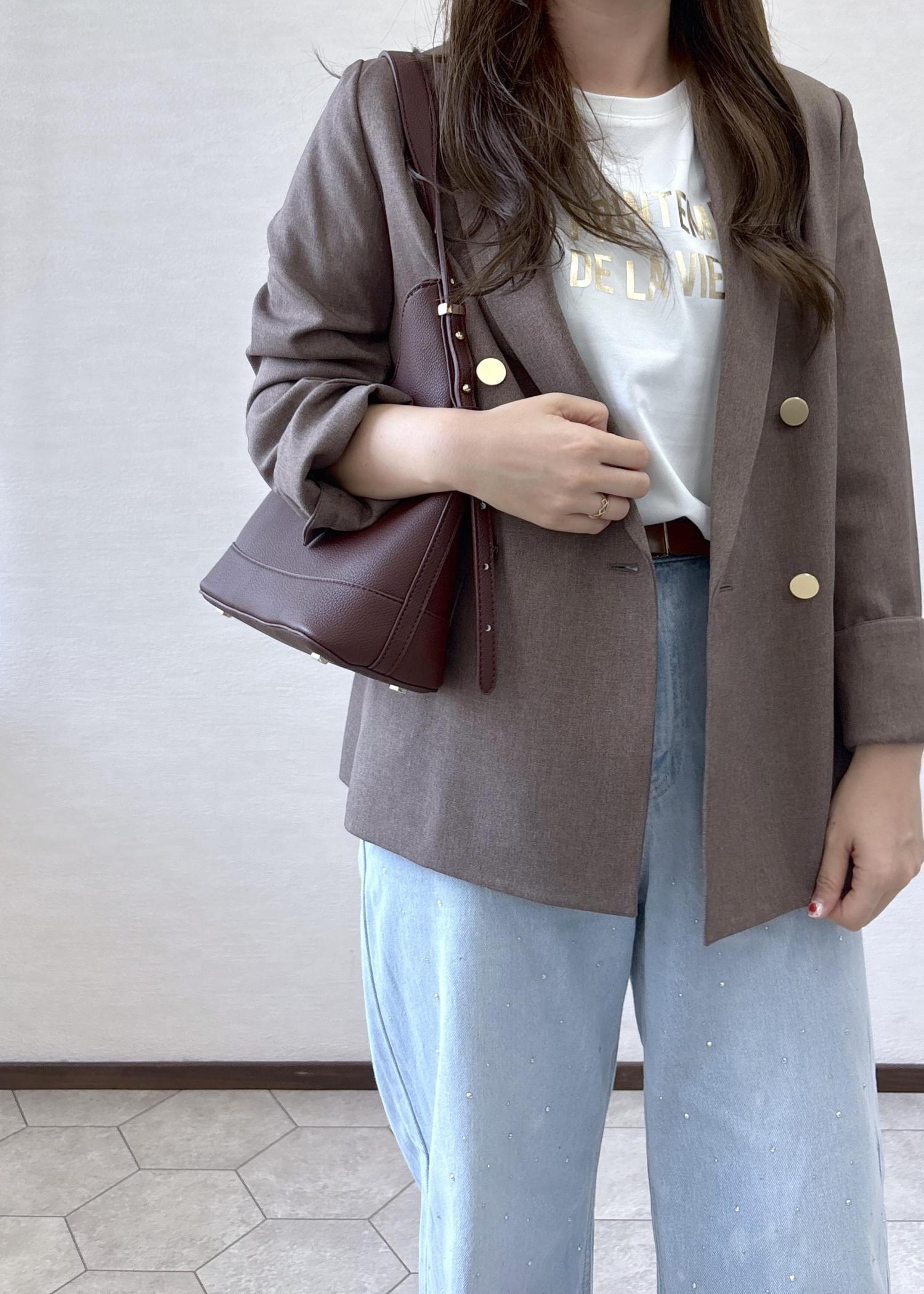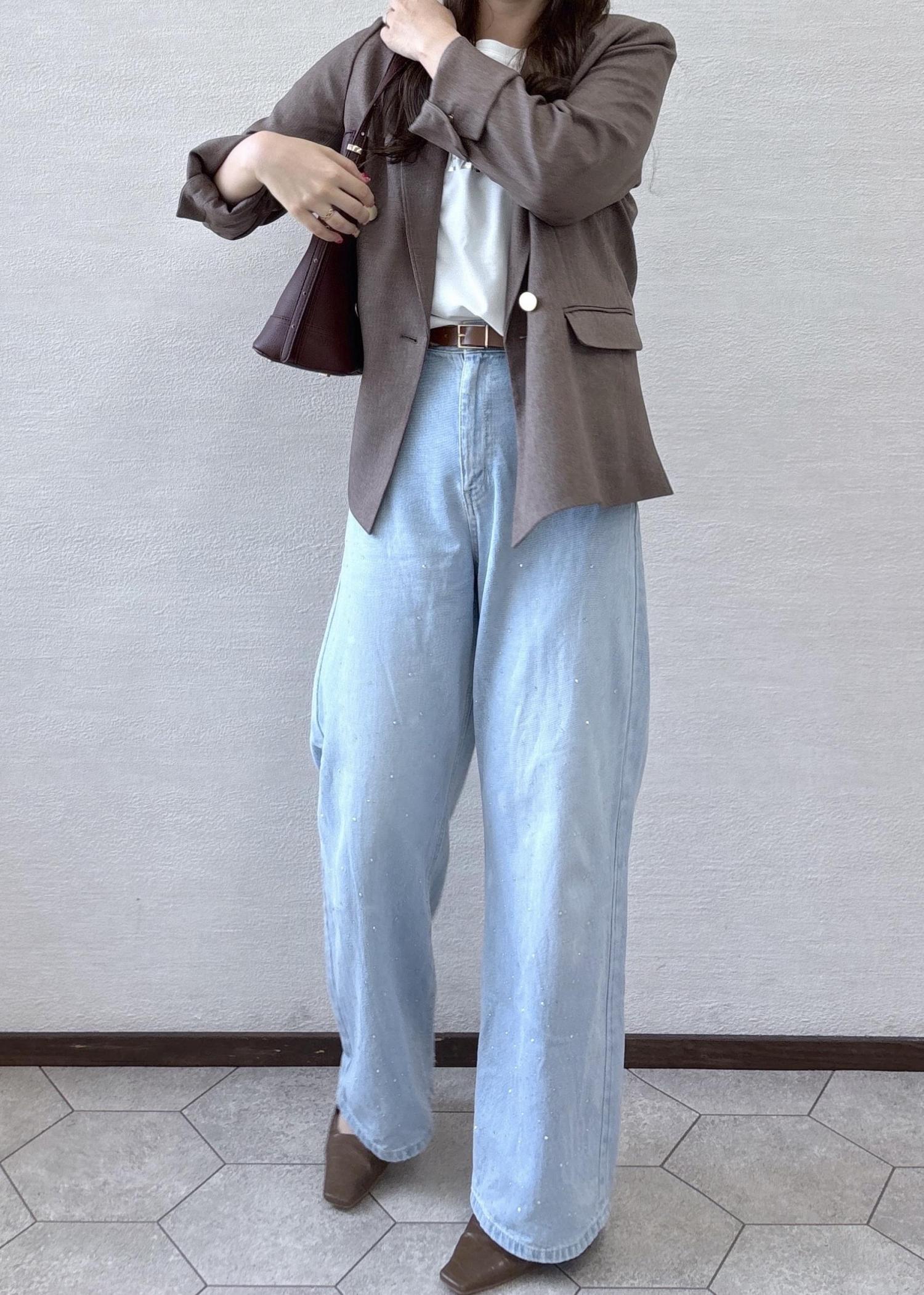 きれいめのジャケットを、かちっとかたくなりすぎないようデニムあわせにし、カジュアルダウンしました。