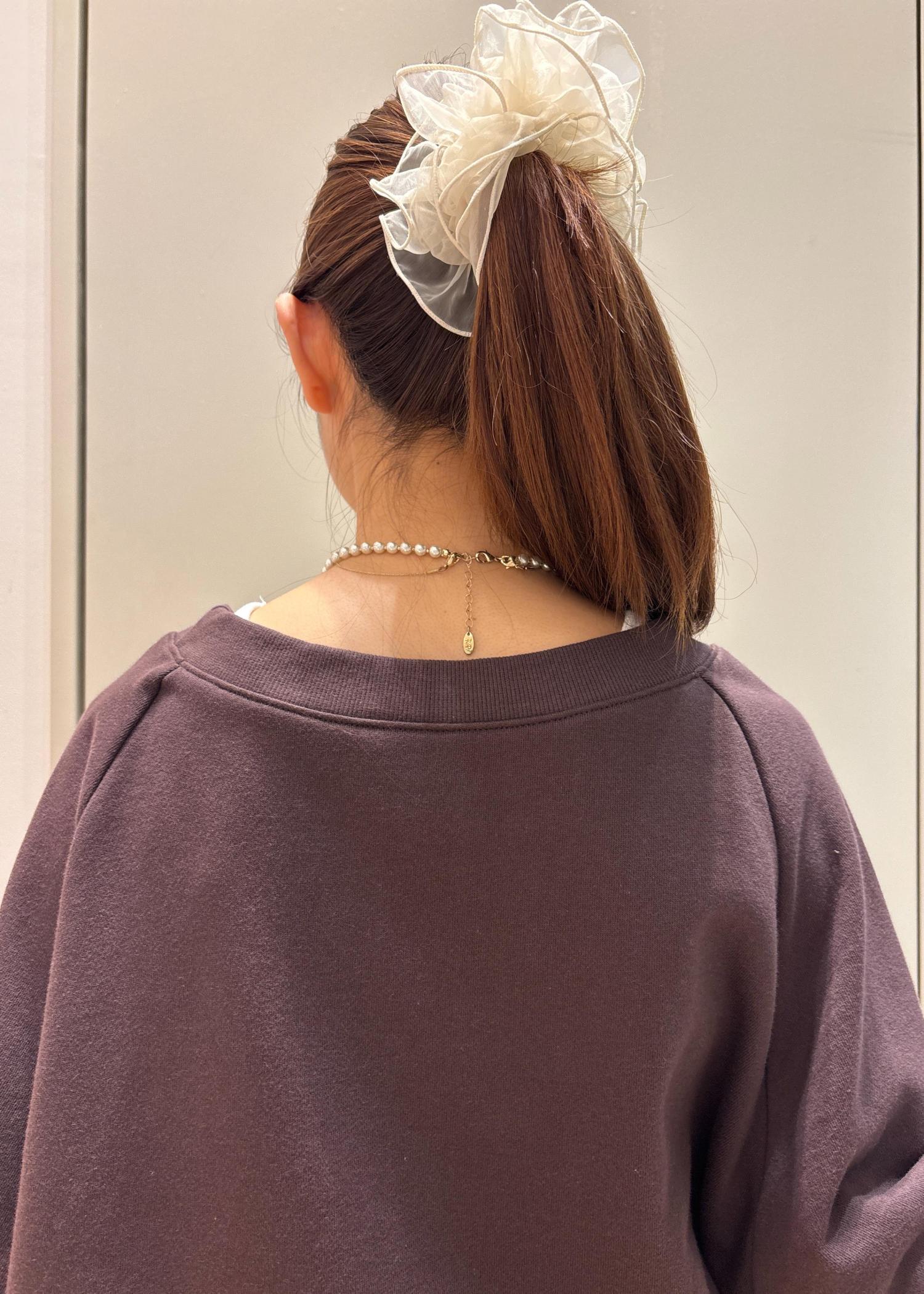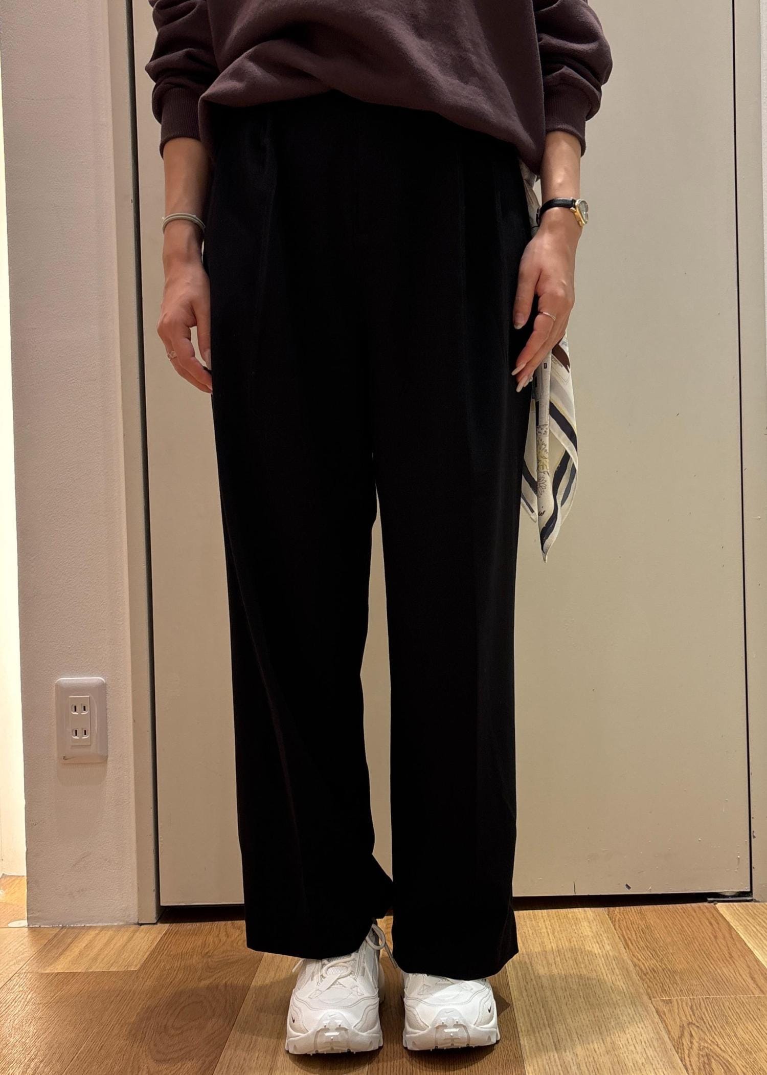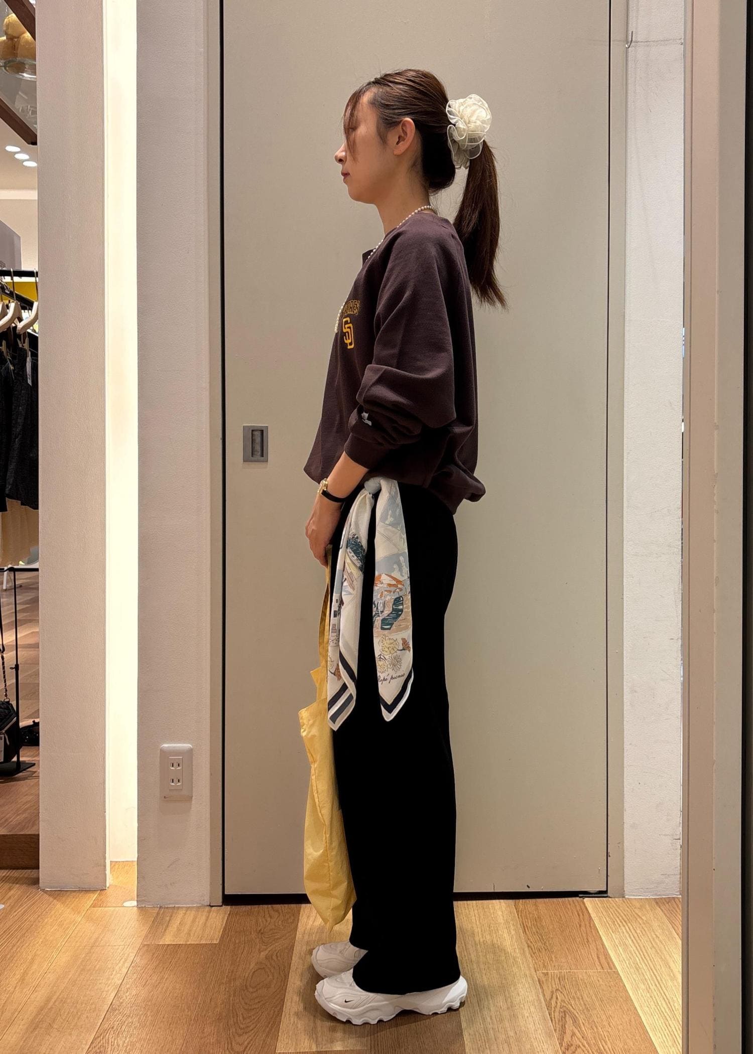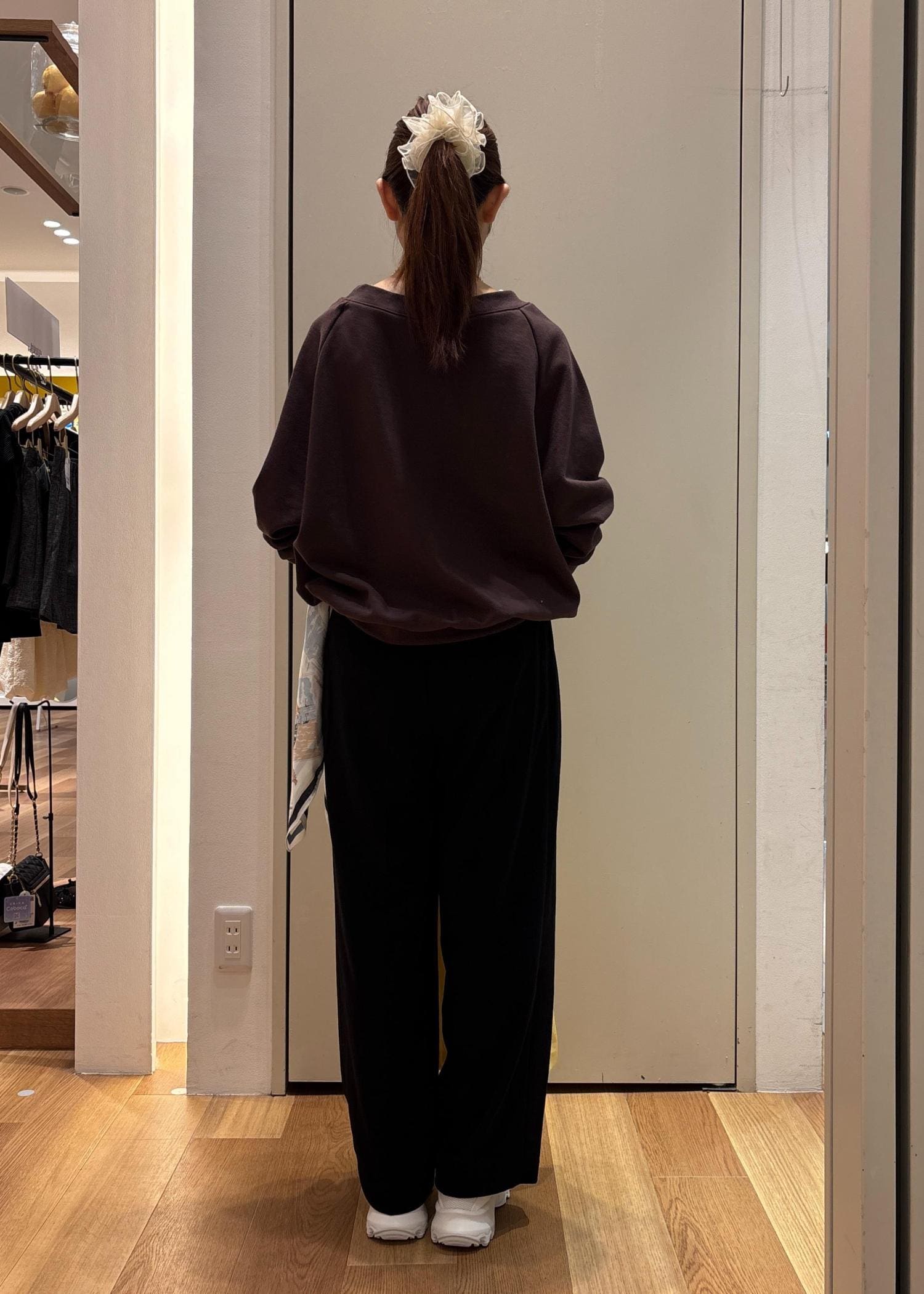 ブラウンのゆったりとしたスウェットに落ち感のあるブラックのパンツを合わせ秋カラーでまとめました。
