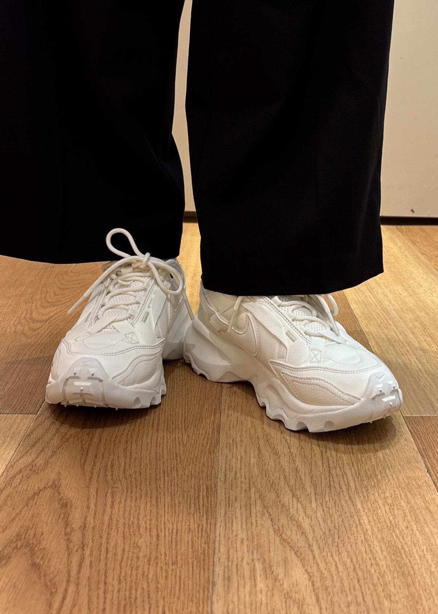 足元はホワイトのボリュームソールのスニーカーでカジュアルテイストにしました。