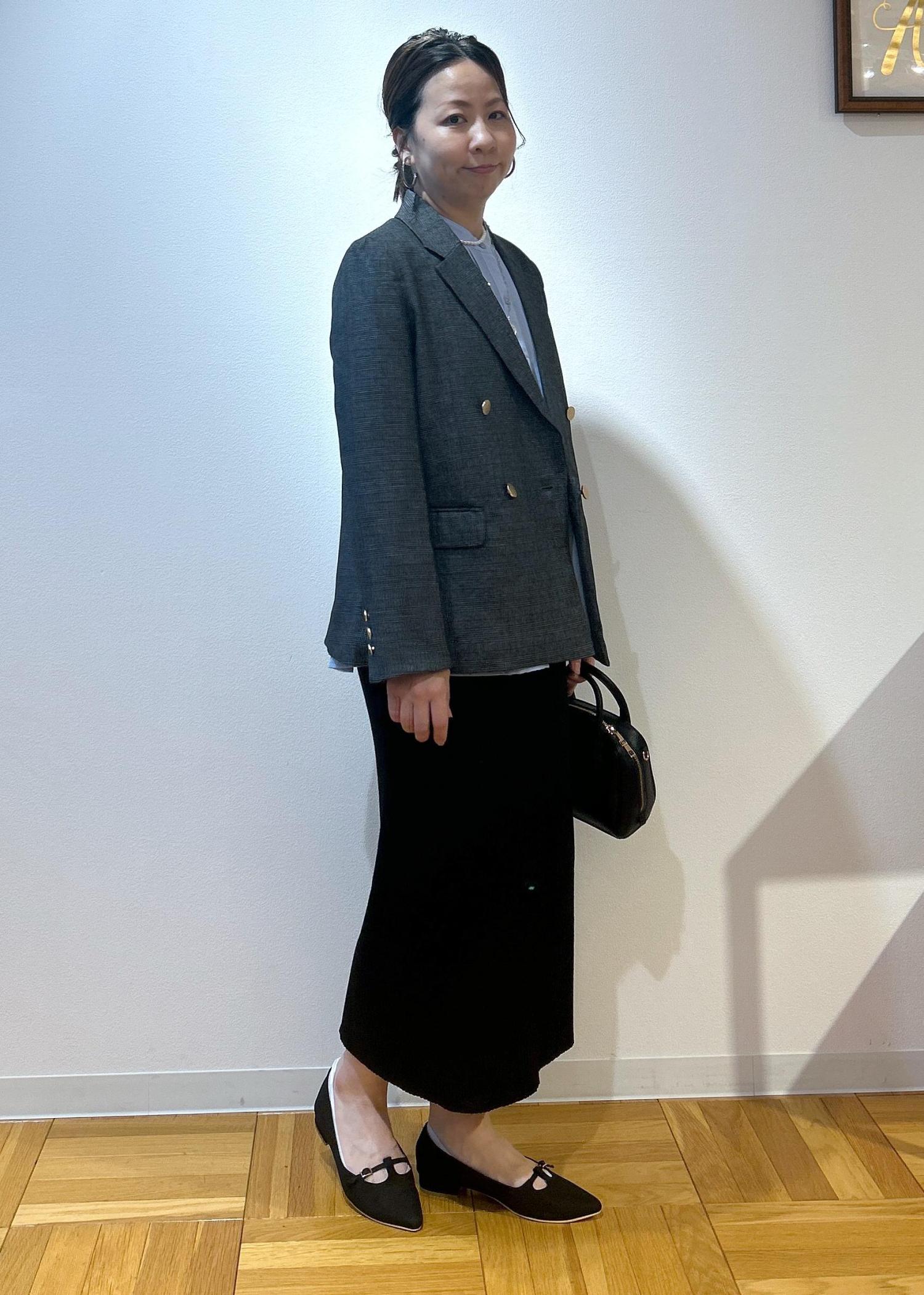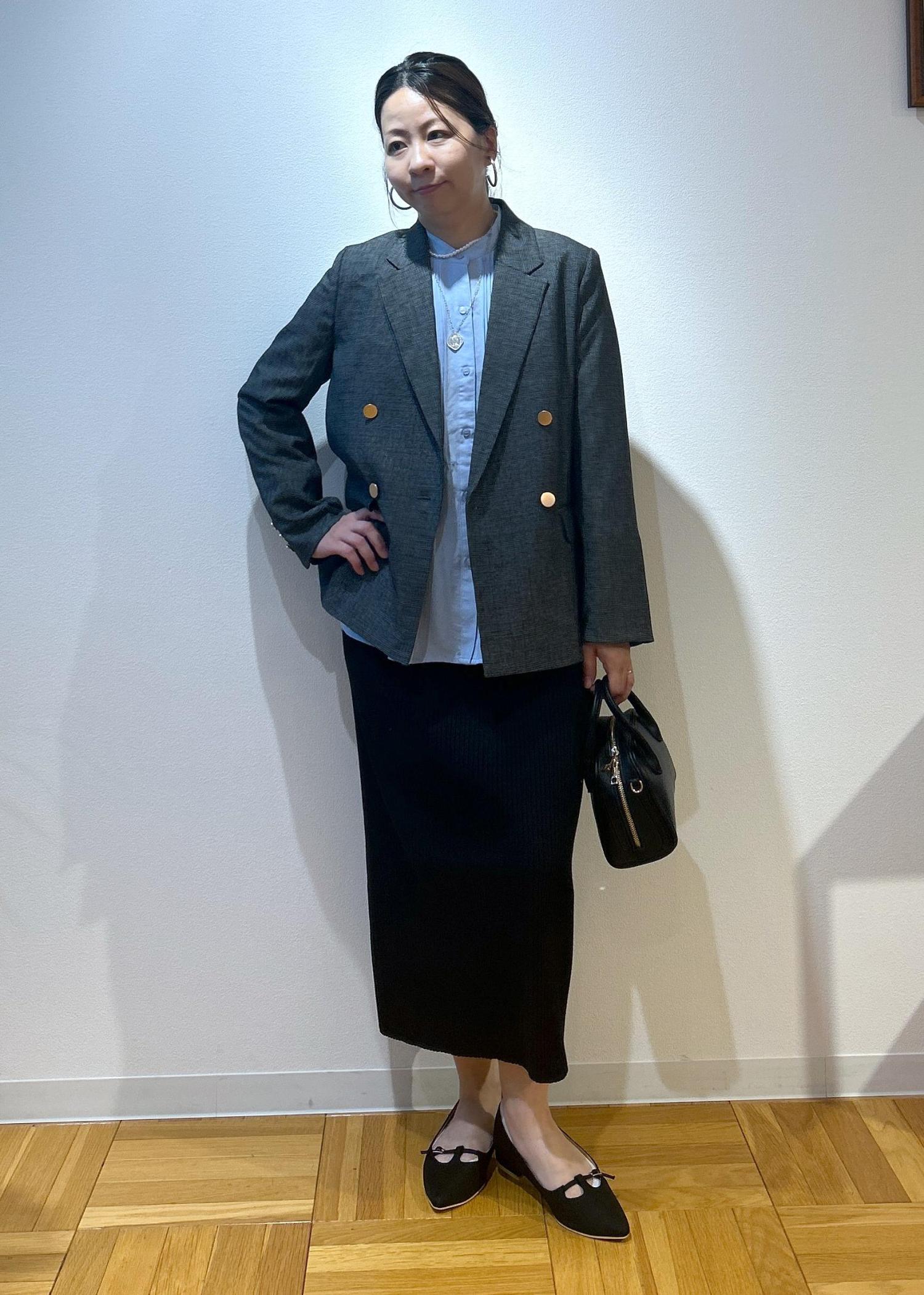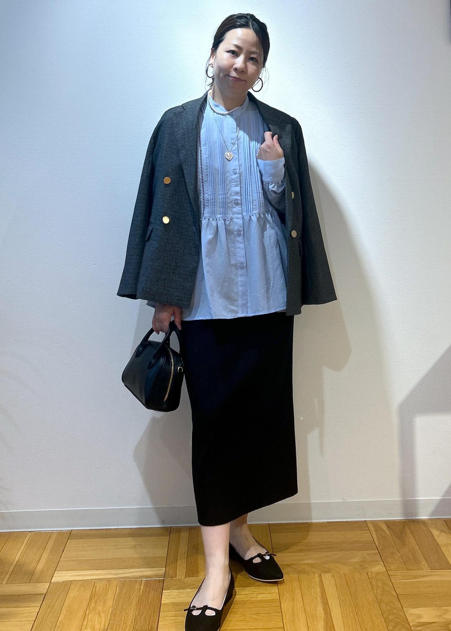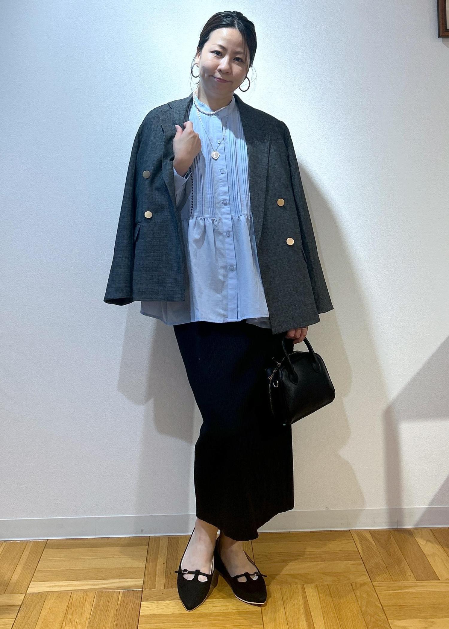 ベーシックカラーなジャケット✖️スカートスタイルにインナーをサックスで組み合わせることで、顔まわりは華やかになりつつも落ち着いた印象にみせてくれるコーディネートにしてみました。