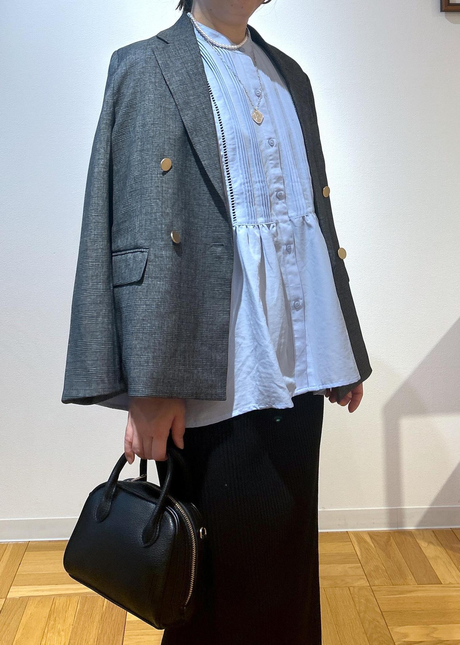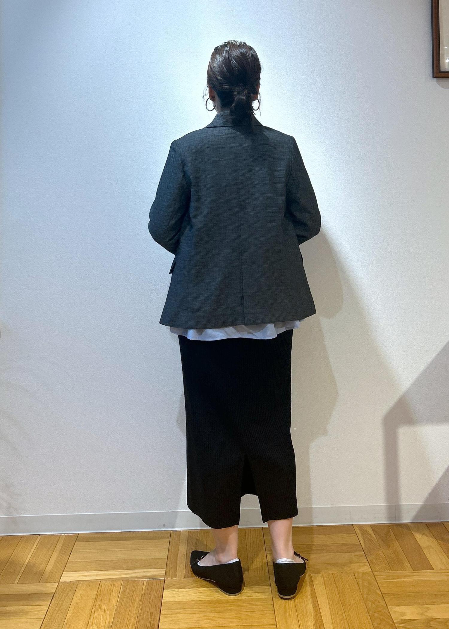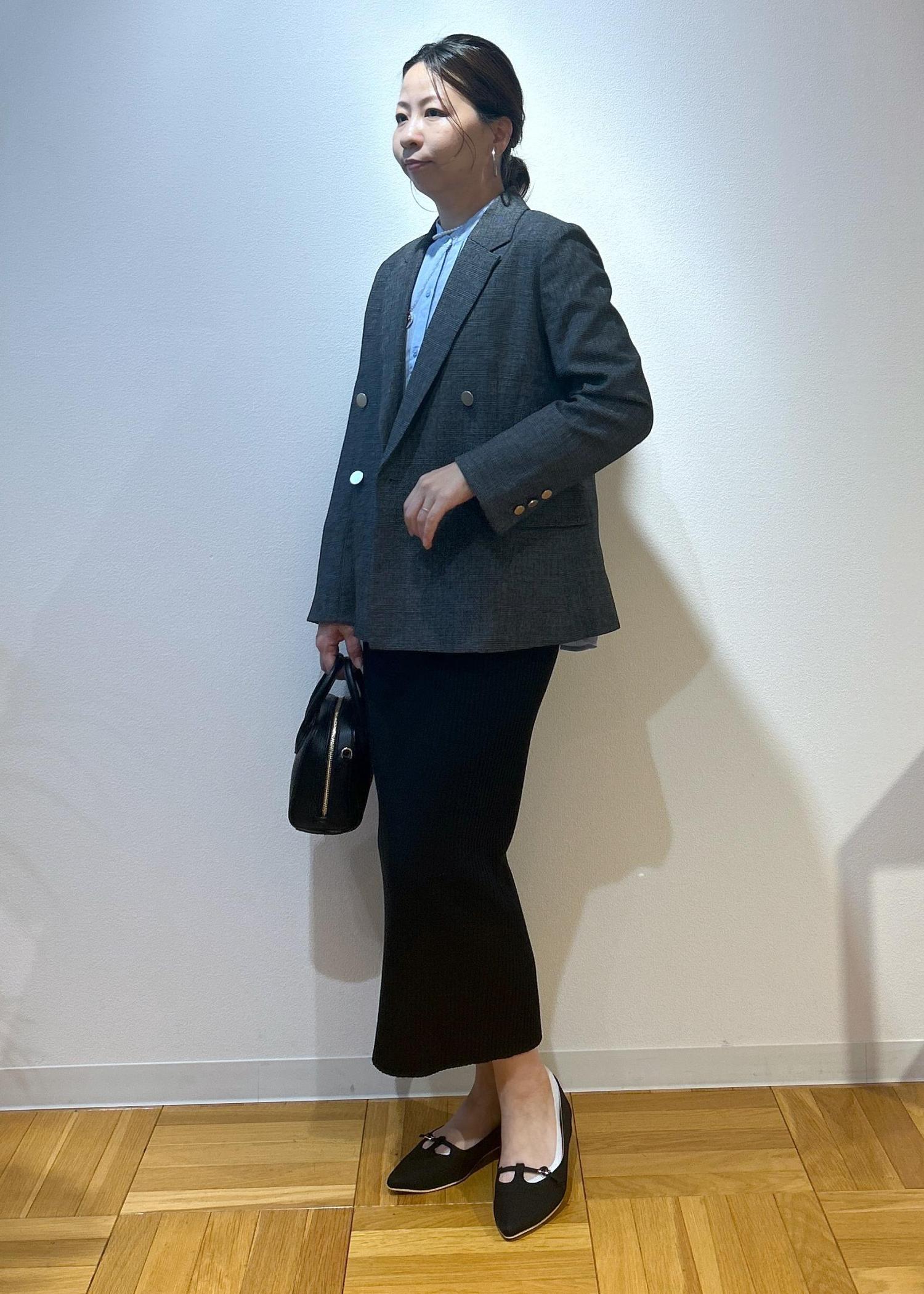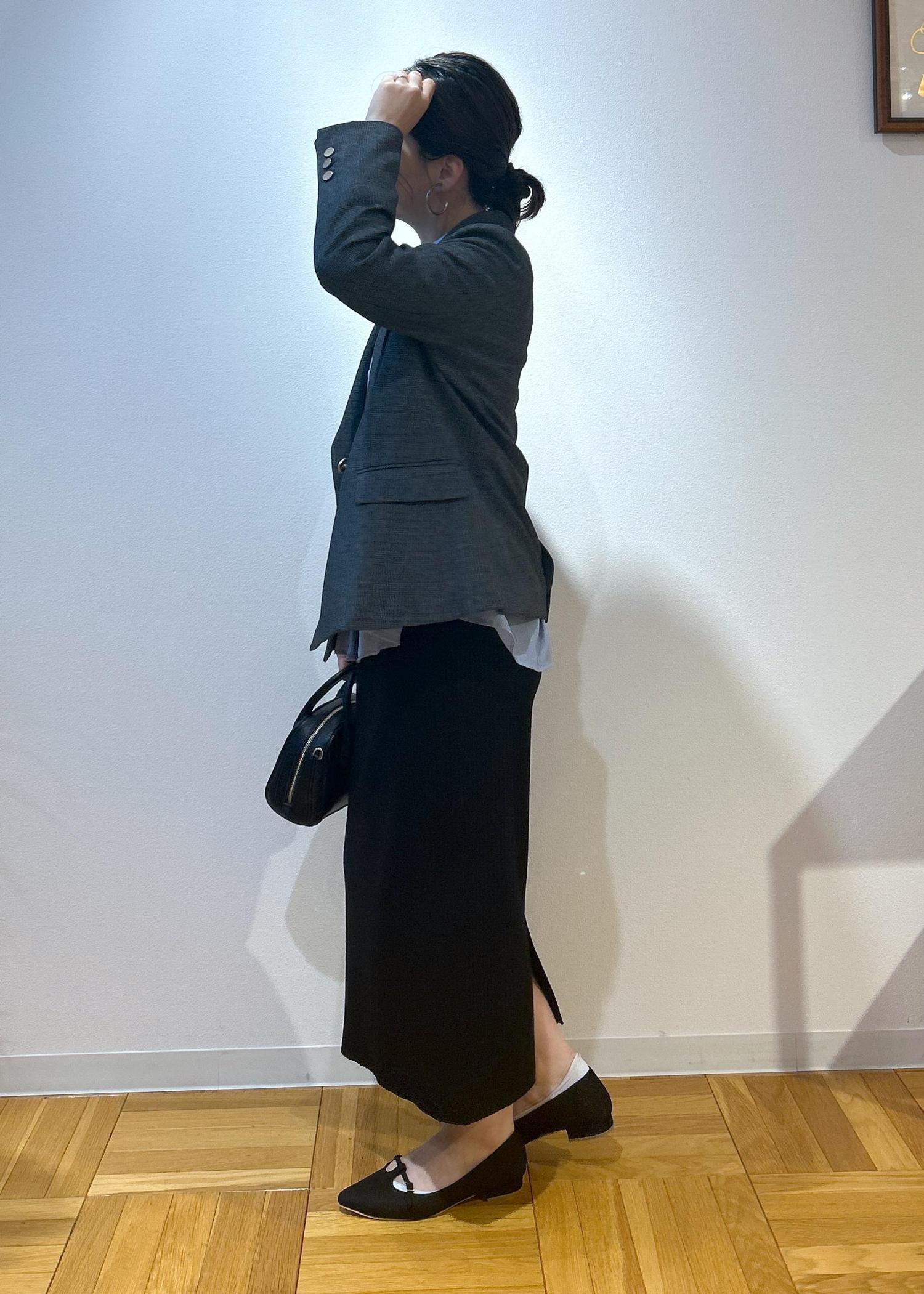 ベーシックカラーなジャケット✖️スカートスタイルにインナーをサックスで組み合わせることで、顔まわりは華やかになりつつも落ち着いた印象にみせてくれるコーディネートにしてみました。