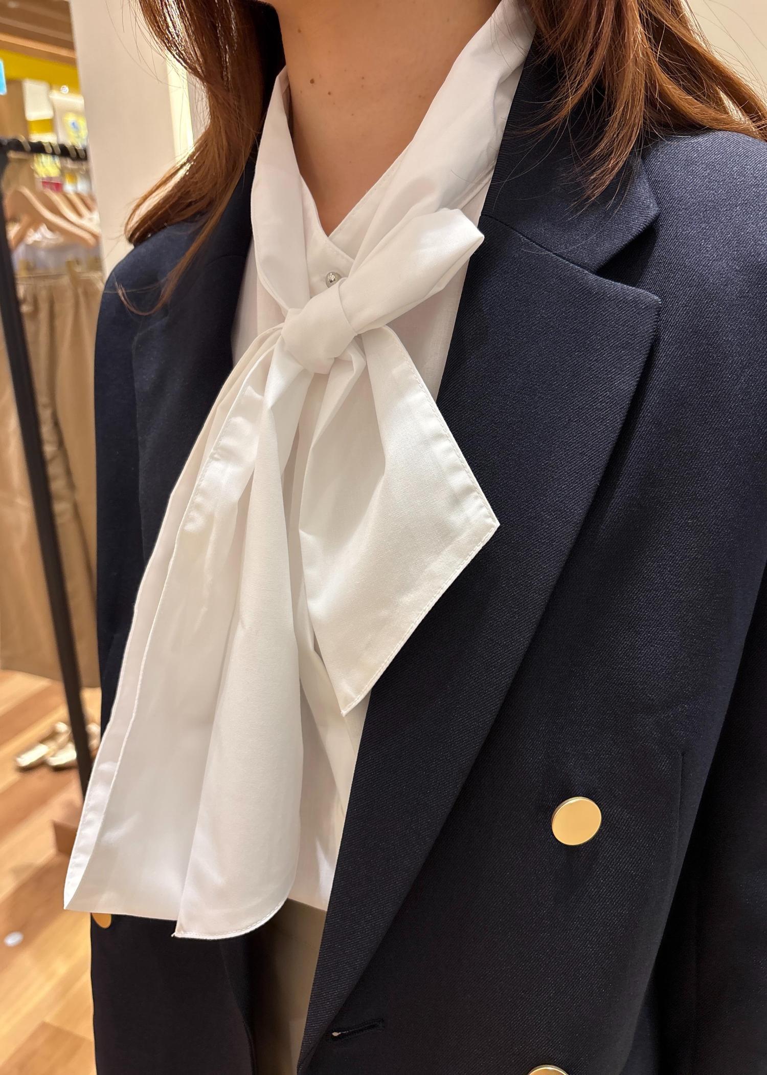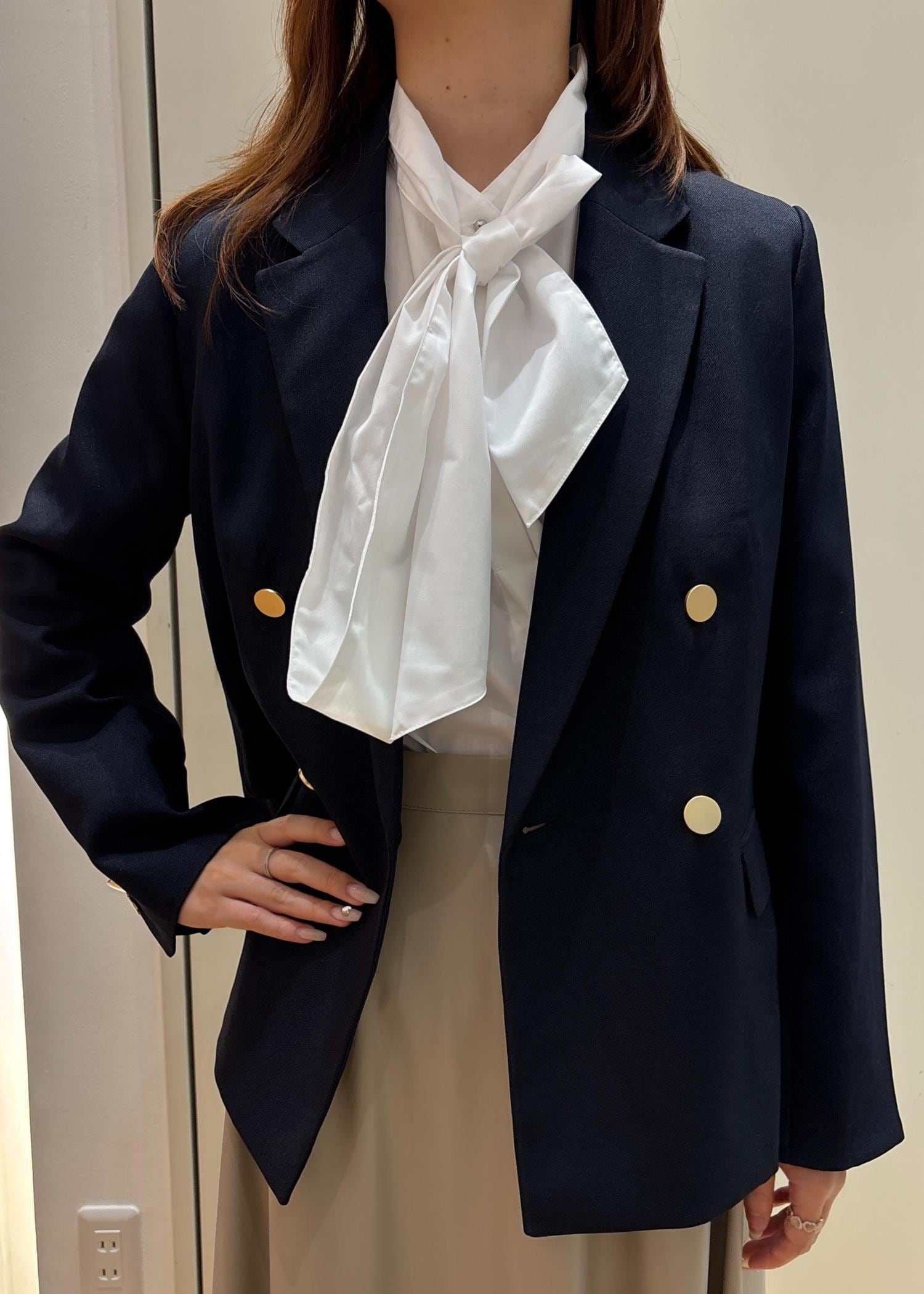 ネイビーのジャケットにベージュのスカートを合わせ秋らしいキレイめカラーでまとめました。