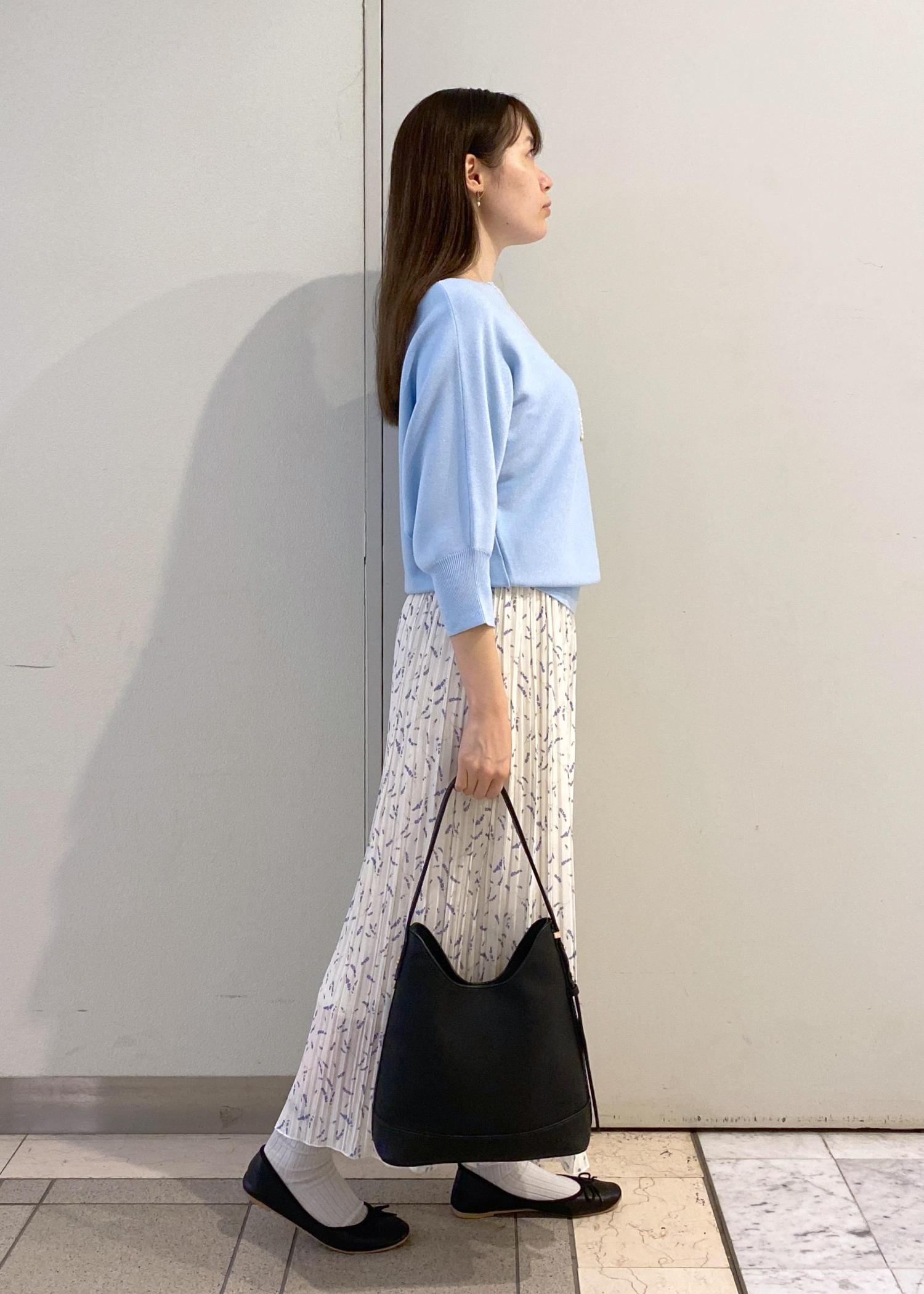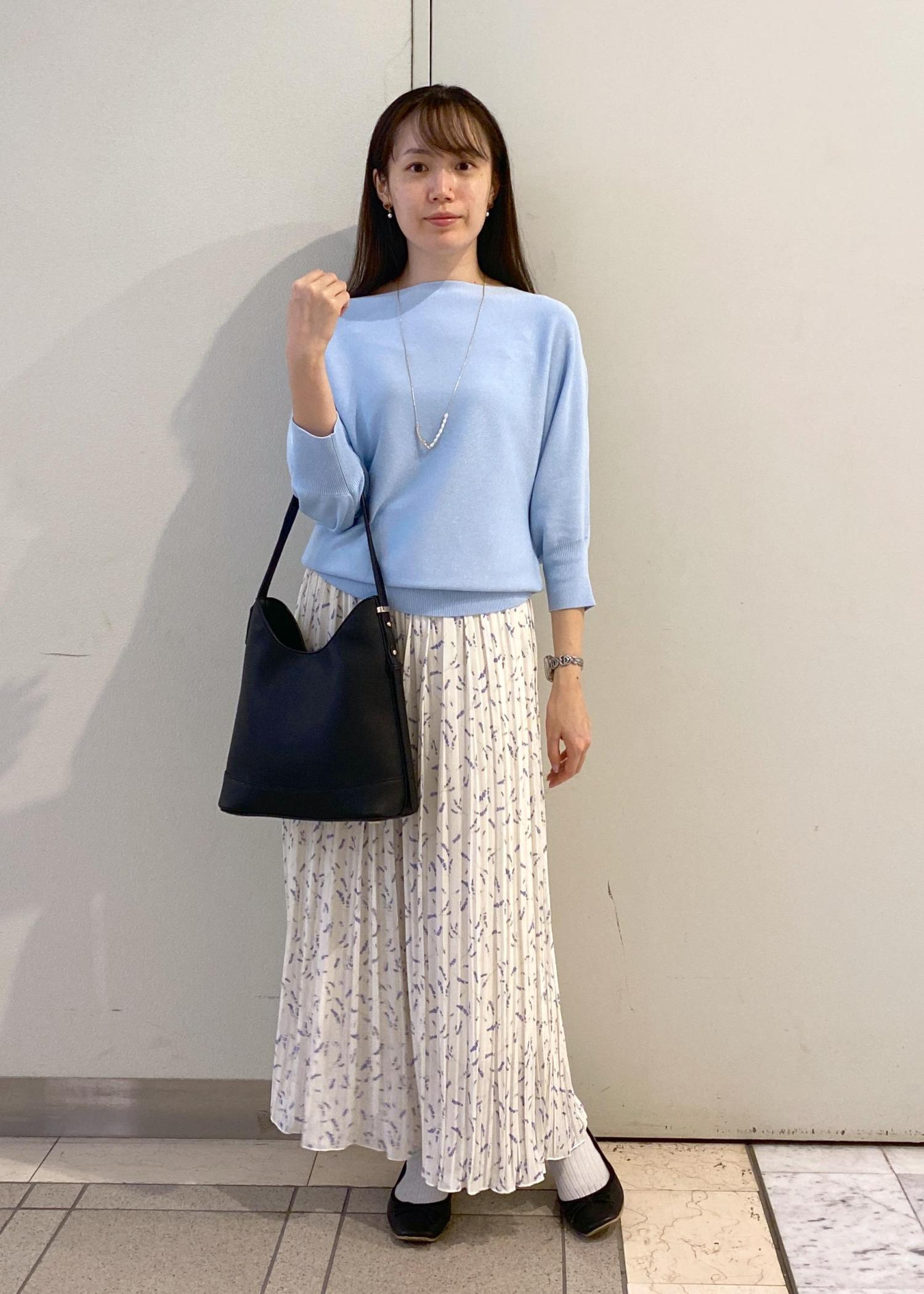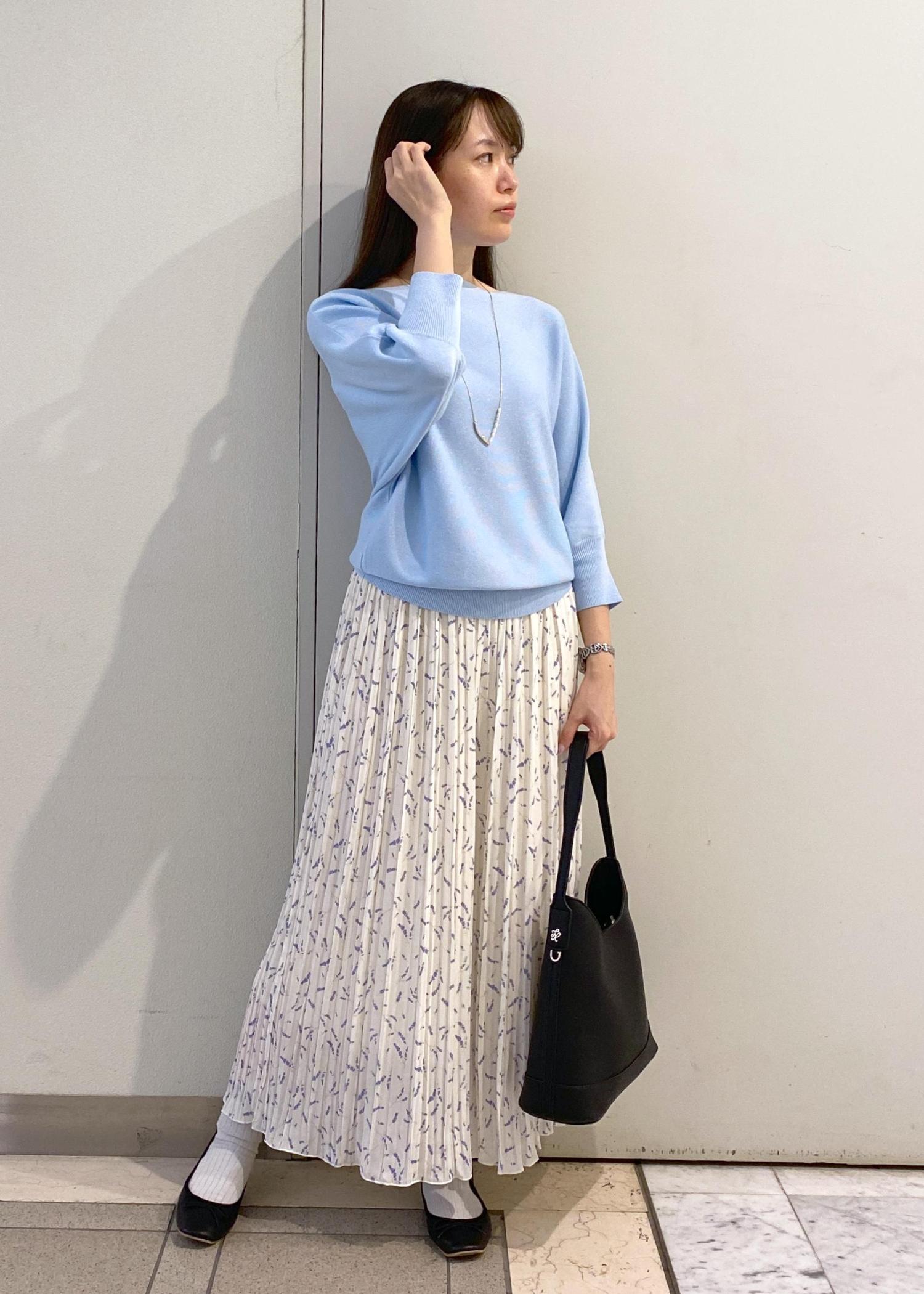 ニットのカラーとパンツの花柄のカラーを同系色で揃えたフェミニンスタイルです。