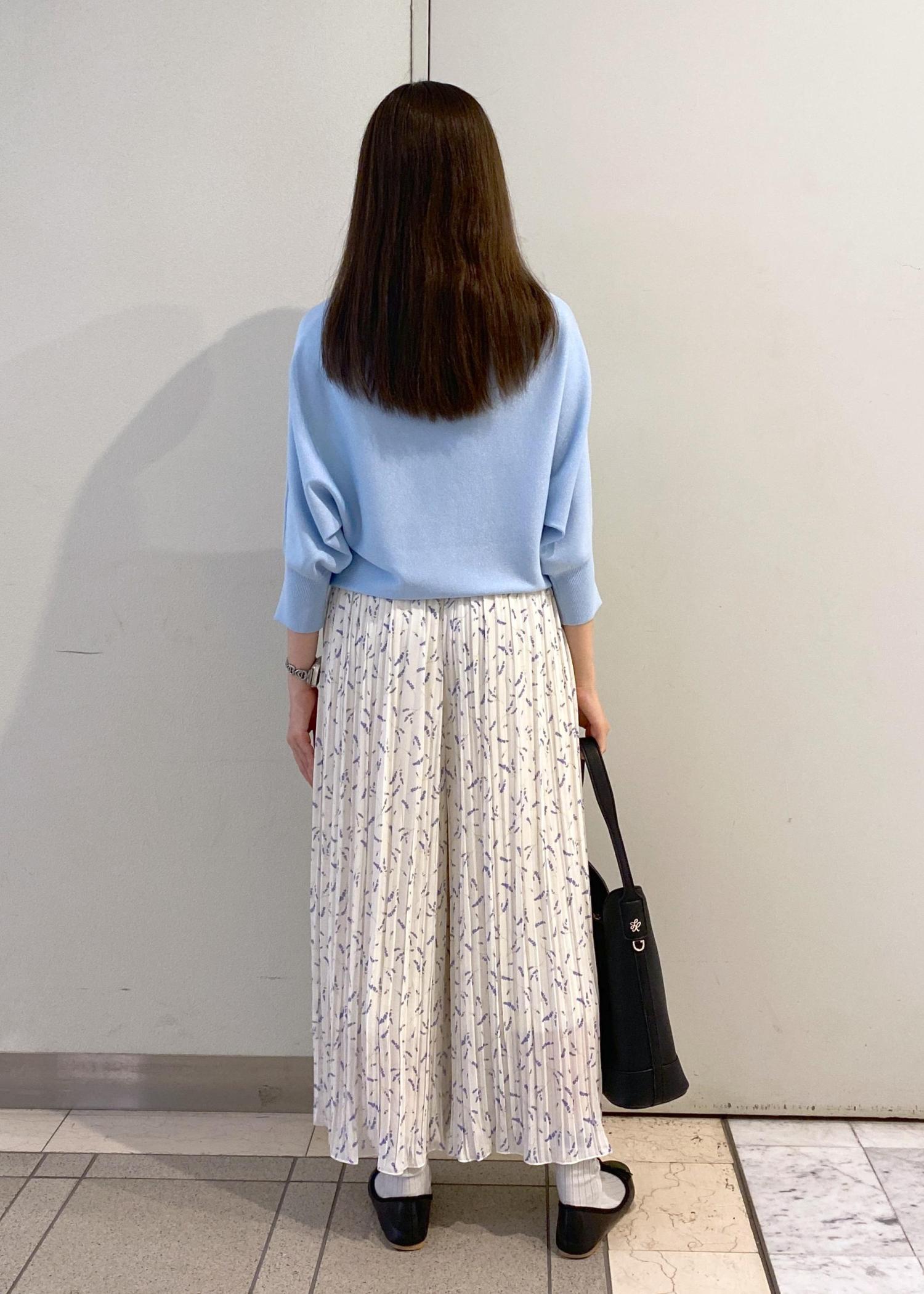 パンツ自体がワイドデザインでプリーツも細かいので、脚のラインを拾いづらく綺麗なシルエットでお召しいただけます。