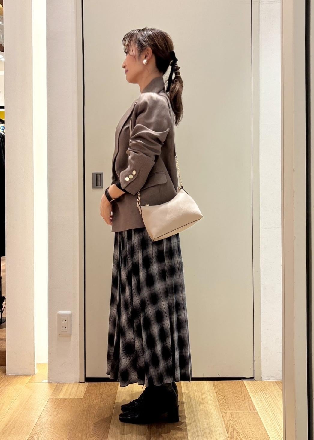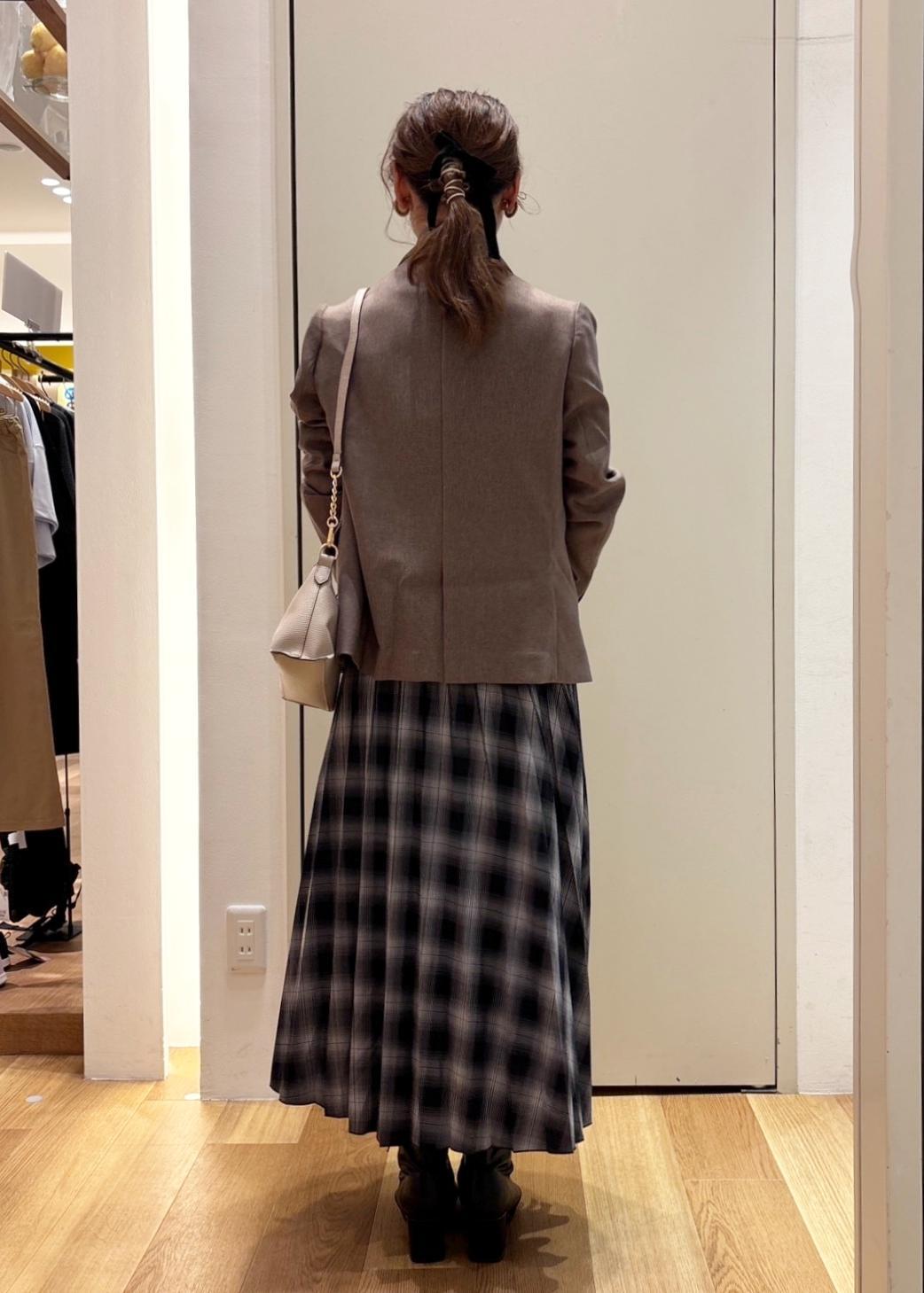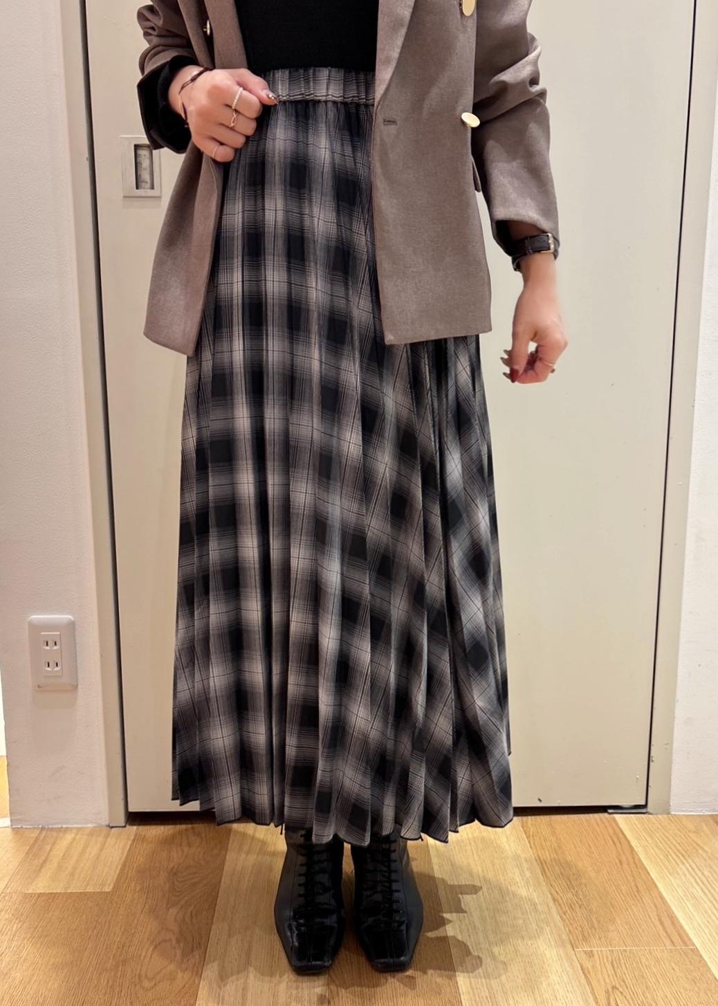秋を感じるチェック柄のスカートは、シアー感があり軽やかな印象です。