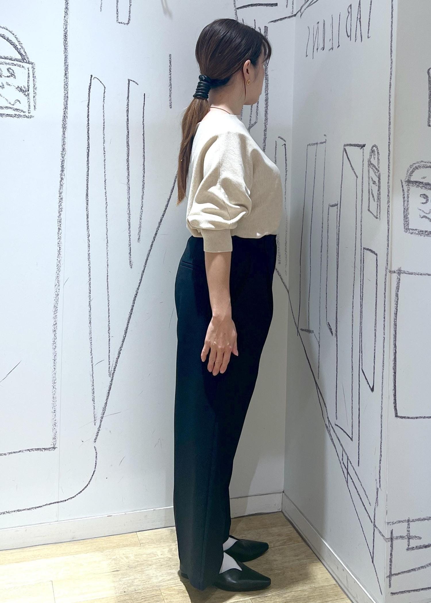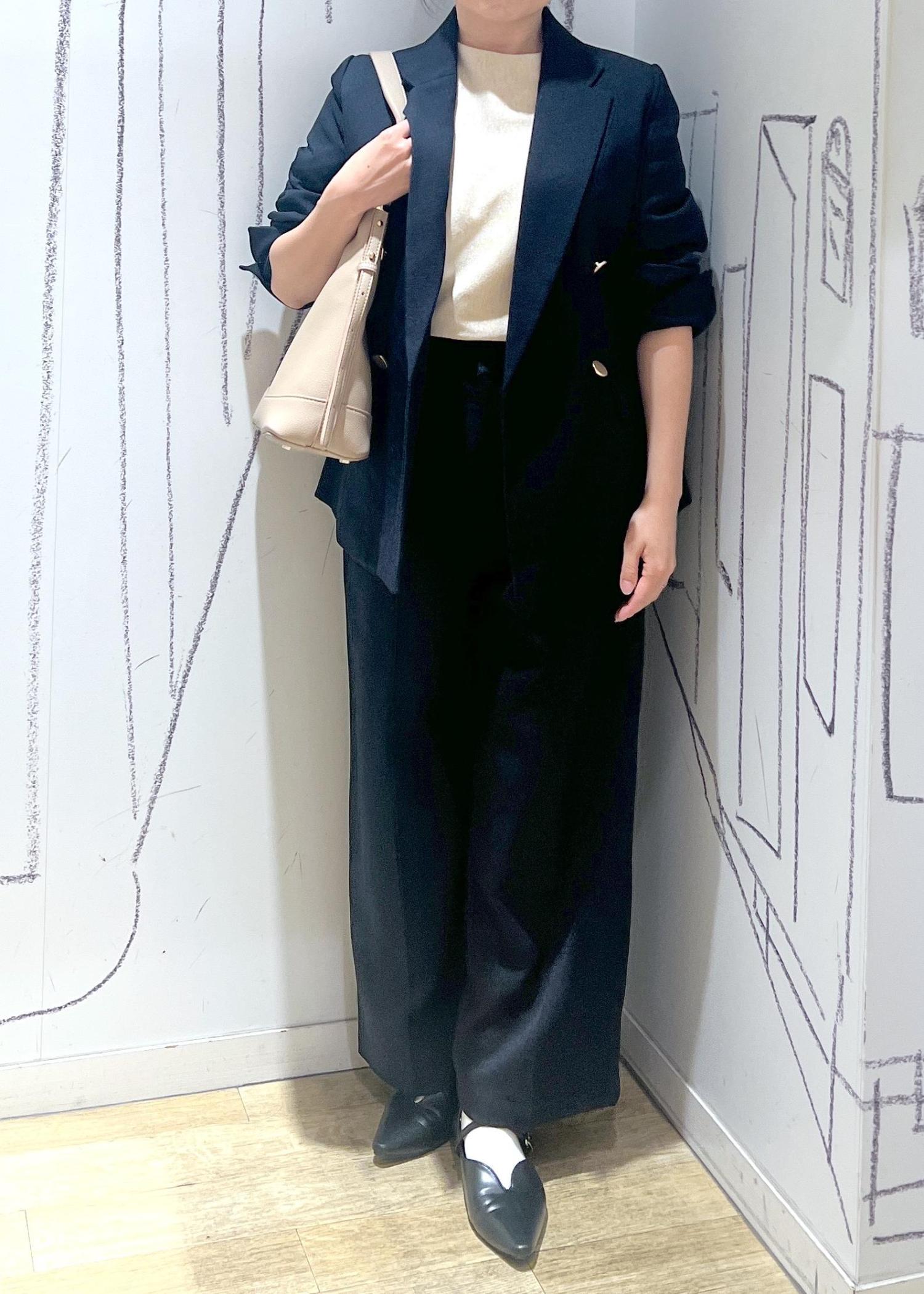 小柄さんセットアップ着用しています。こちらはパンツ小柄さんのSサイズを着用しています。他の画像ではMサイズも着用しているので比べて見て下さい!きちんと感を出したい方はSサイズ。少しカジュアルにも着たい方にはMサイズもオススメです。