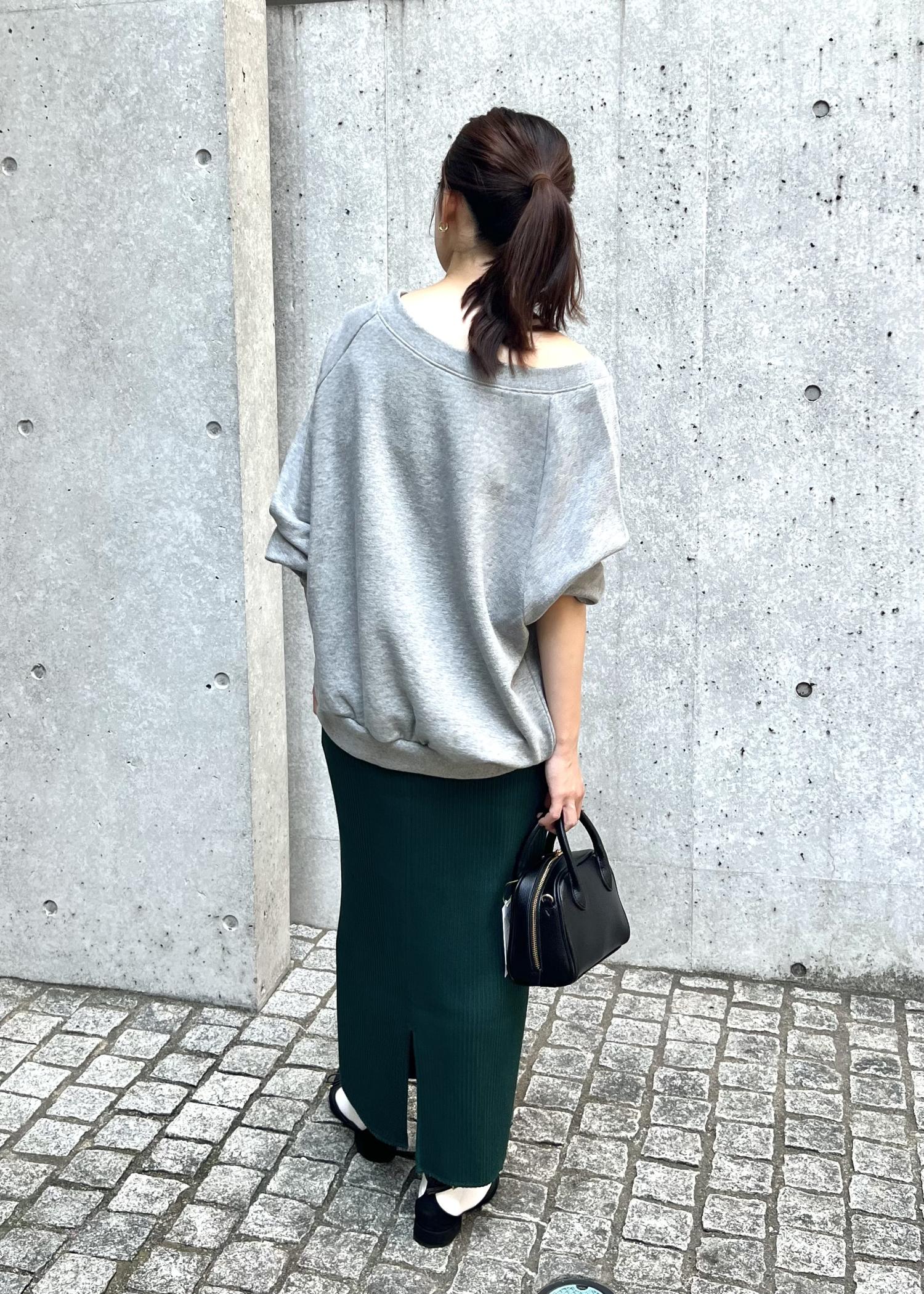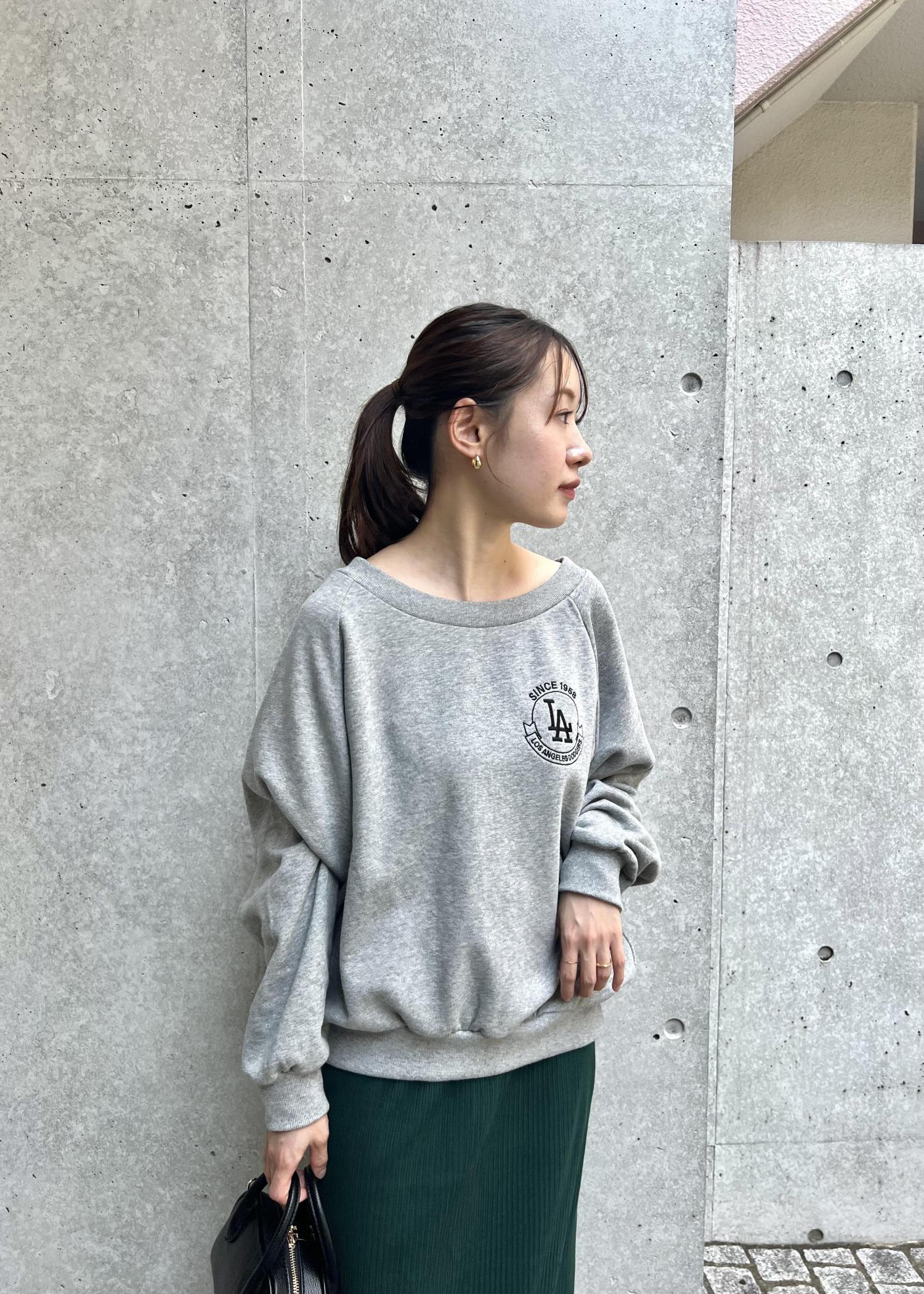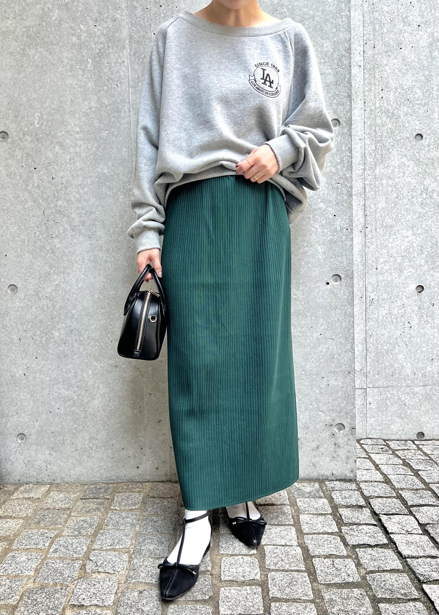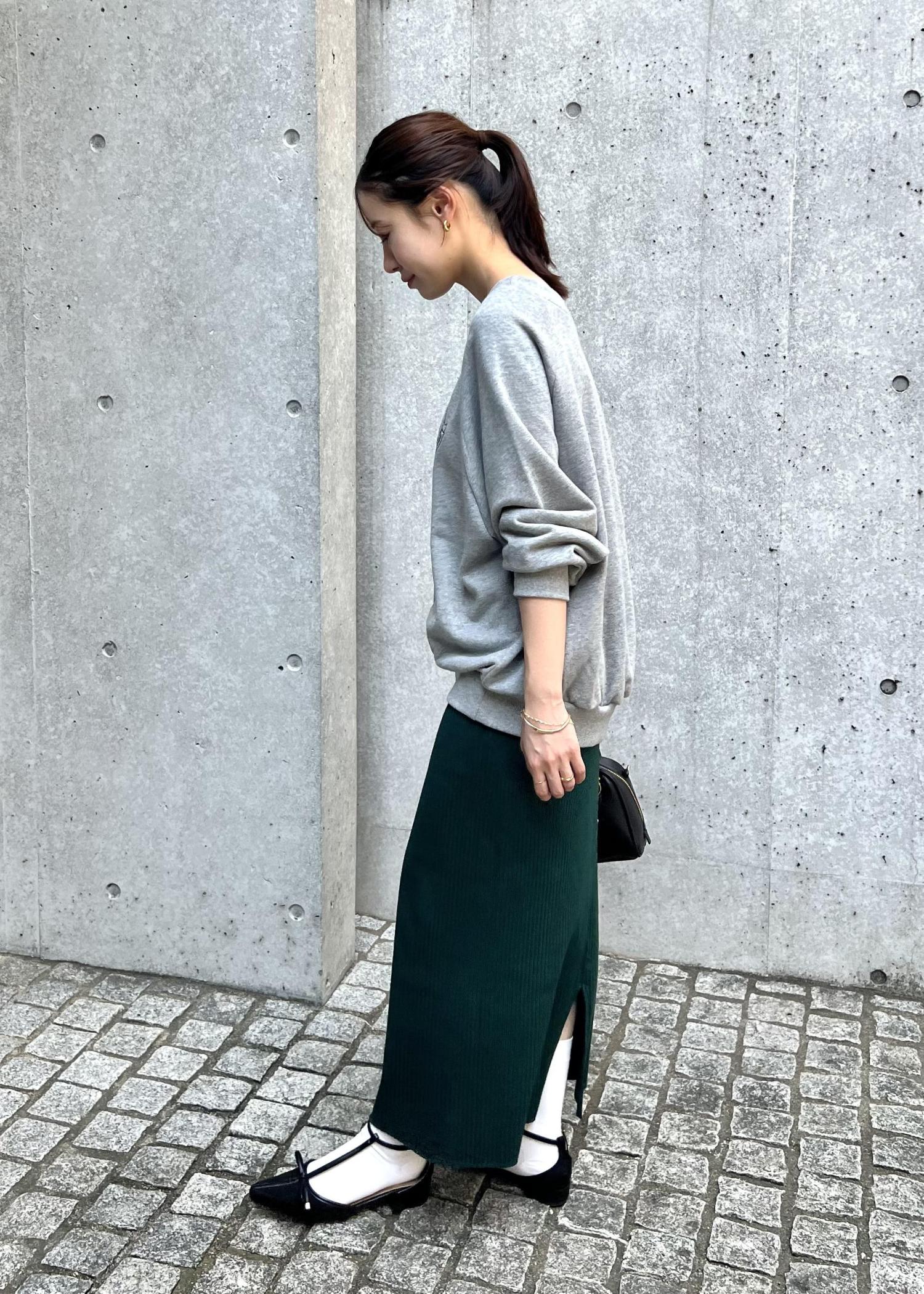 ゆったりしたスウェットトップスをスカートで合わせて、きれいめ見えさせました。